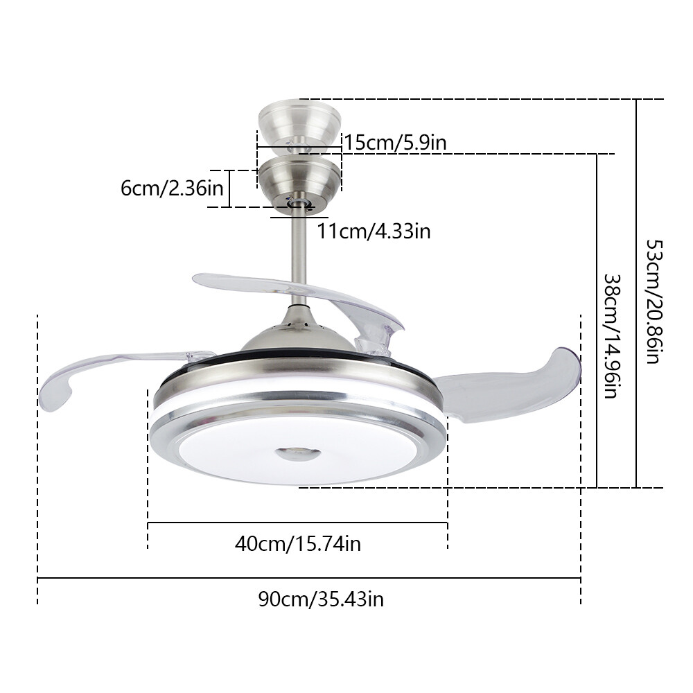 【Remote Control】Integrating turn on light with 3 color changes (white, warm white, neutral white)you can use the remote control to choose the color you like. 【2 in 1 Fandelier】: Retractable ceiling fan and chandelier 2-in-1. The modern design concept provides beauty and convenience for your life. Usually as an ordinary fan, it promotes air circulation very well. When closed, the blade retracts invisibly, leaving only a beautiful led chandelier. 【Ceiling Fan】With ABS blades, It can be used as an electric fan, and it can also be used for lighting 【Applications】Ideal for living room, dining room, foyer, villa, bedroom, restaurant, study room, and other places to decorate lighting fixtures. ❤❤❤Welcome to royalfeatured ❤❤❤ Description This Chandelier-type Ceiling Fan Consists of a Retractable Fan and a 3-Color Light. It Allows You to Enjoy the Coolness and Stay Away from Air Conditioning Disease. Unlike Other Fans, This Product Is Stable and Has Low Noise. the 360-Degree Circulating Airflow Fills the Room and Makes You Feel Cool All the Time. Key Features Remote Control : This Item Is Equipped with Remote Control, so You Don't Have to Stand up to Change the Three Lights, Three Wind Speeds, or Timer Settings at Will. This Will Bring a Lot of Convenience to Your Life. Wide Range: the Item's Lights and Fans Can Serve a Wide-range Area. so Even If Your Room Is Big Enough, You Don't Have to Worry About the Lights Being Too Dim or Not Blowing the Wind. Diverse Functions: with Abs Blades and 2 in 1 Chandelier, This Crystal Ceiling Fan with Light Can Be Used As an Electric Fan and Also for Lighting. It Can Be Multi-purpose and Has Superb Cost Performance. Simple and Generous Appearance : It Has No Complicated Decoration and a Rich Color Scheme. the Overall Feeling of Simplicity and Comfort. Timing Device: This Chandelier-type Ceiling Fan Can Be Timed for 1 Hour, 3 Hours, or 6 Hours with a Single Button. If You Often Forget to Turn off the Power, You Don't Have to Worry About Wasting Power. High-quiet Mode: This Chandelier-type Ceiling Fan Is Equipped with a High-quiet Motor. It Is Made of Electronic Material. Steel and Copper Wire Material to Effectively Avoid Noise. Strong Durability: This Chandelier-type Ceiling Fan Is Made of Copper Wire and Steel Material. It Is More Durable and Long-lasting Compared to Normal Lights and Fans. Quality Service: If You Have Any Questions, Inquiries, or Need Help, Please Feel Free to Contact Us and We Will Try Our Best to Help You. Details Abs Blades: This Material Features High Strength and the Abs Fluid Resistance Is Low, Which Makes a Low Energy Consumption. It Is Beautiful, Thin, Light, and Durable to Use. Fans and Lights in One : This Design Is a Great Space Saver While Highlighting a Sense of Sophistication. Application This Chandelier-type Ceiling Fan Is Ideal for the Living Room, Dining Room, Foyer, Cottage, Bedroom, Dining Room, Study, and Other Places As a Decorative Lighting Fixture. Its Illuminated Area Is About 8-25㎡. Specifications Led Color: 3 Color(White, Warm White, Neutral White ) Power: 36 W Voltage: 110v Diameter:36in /90cm(Blades Unfolded) Long Downrod Length: 9.8" (25 Cm) Short Downrod Length: 3.9" (10 Cm) Total Height: 15" (38cm)/ 21" (53cm) Illuminated Area: 8-25㎡/86.11-269.1ft2 Fan Blade: 4 Leaf Plastic Fan Blade Material: Metal+Abs Fan Motor: High-quiet Motor Color: Chrome Bulb: Led Blades: Acrylic+Metal Electronic Materials: Steel+ Copper Wire Lampshade: Acrylic Package Included 1*Light 1*Rc Control All Accessories for Assembly Notes This Fan Requires Basic Assembly and the Use of a Professional Is Highly Recommended. Floor Height Is Greater than 110 Inches/279.4cm and Ceiling Load Is Greater than 55.12lbs/25kg. Please Allow a Slight Color Difference Due to Shooting Light, and 1-3cm Error Due to Manual Measurement, Please Make Sure You Don't Mind Before Ordering. Payment Delivery details Terms of sales About us Contact us Payment We accept ebay payment 。 Fees such as import duties, taxes are not included in the item price or shipping costs. These charges are the buyer's responsibility. Delivery details Shipping: 2-9 working days to: USA Terms of sales We maintain high standards of excellence and strive for hundred percent customer satisfaction. Feedback is very important to us. We hope that you contact us immediately before you give neutral or negative feedback, so that we can address your concerns. It is impossible to address issues if we do not know about them! About us Your satis faction is our ultimate goal. We work hard to earn your trust and future business. Our certified technicians have tested each item before shipping. The unit comes with 1 year limited warranty on all manufacturing defects. a) If you receive a defective item, you may return it or ask for a discount. Please contact us within 14 days after you receive the package. b) What you returned must be intact and in its original packaging as re? u. Customer is responsible for shipping costs of the returned item. c) We will cover the cost of shipping back t with the shipping rate indicated in the registration page. We will send you a new unit or refund the full payment you paid. Thank you. Contact us Business Hour Business Hour: Monday To Friday: 8:30 AM to 5:00 PM (Beijing China time) Due to time zones, our reply to your questions may not be immediately. But within above working time, we will reply your email within 24 hours. If it's non-workdays, please kindly be patient and wait till Monday. Please contact us with ebay message. Please feel free to contact us if you have any questions. Monday To Friday: 8:30 AM to 5:00 PM (Beijing China time) Due to time zones, our reply to your questions may not be immediately. But within above working time, we will reply your email within 24 hours. If it's non-workdays, please kindly be patient and wait till Monday. Please contact us with ebay message. Please feel free to contact us if you have any questi