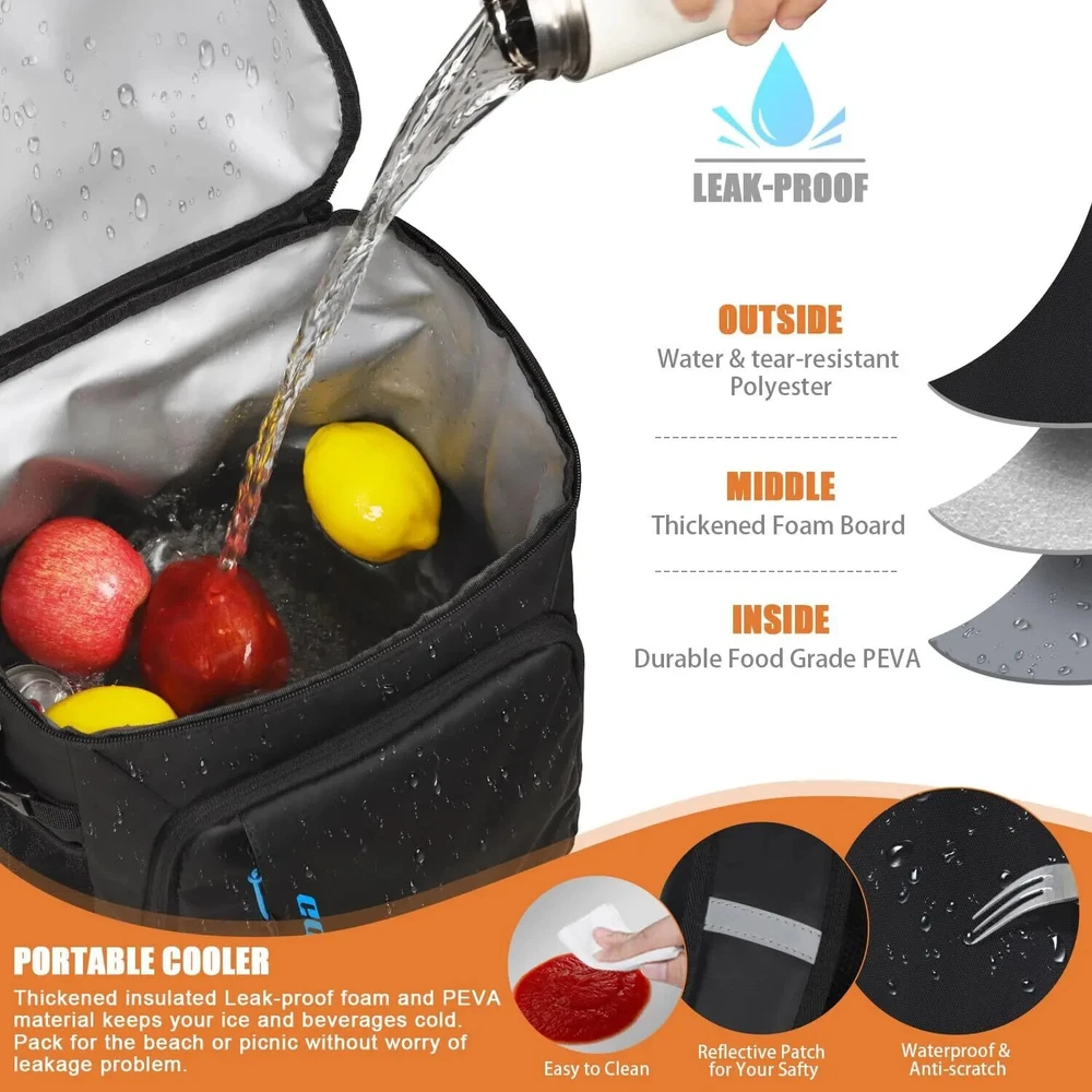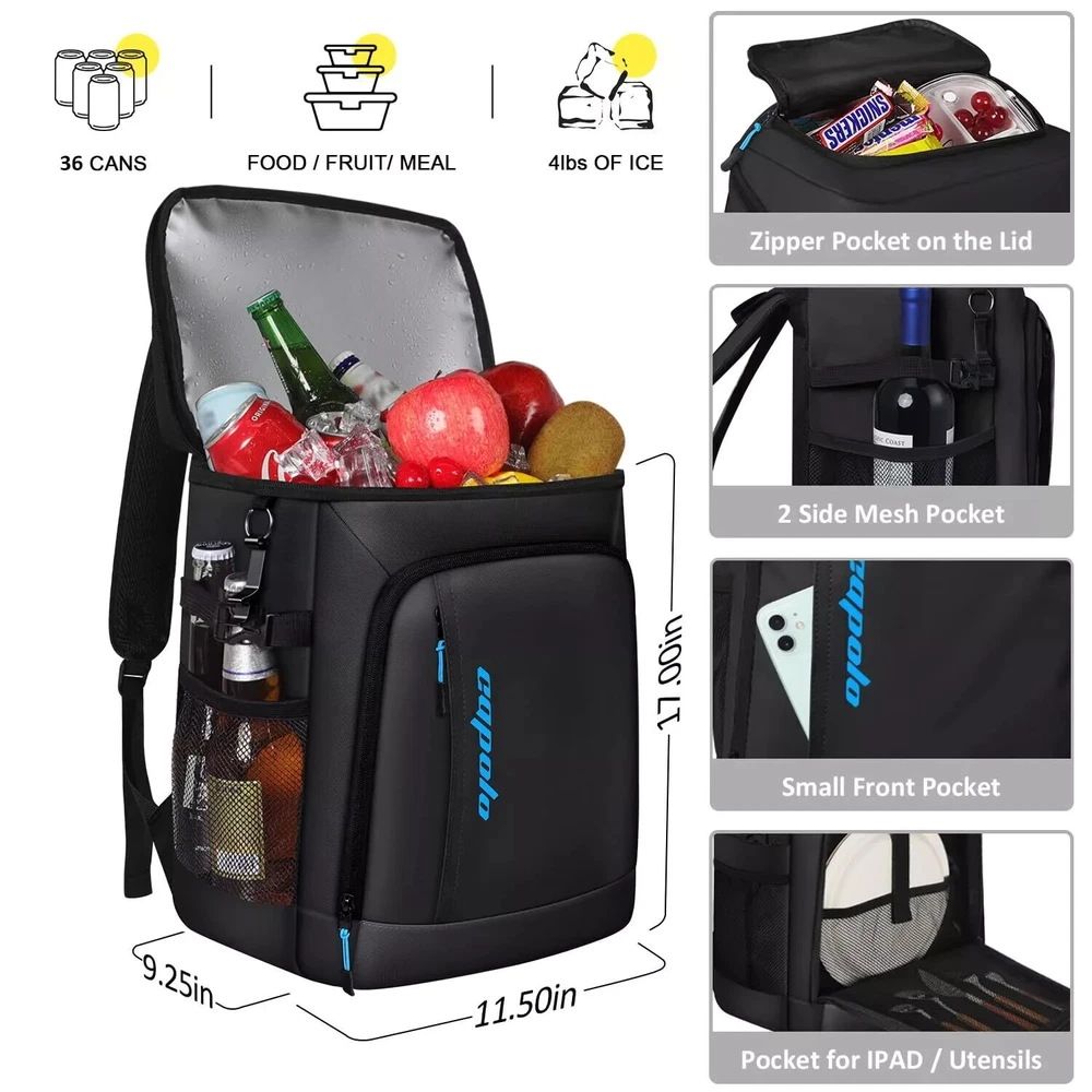 ABOUT THIS ITEM: Upgrade Insulated & Leak-proof & Sweat-Free Material:Upgrade 4 layers(others 3) of material to effectively lock temperature.The inner layer uses a silver PEVA seal and adopts a seamless hot pressing process for leak-proof .210D waterproof wear-resistant lining lowers the risk of tearing or coming apart. Thickened 8mm (others 5mm) foam Insulation helps to prevent heat transfer. Waterproof nylon outer adds abrasion protection. (The zipper isn't leakproof, kindly take care to avoid tipping over) 36 Cans Large Capacity & 4 Compartments: Capolo soft cooler with 4 compartments offers convenient organization options, and helps you keep your item neat and organized, eliminating the need to search the entire bag.36 Cans Main Compartment, perfect for keeping your food and drinks chilled on the go. The top compartment offers a separate dry storage space, ideal for snacks or personal items. Plus, 2 additional pockets with 2 mesh slots for utensils, napkins, or any small travel essentials. Lightweight & Ergonomic Design: Tailored with adjustable shoulder straps and thickened 10mm back foam(others 8MM), it offers personalized support, ensuring your load is evenly distributed for maximum comfort during any adventure. The generous foam thickness is a barrier, blocking cold air from contacting your back and further enhancing your comfort. Bid farewell to cumbersome traditional soft coolers, upgrade your journey experience today, and invest in a Capolo cooler bag! Experience Unmatched Convenience and Detail: The Capolo beach cooler bag stands out with its meticulously crafted details. Adjustable side buckle designed to hold tall bottles adjusts for optimal bag shape retention and serves as a makeshift handle for easy two-person carry. We provide an opener ensuring you can enjoy your favorite beverages hassle-free anytime. Reflective strips on the shoulder straps increase visibility during low-light conditions, ensuring your adventures are safe at any hour. Water-resistant Outer: Water-resistant Outer to protect your items from raindrops, sweat, and moisture, Be well suited as a backpack lunchbox, travel cooler, camping cooler, insulated backpack, etc.