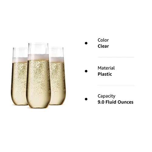 Add Elegant to your party with the PLASTIC STEMLESS CHAMPAGNE GLASSES The fancy toast champagne flute is perfect for catered events, parties, bars, nightclubs or any other event where you require an economical alternative to permanent glassware. This disposable cocktail glasses are made of durable clear hard plastic. The Clear Plastic Flute are Elegant and practical, Premium Plastic Disposable Cups a must-have for the frequent party hostess! use it for wine cups, champagne cups, mimosa cups, or water cup. ideal for bridal shower, bachelorette engagement parties, weddings, sophisticated events and New Year's Eve parties. PLEASE NOTE:The Stemless Flutes are not dishwasher safe Add elegant to your party with the Stemless Clear Plastic Champagne Glass Flute Ideal for catered events, parties, bars, nightclubs or any other event Perfect for Mimosas, Bloody Mary's, Wine Glasses, Sodas, Cocktail Cups, Parfaits, Sundaes and Other Desserts 9oz Shatterproof Wedding champagne flutes Made of durable premium hard recyclable plastic, BPA-Free, Not dishwasher safe!. Bulk Pack of 36 disposable champagne flutes plastic stemware save you time and energy