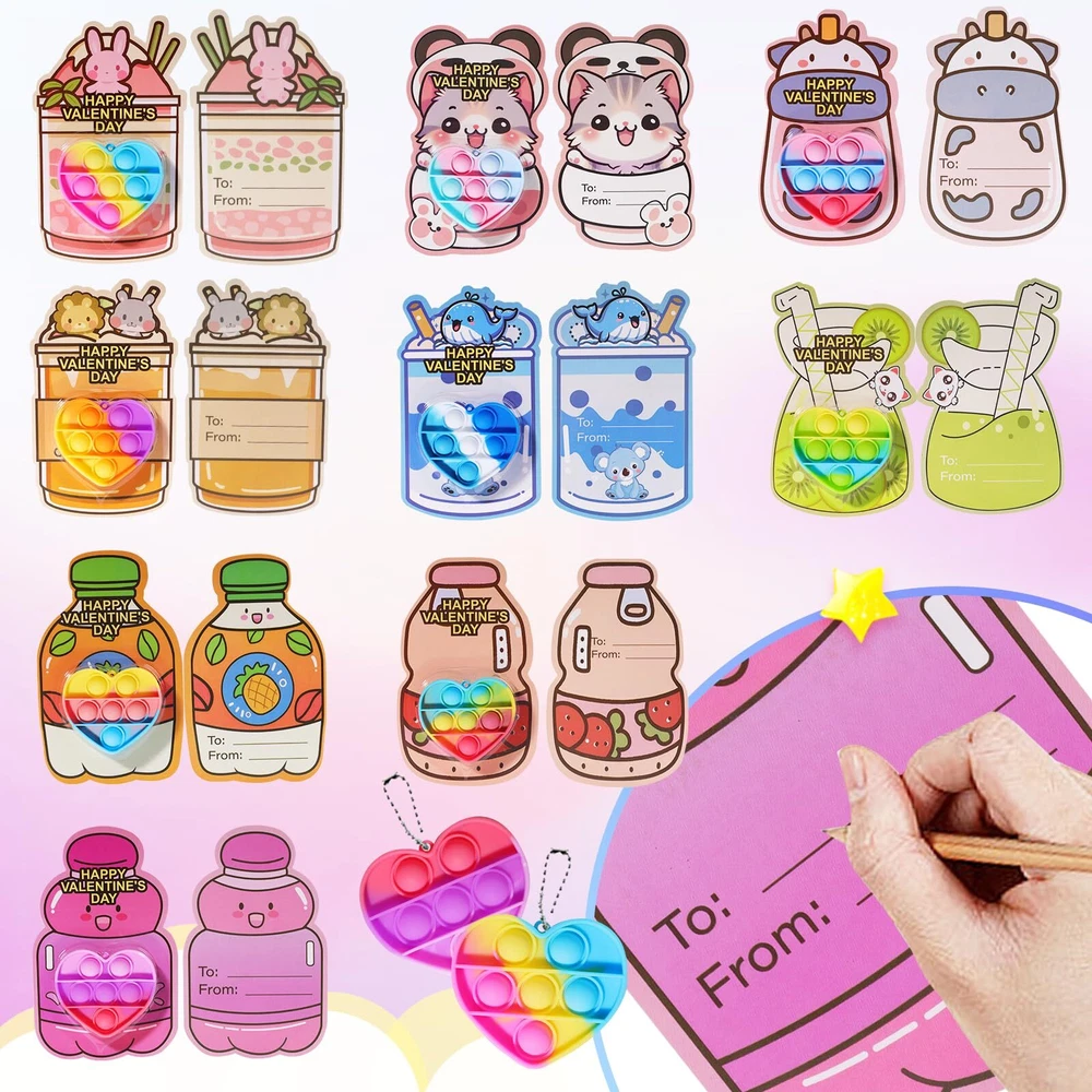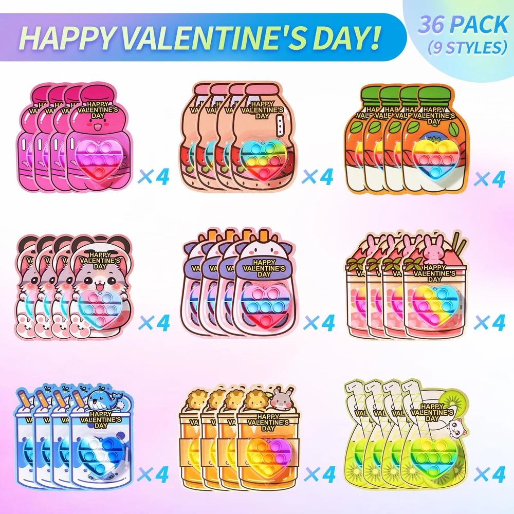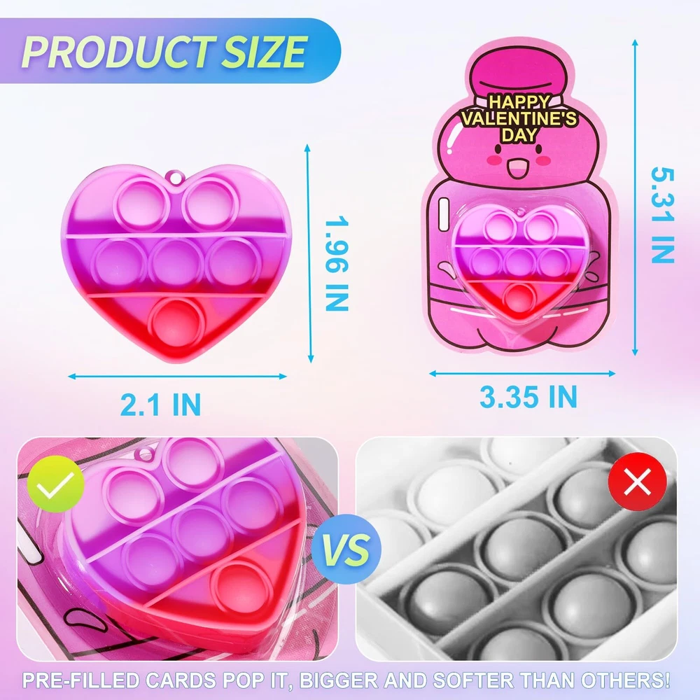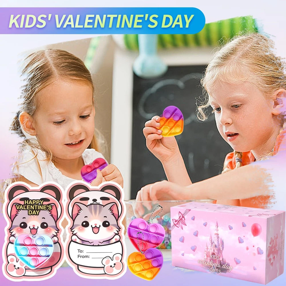 36 Pack Valentines Day Gifts for Kids, Prefilled Valentines Party Favors, Valentines Heart Pop It Toys, Bulk Valentines Day Cards for Kids School Class Exchange Gifts Boys Girls 36PACK VALENTINES DAY GIFTS FOR KIDS: This Valentine's Day gift set contains 36 heart shaped pop it keychains, and 36 cards. The colorful pop it keychains will hold your kid's attention. SAFE & HIGH-QUALITY MATERIALS: Each product is nationally CPC safety certified to ensure compliance with U.S. child safety standards.nsure a safe and joyful Valentine's Day experience for both you and your kids. PRE-FILLED VALENTINE CARDS: All 36 valentine cards keychains are designed with pre-filled cards, which not only solves your hassle of picking out cards for your kids, but also saves you time in preparing Valentine's Day gifts. "FROM" & "TO" PERSONALIZED DESIGNS: Kids can write their names on the “FROM” & “TO” part of the card. The personalized design allows children to experience the fun of holiday interaction and greatly enhances their holiday engagement. VALENTINES DAY PARTY FAVORS: Ideal for Valentine's Day classroom gift exchanges, elementary school parties, school Valentine's Day events, and Valentines party favors, these sets will add fun and creativity to any occasion.