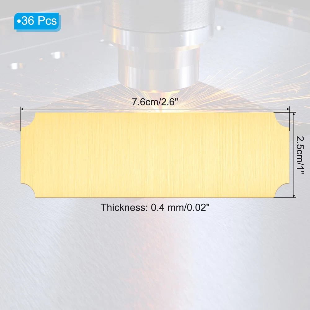 Document Our engraved nameplates are perfect for mounting on plaques, picture frames, sweaters, trophies, bags, display boxes, flag cases, and anything else.SpecificationMaterial: Stainless SteelColor: Gold ToneSize: 7.6 x 2.5 cm/3 x 1 Inch(L*W)Thickness: 0.4 mm/0.02 InchPacking List: 36 Pcs x Engraved NameplateAdvantageOur engraved nameplates are made of brushed stainless steel which is durable, stable, not easy to fade, rust, or break, and can be used for a long time. With a smooth surface, it will not scratch your skin.The right thickness makes the plate stronger and allows for deeper engraving. These elegant nameplates have a beautiful luster and a simple design. Suitable for various crafts to add brilliance.The protective film design can effectively prevent scratches. The adhesive backing design allows you to stick this nameplate anywhere without any tools and it can be firmly on the objects.InstructionPlace a metal workbench block underneath the blank stamping tags for better stamping.NOTE:1. There may be light scratches and blemishes due to shipping, but they can be polished.2. Only for laser engraving, not suitable for mechanical engraving.3. Please remove the protective film before use. 36 Pcs 3" x 1" Engraved Name Plate Picture Frame Label Art Tag, Gold Tone Our engraved nameplates are perfect for mounting on plaques, picture frames, sweaters, trophies, bags, display boxes, flag cases, and anything else. Specification Material: Stainless Steel Color: Gold Tone Size: 7.6 x 2.5 cm/3 x 1 Inch(L*W) Thickness: 0.4 mm/0.02 Inch Packing List: 36 Pcs x Engraved Nameplate Advantage Our engraved nameplates are made of brushed stainless steel which is durable, stable, not easy to fade, rust, or break, and can be used for a long time. With a smooth surface, it will not scratch your skin. The right thickness makes the plate stronger and allows for deeper engraving. These elegant nameplates have a beautiful luster and a simple design. Suitable for various crafts to add brilliance. The protective film design can effectively prevent scratches. The adhesive backing design allows you to stick this nameplate anywhere without any tools and it can be firmly on the objects. Instruction Place a metal workbench block underneath the blank stamping tags for better stamping. NOTE: 1. There may be light scratches and blemishes due to shipping, but they can be polished. 2. Only for laser engraving, not suitable for mechanical engraving. 3. Please remove the protective film before use. Hot Item Payment 1.We accept eBay payment . 2.Payment must be received within 7 business days of auction closing. Shipping 1.We ship to your eBay or Paypal address. Please make sure your eBay and Paypal address is correct before you pay. 2.Items will be shipped within 1-3 business day when we received payment. 3.Delivery time depends on destination and other factors. Description Policy 36 Pcs 3" x 1" Engraved Name Plate Picture Frame Label Art Tag, Gold Tone Our engraved nameplates are perfect for mounting on plaques, picture frames, sweaters, trophies, bags, display boxes, flag cases, and anything else. Specification Material: Stainless Steel Color: Gold Tone Size: 7.6 x 2.5 cm/3 x 1 Inch(L*W) Thickness: 0.4 mm/0.02 Inch Packing List: 36 Pcs x Engraved Nameplate Advantage Our engraved nameplates are made of brushed stainless steel which is durable, stable, not easy to fade, rust, or break, and can be used for a long time. With a smooth surface, it will not scratch your skin. The right thickness makes the plate stronger and allows for deeper engraving. These elegant nameplates have a beautiful luster and a simple design. Suitable for various crafts to add brilliance. The protective film design can effectively prevent scratches. The adhesive backing design allows you to stick this nameplate anywhere without any tools and it can be firmly on the objects. Instruction Place a metal workbench block underneath the blank stamping tags for better stamping. NOTE: 1. There may be light scratches and blemishes due to shipping, but they can be polished. 2. Only for laser engraving, not suitable for mechanical engraving. 3. Please remove the protective film before use. Hot Item Payment 1.We accept eBay payment . 2.Payment must be received within 7 business days of auction closing. Shipping 1.We ship to your eBay or Paypal address. Please make sure your eBay and Paypal address is correct before you pay. 2.Items will be shipped within 1-3 business day when we received payment. 3.Delivery time depends on destination and other factors.