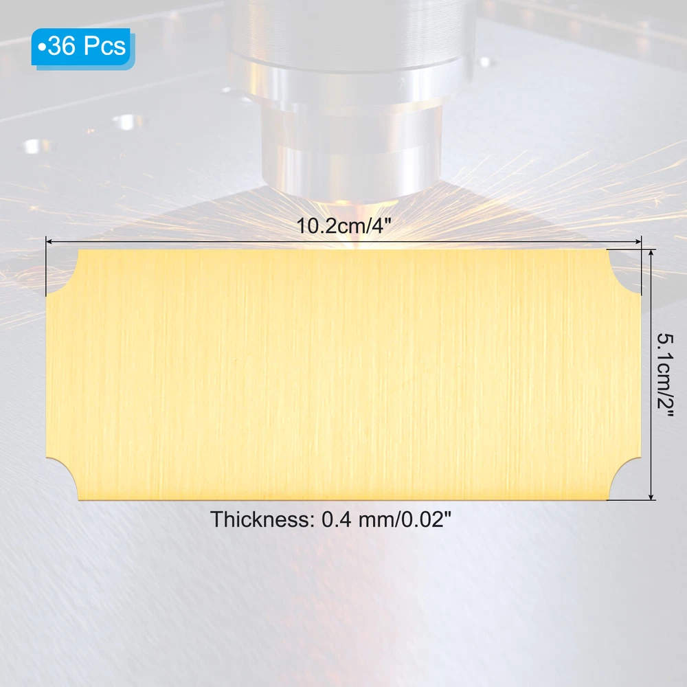 Document Our engraved nameplates are perfect for mounting on plaques, picture frames, sweaters, trophies, bags, display boxes, flag cases, and anything else.SpecificationMaterial: Stainless SteelColor: Gold ToneSize: 10.2 x 5.1 cm/4 x 2 Inch(L*W)Thickness: 0.4 mm/0.02 InchPacking List: 36 Pcs x Engraved NameplateAdvantageOur engraved nameplates are made of brushed stainless steel which is durable, stable, not easy to fade, rust, or break, and can be used for a long time. With a smooth surface, it will not scratch your skin.The right thickness makes the plate stronger and allows for deeper engraving. These elegant nameplates have a beautiful luster and a simple design. Suitable for various crafts to add brilliance.The protective film design can effectively prevent scratches. The adhesive backing design allows you to stick this nameplate anywhere without any tools and it can be firmly on the objects.InstructionPlace a metal workbench block underneath the blank stamping tags for better stamping.NOTE:1. There may be light scratches and blemishes due to shipping, but they can be polished.2. Only for laser engraving, not suitable for mechanical engraving.3. Please remove the protective film before use. 36 Pcs 4" x 2" Engraved Name Plate Picture Frame Label Art Tag, Gold Tone Our engraved nameplates are perfect for mounting on plaques, picture frames, sweaters, trophies, bags, display boxes, flag cases, and anything else. Specification Material: Stainless Steel Color: Gold Tone Size: 10.2 x 5.1 cm/4 x 2 Inch(L*W) Thickness: 0.4 mm/0.02 Inch Packing List: 36 Pcs x Engraved Nameplate Advantage Our engraved nameplates are made of brushed stainless steel which is durable, stable, not easy to fade, rust, or break, and can be used for a long time. With a smooth surface, it will not scratch your skin. The right thickness makes the plate stronger and allows for deeper engraving. These elegant nameplates have a beautiful luster and a simple design. Suitable for various crafts to add brilliance. The protective film design can effectively prevent scratches. The adhesive backing design allows you to stick this nameplate anywhere without any tools and it can be firmly on the objects. Instruction Place a metal workbench block underneath the blank stamping tags for better stamping. NOTE: 1. There may be light scratches and blemishes due to shipping, but they can be polished. 2. Only for laser engraving, not suitable for mechanical engraving. 3. Please remove the protective film before use. Hot Item Payment 1.We accept eBay payment . 2.Payment must be received within 7 business days of auction closing. Shipping 1.We ship to your eBay or Paypal address. Please make sure your eBay and Paypal address is correct before you pay. 2.Items will be shipped within 1-3 business day when we received payment. 3.Delivery time depends on destination and other factors. Description Policy 36 Pcs 4" x 2" Engraved Name Plate Picture Frame Label Art Tag, Gold Tone Our engraved nameplates are perfect for mounting on plaques, picture frames, sweaters, trophies, bags, display boxes, flag cases, and anything else. Specification Material: Stainless Steel Color: Gold Tone Size: 10.2 x 5.1 cm/4 x 2 Inch(L*W) Thickness: 0.4 mm/0.02 Inch Packing List: 36 Pcs x Engraved Nameplate Advantage Our engraved nameplates are made of brushed stainless steel which is durable, stable, not easy to fade, rust, or break, and can be used for a long time. With a smooth surface, it will not scratch your skin. The right thickness makes the plate stronger and allows for deeper engraving. These elegant nameplates have a beautiful luster and a simple design. Suitable for various crafts to add brilliance. The protective film design can effectively prevent scratches. The adhesive backing design allows you to stick this nameplate anywhere without any tools and it can be firmly on the objects. Instruction Place a metal workbench block underneath the blank stamping tags for better stamping. NOTE: 1. There may be light scratches and blemishes due to shipping, but they can be polished. 2. Only for laser engraving, not suitable for mechanical engraving. 3. Please remove the protective film before use. Hot Item Payment 1.We accept eBay payment . 2.Payment must be received within 7 business days of auction closing. Shipping 1.We ship to your eBay or Paypal address. Please make sure your eBay and Paypal address is correct before you pay. 2.Items will be shipped within 1-3 business day when we received payment. 3.Delivery time depends on destination and other factors.