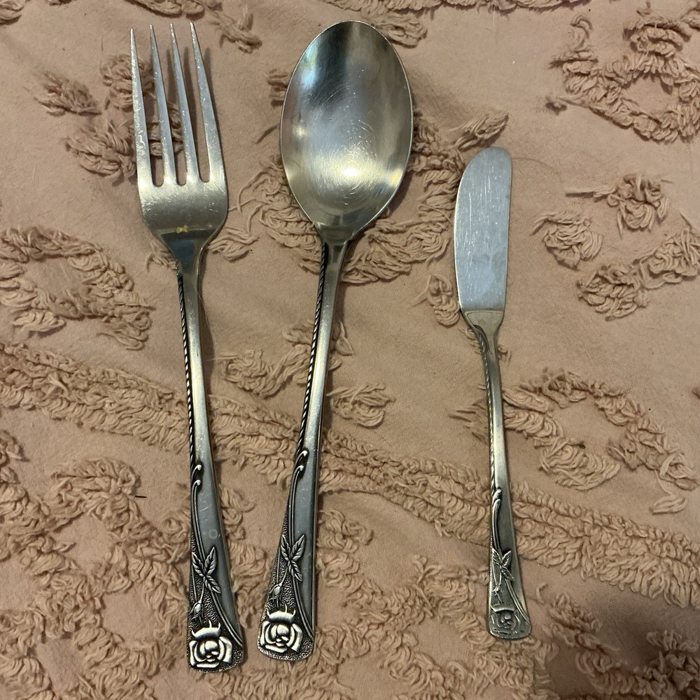 Type: Set with Serving Pieces Color: Silver Handle Pattern: Floral Handle Material: Stainless Steel Style: Vintage/Retro Brand: Noritake Material: Stainless Steel Country of Origin: Japan Care Instructions: Machine Washable up to 140°F Character: Rosetta