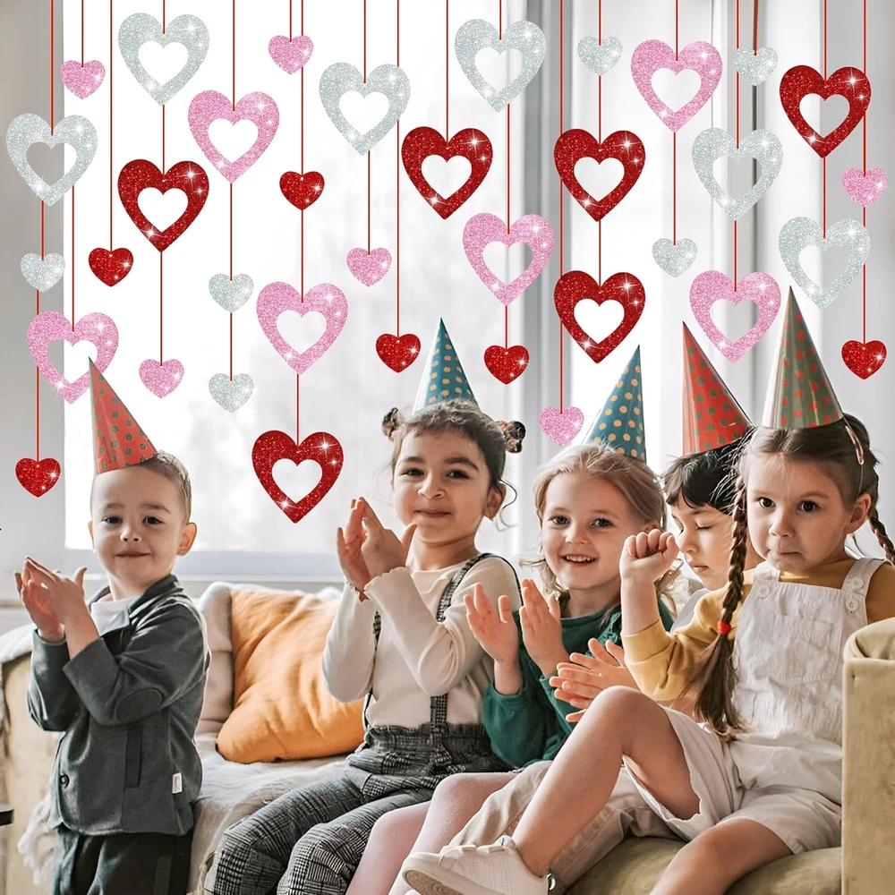 cardstock PACKING INCLUDE – 18 Pcs big hollow hearts and 18 pcs small solid hears with 3 colors: red, pink & silver, 36 pcs in total. Each glitter heart swirl is double side printed, whether viewed from the front or the back, they are the perfect hanging decoration for Valentines day party decorations. JUST HANG IT – We have pre-assembled as all the pieces for you. No need assemble, with attached red ribbon, hang from the ceiling as part of your Valentines party decorations. Get your home ready to celebrate the holiday! THEMED DESIGN – 3 Colors with 2 sizes & 2 different styles design: hollow heart and solid heart. It's perfect for decorating your dessert table, living room, themed party, school event, class, office, girl's birthday party and so on. STURDY & REUSABLE – Made of high quality card stock ,thick and sturdy, double-sided glitter PVC, can be reused. Elegant and themed Valentines heart pattern design will not outdated, will make your home full of romantic atmosphere! PERFECT FOR VALENTINE – Great additions to celebrate your Valentines day party, transform any room or venue into a celebration of holiday with these pretty glitter heart hanging swirls, add more festive to your party. Product Description VALENTINES DAY GLITTER HEART HANGING ORNAMENTS - 3 Colors: red pink silver(white) - 2 Styles & 2 Sizes: hollow & solid hearts, 5.9" & 3.15" - Made of card stock, thick and sturdy, double-sided glitter PVC. - Suitable for various occasions: such as Valentines day party, birthday, engagement, wedding etc. LET'S GO PARTY ALL NIGHT! BEAUTIFUL PARTY DECORATIONS Double-sided glitter PVC Sparkling home decoration Suitable for any place: wall, window, door, stair railings, corridor and so on FOR HOLIDAY DECOR FOR HOME DECOR FOR BIRTHDAY PARTY