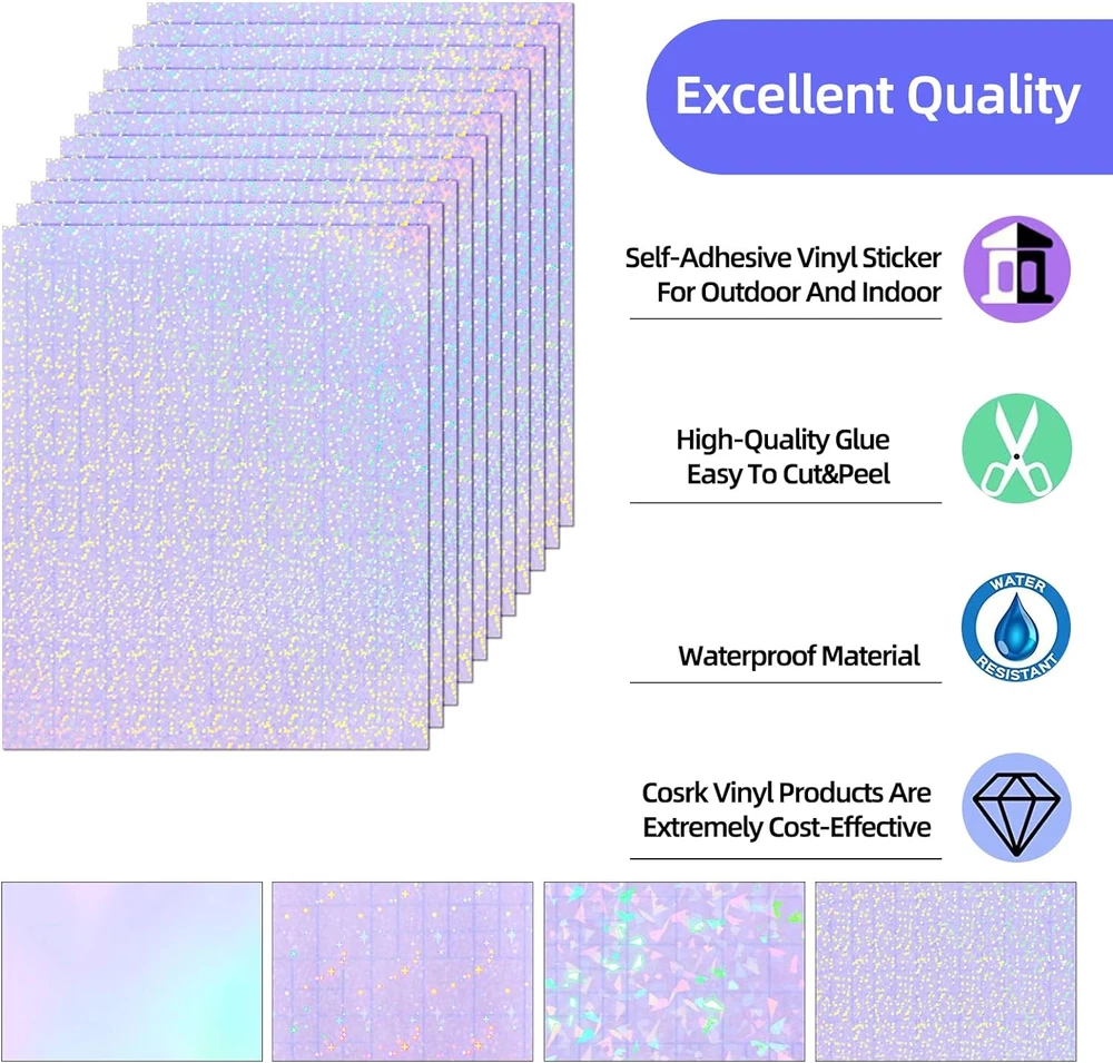 Superb Material: These holographic sticker paper are made of outstanding vinyl and paper material with high resolution, clear image quality, and bright-colored, no-fading, light-resistant, not easy to break, which are durable, and reliable for long time use. ALERT: THIS ITEM CANNOT BE PRINTED. PLEASE REFRAIN FROM USING IT ON THE PRINTER Easy Application: These self-adhesive vinyl sheets are designed with self adhesive backing, easy to cut with scissors or cutting machine, can be peeled off easily without leaving sticky residues, and they are also adhesive enough to stick to the smooth surfaces Amazed Visual Effect: This holographic transparent vinyl sticker will present different colors and reflections according to the lights and angles, including gem visual effect, dot visual effect, colorful visual effect and star visual effect, adding elegant charm for your decorations Wide Applications: Ideal for home decoration, scrapbooks, mirrors, banners, stickers, decals, notebook computers, windows, characters, figures, signs, other DIY crafts, and many other smooth and flat dry surfaces, such as metal, plastic, glass, tin, cardboard, paper, and more Package Includes: This package includes 36 sheets of holographic transparent films, in the size of 8.5x11 inch; there are gem, dot, colorful and star 4 patterns, 9 pcs for each pattern; the sufficient quantity can meet your different needs. You can create your own beautiful and shiny labels NOTE: THIS PRODUCT IS NOT MEANT FOR PRINTING PURPOSES. DO NOT ATTEMPT TO USE IT ON A PRINTER Product Description Holographic Vinyl Laminate Sheets Are you a DIY lover? Want to decorate your belongings and make them look unique? Then you must not miss our holographic-sticker paper! CAUTION: THIS ITEM IS NOT COMPATIBLE WITH PRINTING. PLEASE DO NOT OPERATE IT ON A PRINTING DEVICE. Colorful & Beautiful Experience the mesmerizing holographic effects as you delve into the magic of holography. Our films come in stunning color patterns. Watch as these patterns gracefully transition into captivating colors under different angles and lighting conditions, adding an elegant charm to your crafts. ✔ Easy to Use Our holographic-sticker sheet can be easily-cut with scissors or cutting machine. It’s a nice choice to cut cute animal shapes with your kids or students to improve their creativity. Start to enjoy wonderful-parent-child time with the holographic-laminate sheets! ✔ Strong Self-adhesive The adhesive backing ensures this holographic-waterproof vinylsticker paper firmly-adhered to all types of items. Never worry about the holographic-film peeling off from items. ✔ Watérproof holographic-transparent films Our transparent-holographic overlay is made of high quality watérproof material. Ideal stickers for decorating your bottle, coffee cups or bottle and washing them without worrying about lovely stickers getting damaged. Decorate Your Belongings The holographic-vinyl sticker is perfect for decorating your items. Just cut out the-pattern you want and stick them on the surface of photos, diaries, laptops, water bottles, gift cards and so on. Many styles to choose from Unleash your creativity with the versatile crafting possibilities that our holographic films offer. These clear holographic vinyl stickers are perfect for decorating a wide range of items, including photos, diaries, laptops, water bottles, gift cards and so on. You can personalize your journals, laptops, and gift cards with these chic designs, making your belongings truly one-of-a-kind. Product information Name: Holographic Sticker Paper Material: Vinyl, Paper Color: Holographic Clear Size: 8.5x11 Inch Package includes: 36 or 24 Sheets Holographic Clear Overlay Lamination Stickers Features: Our holographic laminate sticker paper is made of high-quality vinyl material, featured with waterproof, sunscreen properties, which is convenient and durable for your long time use. These transparent vinyl sticker paper is easy for daily use, which can be firmly adhered to all types of smooth objects, also can be easily peeled off without leaving a sticky residue. Holographic laminates paper with colored laser patterns shine differently in different light and angles and look amazing. Ideal for decorating your car, windows, glasses, mugs, bags, boxes, designing a unique gift, home decor, scrapbooking, decals, posters, banners, phone covers, and much more.