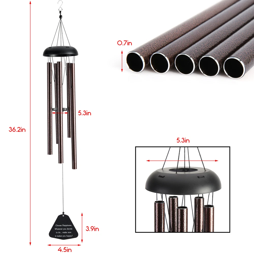 Features Premium Aluminum Construction Crafted from high-quality aluminum with a vintage bronze finish, rust-resistant and durable. Each large metal tube is hand-tuned by professional experts for clear, melodious tones. Equipped with heavy-duty nylon cording and a high-density striker for stable resonance. Adjustable Sound & Smooth Edges Adjust the bell position to change scales and create different melodies. Polished smooth tube edges ensure safe handling without scratching fingers. 5 Large Decorative Tubes 5 tubes of varying lengths with unique patterns, designed for distinct appearance and long-lasting stable sound. Ideal for patios, gardens and outdoor spaces. Lucky Lucky Pendant Decor Bottom lucky pendant swings with the wind, creating a gentle, harmonious atmosphere. Reflective surface shines in sunlight, serving as an eye-catching yard and home decoration. Meaningful Gift Option Perfect as a sympathy gift, housewarming, wedding, anniversary, birthday or hospitality present. Suitable for friends, mom, neighbors and family to express care and blessings. Product Specifications Item Details Material Aluminum Color Bronze Cap Diameter 5.3 inch Total Length 36 inch Number of Tubes 5 Tube Lengths 11.6 / 12.5 / 13.7 / 14.9 / 15.9 inch Tube Diameter 0.79 inch Tube Thickness 1/25 inch Pendant Size 4.5 x 3.9 inch Package Includes 1 x Wind Chime After-Sale Guarantee We offer free return and exchange service for quality-related issues within 30 days of delivery. One-year after-sales support is provided for product defects and abnormal use problems. If you have any questions about insta llation or use, please feel free to contact us, we will reply and solve your problem within 24 hours.