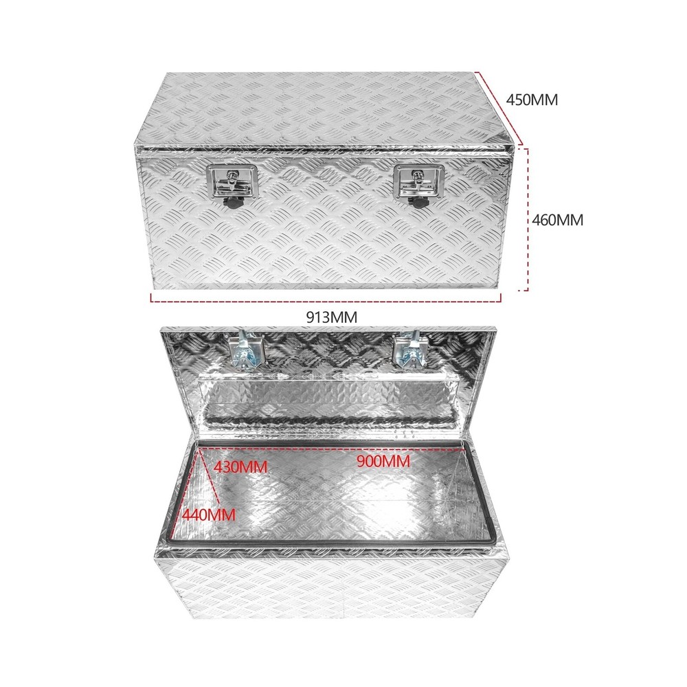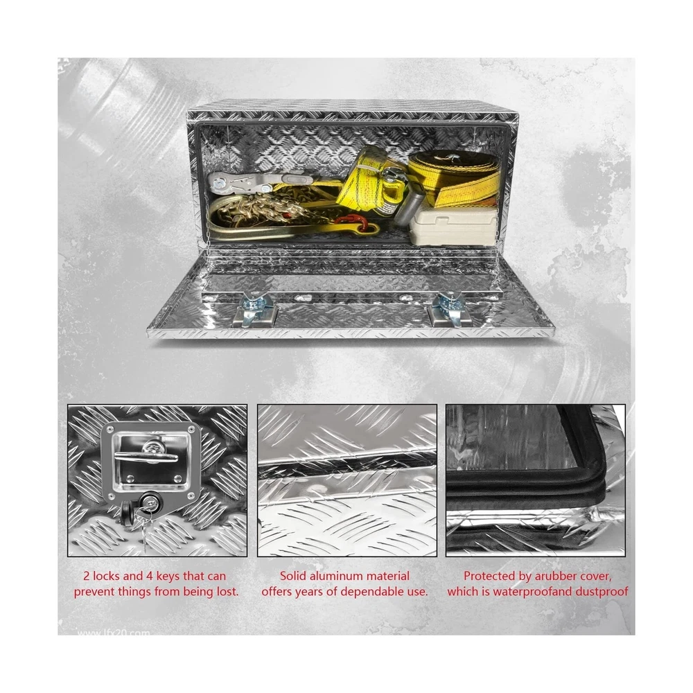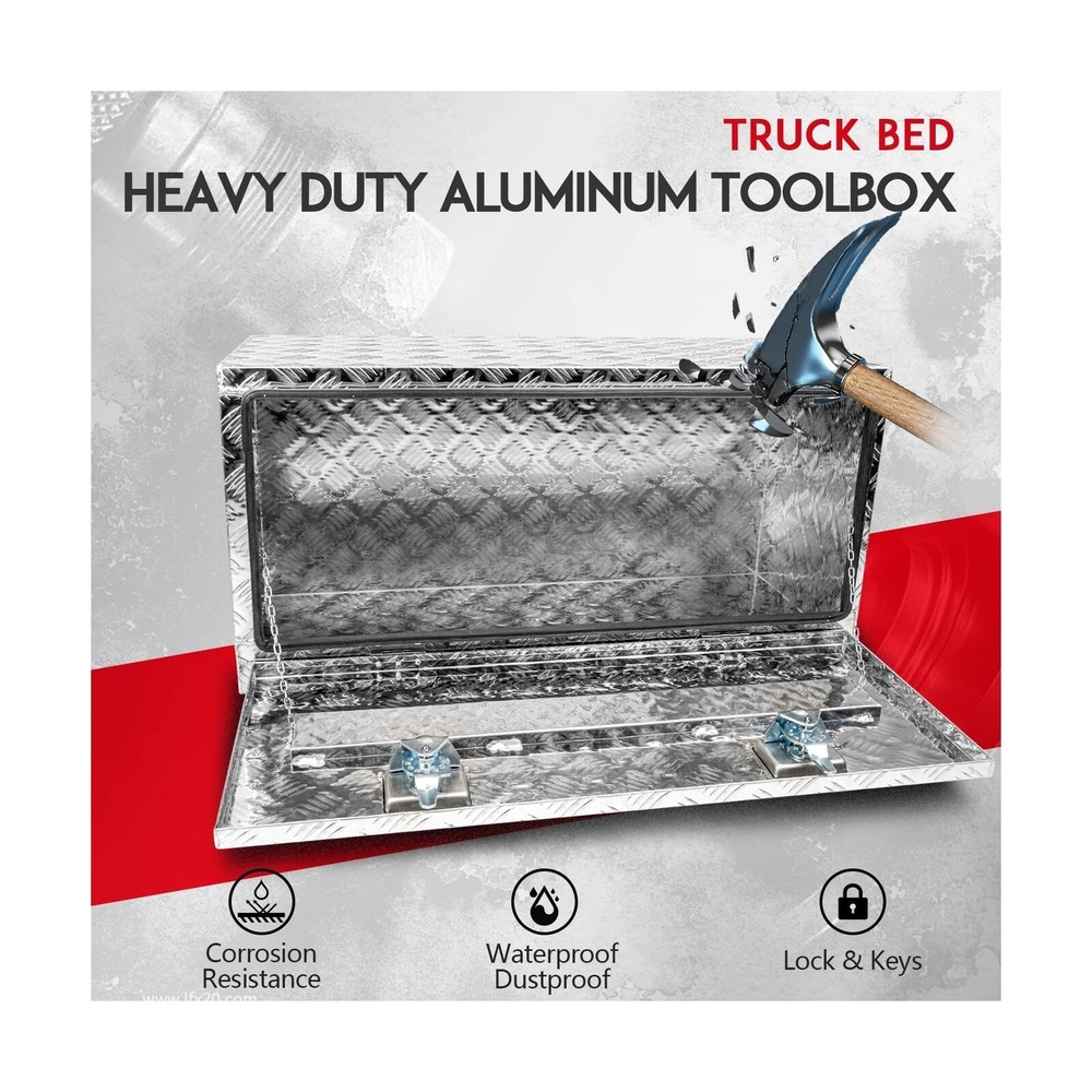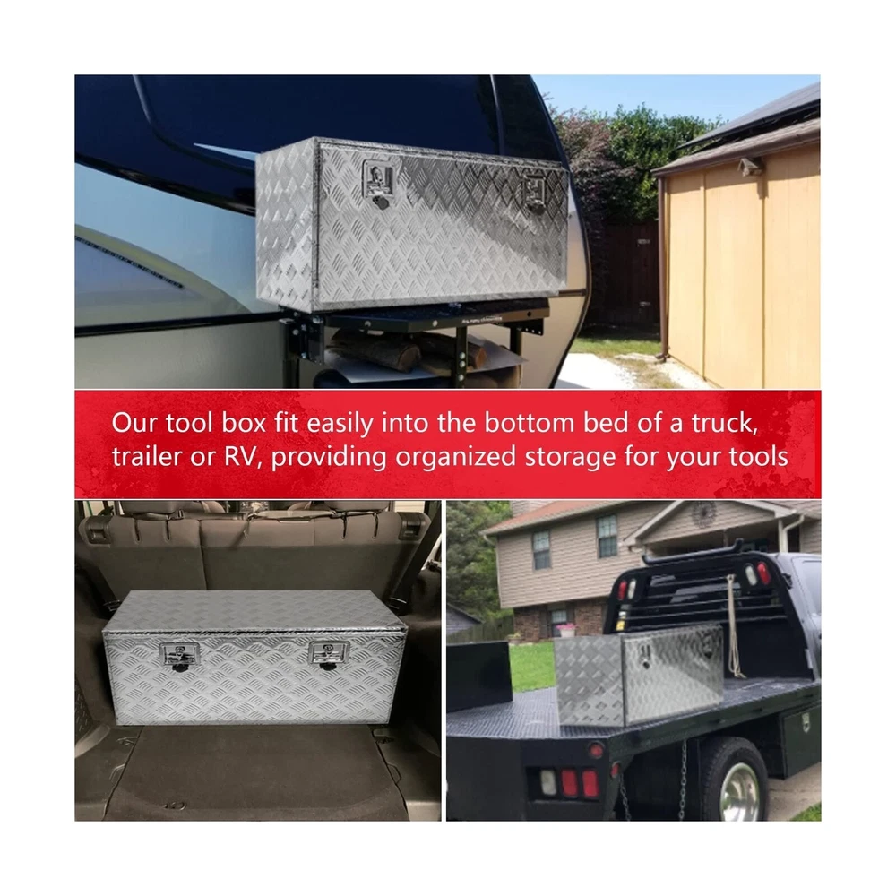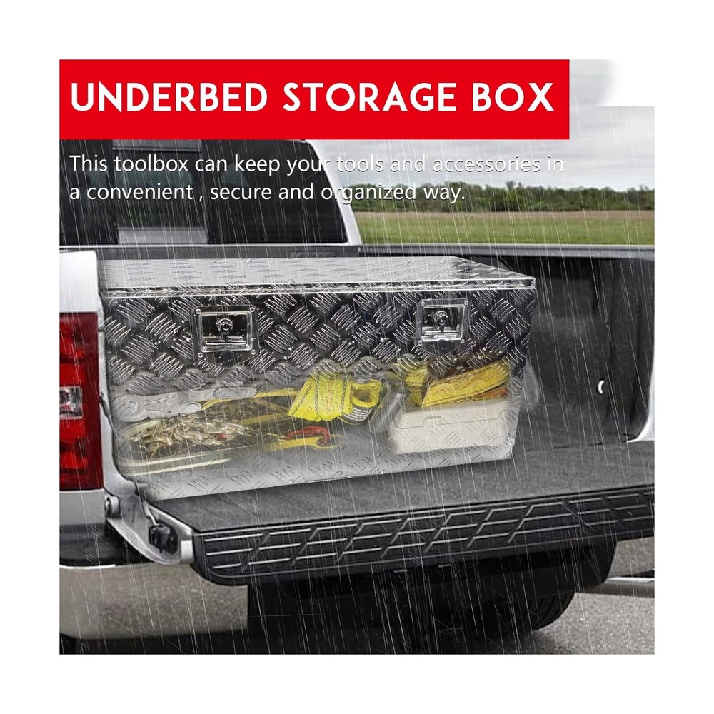 36" x 18" x 18" Truck Tool Box Pickup Truck Bed Toolbox Heavy Duty Aluminum Underbody Truck Box Compatible With RV Trailers Storage Organizer with Lock & Keys Silver Description Edicapo 36" x 18" x 16" Truck Tool Box Pick Up Truck Bed Toolbox Heavy Duty Aluminum Underbody Truck Box with Lock & Keys Features: Tool Box for TruckThe 36" x 18" x 18" tool box can be used on the bed of trucks, ATVs RVs trailers flatbeds luggage racks garages and camper hook racks. Dual Locks and SealThe toolbox with a latch seal to keep your items safe in transit and protected by cover with rubber seal , which is waterproof and dustproof , let Your tools stay dry and rust-proof. Premium Materials Truck Bed Toolbox is made of heavy duty aluminum material that offers years of dependable use. The diamond tread pattern design which can preventing them from rolling around inside your truck, trailer, and RV cabin . More StorageOur tool box fits easily into the bottom bed of a truck, trailer or RV, provids organized storage for your tools, small items, accessories, camping supplies, and much more. Service GuaranteeEDICAPO is well aware of the importance of quality to consumers.We will check all products before shipment. If you have any problem, please contact us and our team will solve it for you within 24 hours Product Details: Brand: Edicapo Color: Silver Material: Aluminum Special Feature: Lockable Style: Modern Brand: ‎Edicapo Color: ‎Silver Material: ‎Aluminum Special Feature: ‎Lockable Style: ‎Modern Recommended Uses For Product: ‎For storage Product Dimensions: ‎36"L x 18"W x 17"H Water Resistance Level: ‎Waterproof Opening Mechanism: ‎Latch Shape: ‎Rectangular Pattern: ‎Solid Number of Items: ‎1 Unit Count: ‎1.0 Count Item Package Quantity: ‎1 Material Feature: ‎lightweight and rust-resistant Occasion: ‎work, utility Closure Type: ‎Latch Manufacturer: ‎Edicapo Item Weight: ‎26.5 pounds Manufacturer Part Number: ‎LQ-GJX-1025-S-SH Special Features: ‎Lockable Date First Available: March 2, 2023 Delivery We Do Not Ship Outside of the Continental US. Return Policy All items qualify for returns within 30 days of receipt. Buyer is responsible for return shipping on any item that is not damaged. Feedback We take our reputation seriously, we buy and sell online, so we understand the value of trust. If you are unsatisfied with your order, please contact us and we will work with you to resolve it to your satisfaction.