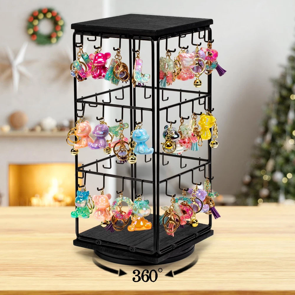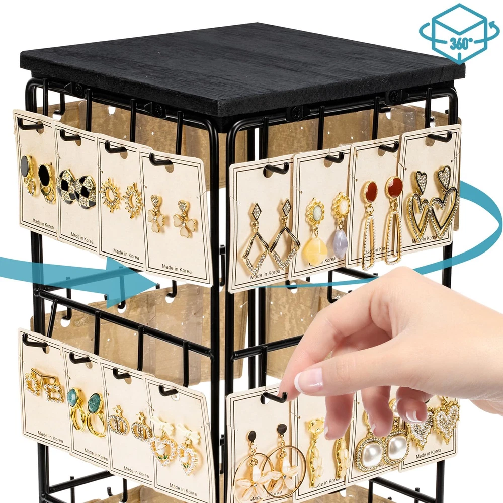 Rotating Wooden Jewelry Display: This earring holder organizer sits on a rotating stand, which display your jewelry in all directions. It can display various types of earrings and necklaces or keychains in four sides, increasing earring display opportunities. Attractive and Sturdy: Our rotate jewelry display racks are made of solid wood and strong metal, durable and sturdy to ensure long term use. This earring display stands are perfect for showcasing your beautiful earrings and attracting your customers' attention. Easy to Install: This spinning earring display stand tower is so easy to put this turning earring storage organizer together, all you need to do is just screw the 4 metal parts between the 2 wood parts, then you are done with your installation and can get a high-end, beautiful rotating jewelry stand to properly display your earring cards or jewelry. Perfect Size: Earring display rack measures 7.28"L x 7.28"W x 15.74"H that doesn’t take up a lot of space and perfectly fit any counter, earring display jewelry display for vendors 48 hooks offer maximum storage capacity for hanging all of your jewelry collection easily and beautifully. Where to Use: This wood jewelry display stand is practical and convenient, which commonly used in retail stores, trade shows, or exhibitions, earring display, jewelry display for vendors, and you also can be applied it for selling, showing.