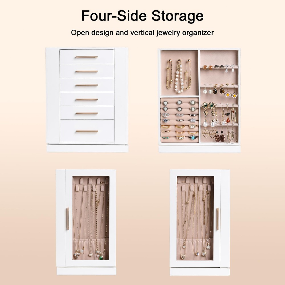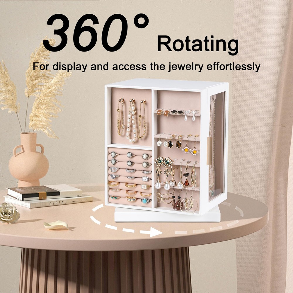 360° Rotating Design:Our jewelry box & organizers features a unique 360° rotating design, along with a three-sided visual design and vertical storage, which allows you to display and quickly access the jewelry you want effortlessly Large Versatile Capacity:This jewelry holder organizer measures 11.3"x 8.9"x 6.3"which can provide spacious storage space for your jewelry.It comes with 3 bracelet hooks,7 ring slots for storing at least 21 rings,48 stud earring holes,18 hooks for hanging necklaces and 6 drawers with different layout,this is a perfect jewelry box for women Premium Quality Material:This jewellery box has a sturdy MDF construction and is of high quality.The synthetic leather exterior is durable and easy to clean,and the soft velvet interior can keep your jewelry well protected.In addition,all the sparkling metal handles are cast by special craftsmanship,combining practicality and aesthetics Chic and Stylish :Elegant gold handles, minimalist style, and rotatable design come together to form this unique jewelry box with a stylish look that is suitable for a variety of scenarios including vanity,dressing table and jewelry stores Ideal Gift for Your Loved One:Looking for a gift for a jewelry collector? Look no further!This jewelry box is the ideal combination of functionality,style,and durability,making it a great gift for any occasion.Surprise your loved ones with this elegant jewelry box