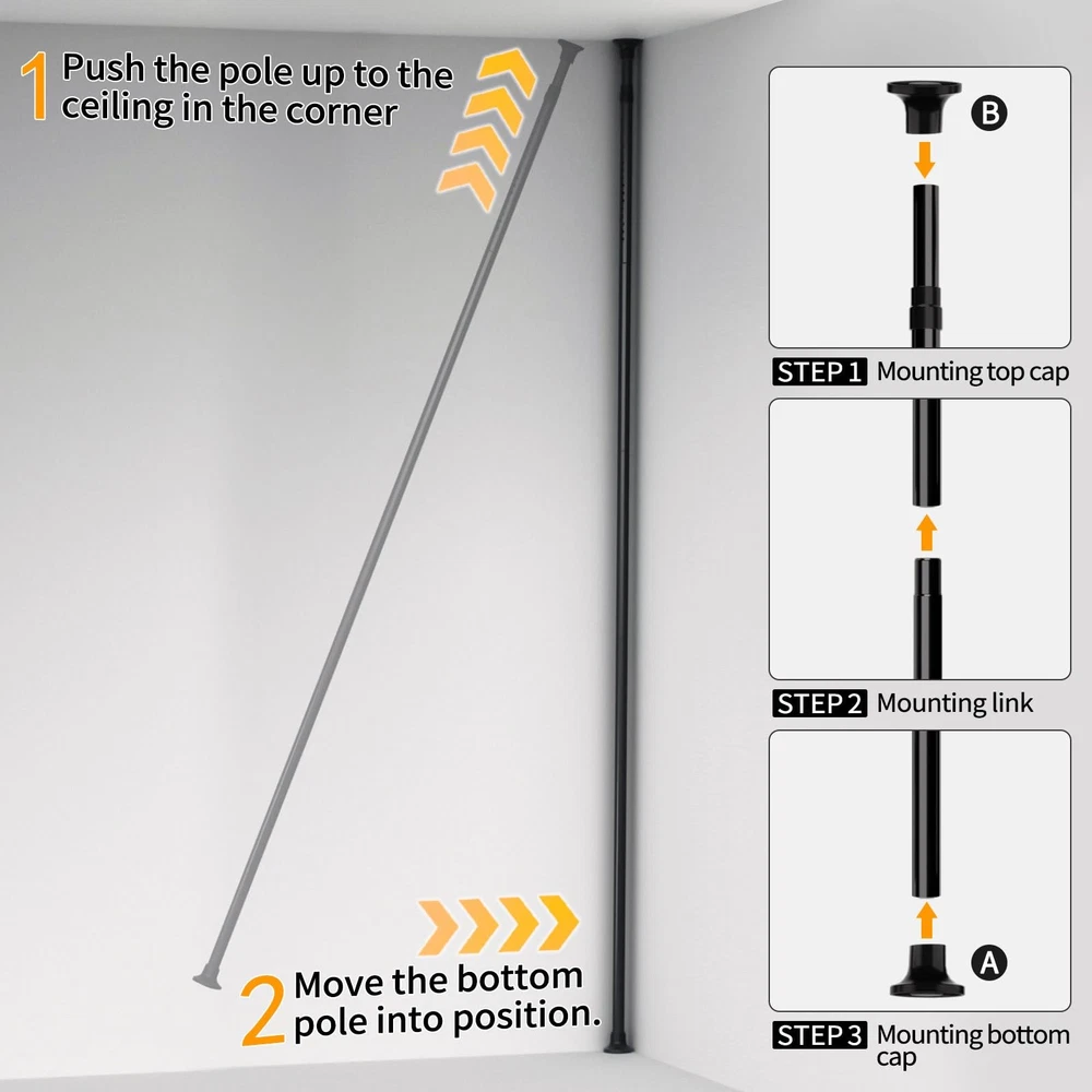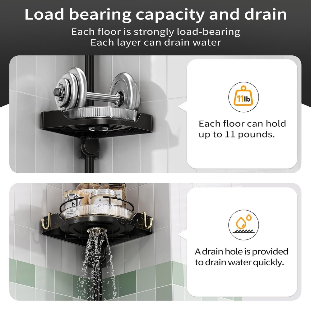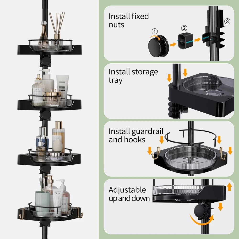 Corner Shower Caddy Tension Pole, 4 Tiers Rotating Shower Organizer for Bathroom Shelf Bathtub, Adjustable Standing Shower Rack Bathroom Accessories, Easily Assemble, 34-124 Inch Height,Black Corner Shower Caddy Tension Pole Design, exquisite bathroom rotating storage tray, easy to retrieve and bathroom supplies, multi-layer bath caddy can fully meet the storage needs of bathroom accessories. The multi-layer corner shower caddy tension pole storage tray is fixed with specialized buckles to prevent slipping, Quick Assembly, Durable Materials.Tension rod shower caddy can be quickly assembled successfully. According to the assembly instructions, most people can complete the assembly of shower caddy corner in a short time. High quality metal materials are used to prevent rust and maintain corner shower caddy tension pole durability, Expanding Bathroom Space, the shower caddy tension pole organizes the space needed for bathroom supplies, expands the bathroom space, and can be conveniently installed next to the bathtub or in the corner of the bathroom wall, saving messy bathroom space, Extended Telescopic Rod, maximum length of 124 inches, the shower organizer corner can meet the needs of most households such as bathrooms, kitchens, or bathtubs that require bathroom storage racks, and can be adjusted appropriately according to changes in height, Detailed Installation Instructions, please confirm the height of the installation position first, and assemble this bathroom shelves according to the steps in the manual,