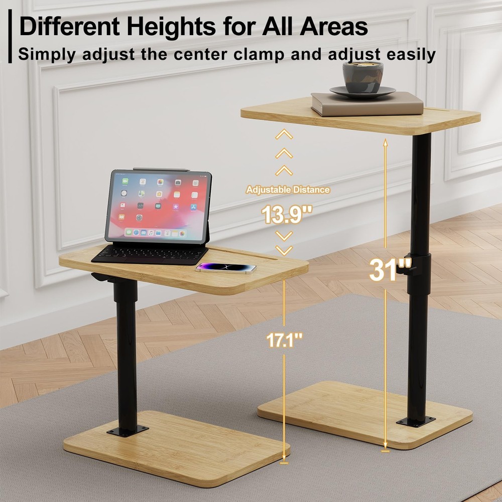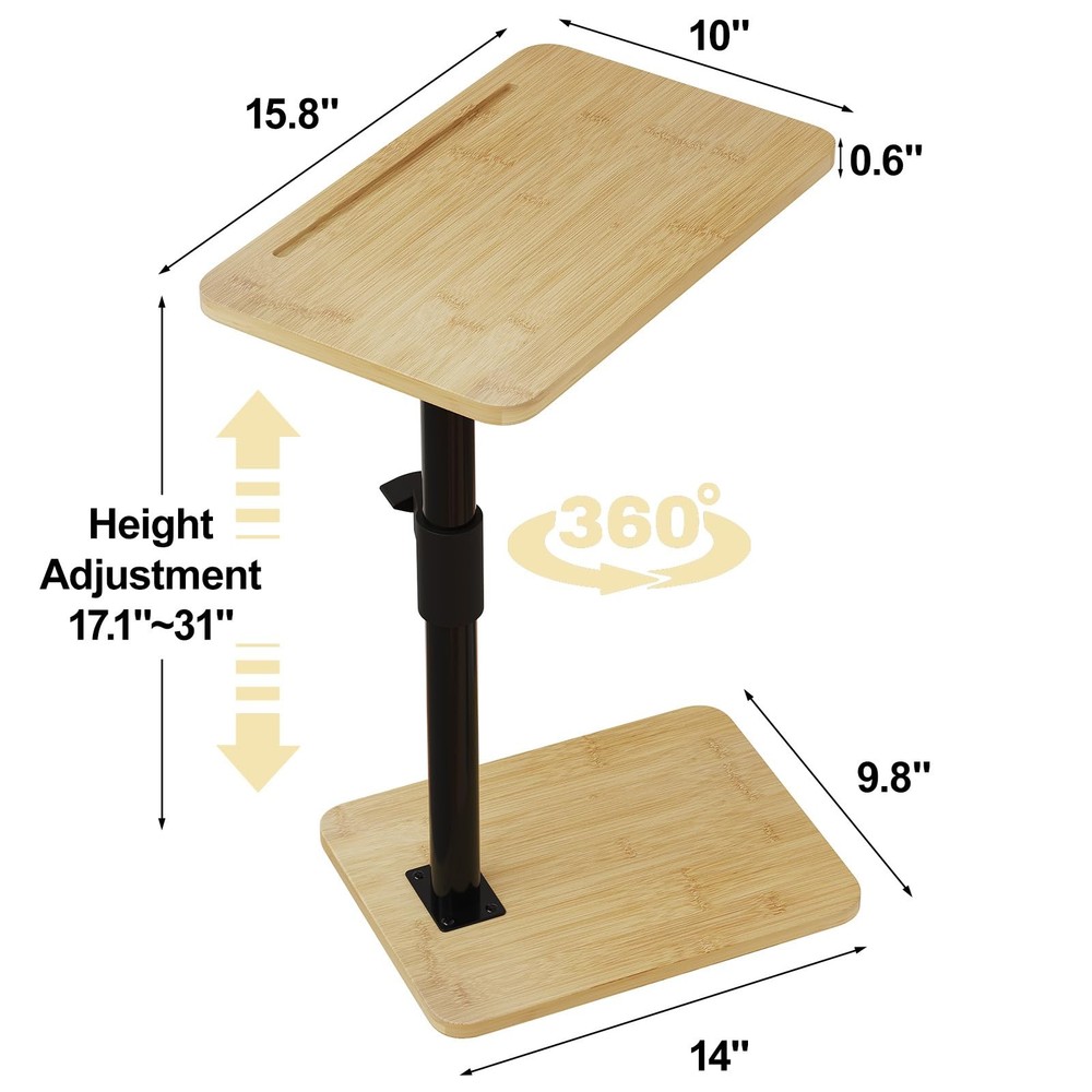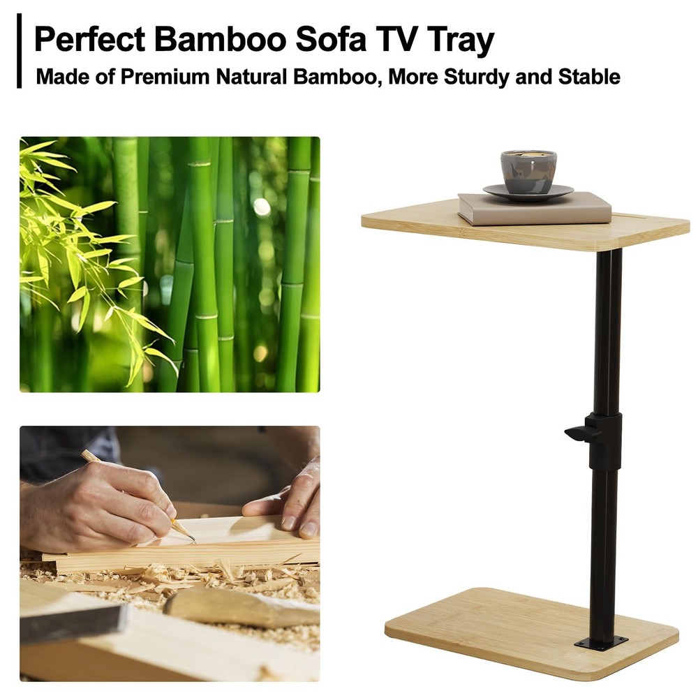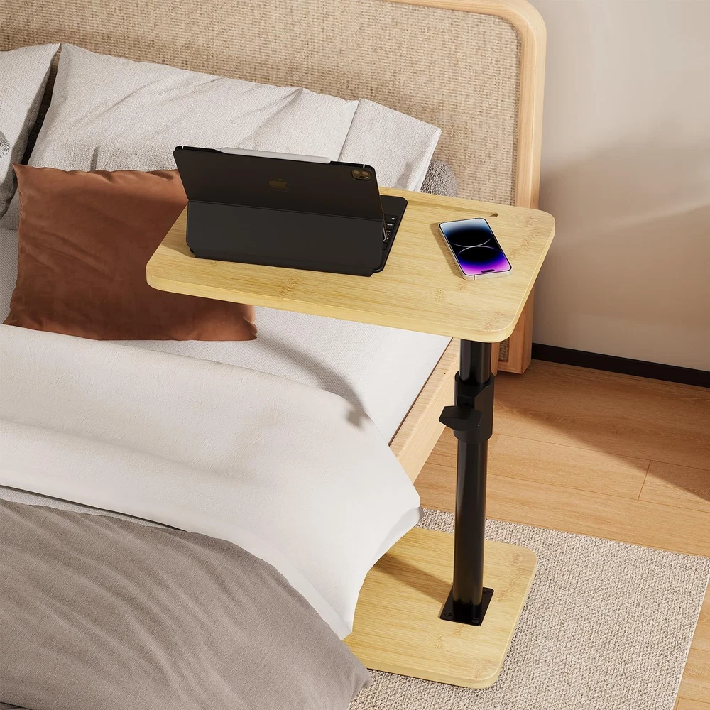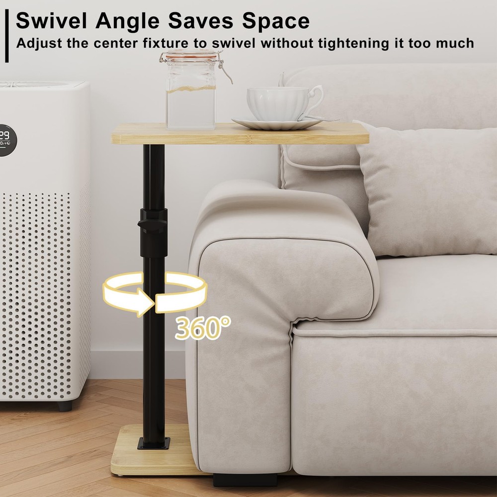 Adjustable C-Shaped Bamboo Side Table with 360° Swivel and Phone Stand for Sofa or Bed