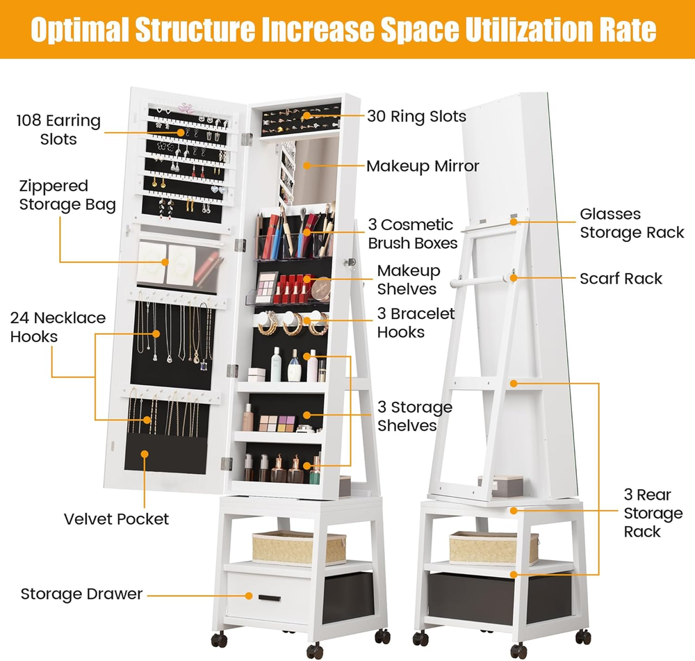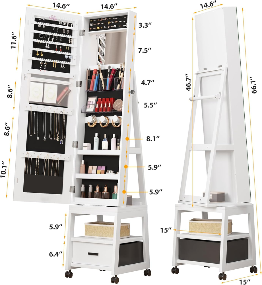 Store New Arrivals Add to Favorite View Feedback Contact 360° Swivel Jewelry Armoire, Floor Standing Locking with Full Length Mirror,Bottom Drawer, Shelf, Wheels,White Cabinet with Large Storage Capacity (White Push-Pull) Description Item model number PHO_0WZ_01 Style Modern Number of Items 1 Item Package Quantity 1 Country of Origin China Jewelry Storage Type Jewelry Armoire Batteries Required? No Number of Compartments 1 Special Feature Full Length Mirror, Wheels, Makeup Mirror, 360° Swivel, Drawer Product Dimensions 15"D x 15"W x 66.1"H Material Engineered Wood, Iron Number of Drawers 1 Finish Type Polished Closure Type Key Lock Item Weight 37.5 pounds Finish Polished Occasion Mother's Day, Engagement, Wedding, Christmas, Birthday Special Features Full Length Mirror, Wheels, Makeup Mirror, 360° Swivel, Drawer Target Audience Women Part Number PHO_0WZ_01 Mounting Type Freestanding Color White push-pull Shape Rectangular Recommended Uses For Product Face Makeup Included Components Jewelry Armoire Inner Material Engineered Wood 【4-in-1 space-saving design】This 66" high jewelry armoire offers ample storage space with its 4-in-1 design. With this cabinet, you'll get a Full-length Mirror, Jewelry Organizer (with 108 earring slots, 30 ring slots, 24 necklace hooks and 3 bracelet hooks), Makeup Vanity (with built-in makeup mirror, large mask storage bag, 3 makeup brush holders, 8 lipstick slots, 2 powder eyeshadow boxes and 3 skincare shelves) and a Multifunctional Storage Shelf (with storage drawer, glasses rack, scarf rack and 3-tier storage platforms) 【HD full-length mirror】Large full-screen mirror without smelly glass glue & clown mirror effect provides a head-to-toe view of outfit. Anti-splash explosion-proof film to prevent scratches when accidentally hitting the glass, safer for home use. 【360° rotating base and lockable wheels】Effortlessly move the jewelry armoire with lockable wheels and select the perfect viewing angle with the 360° rotating base. It allows easy access to items behind the cabinet and is ideal for those who prefer not to face a mirror while sleeping. 【Elegant design】Crafted with high-quality materials, our jewelry armoire features a fashionable matte white finish, exuding an elegant aesthetic that complements any room decor. Its design embodies the principles of the Golden Ratio, elevating the style of your space. 【Well-thought-out details】The velvet lining offers excellent protection for your jewelry, ensuring their longevity; The elastic velvet pockets in the necklace area prevent long necklaces from getting caught in the door or making noise when opened; Two keys are provided for locking the jewelry armoire securely; With its low center of gravity and triangular design, the armoire is stable and tip-resistant. 【Pre-assembled】The interior of the jewelry armoire comes fully pre-assembled, requiring only simple installation of the base and frame. Our packaging utilizes custom high-density foam molds to ensure safe delivery without any damage. The moment you open the package, you'll fall in love with this stunning jewelry armoire! Product Description Alkmaar Jewelry Armoire, a great helper for storage your precious jewelry! Own it, make your life more convenient. Soft velvet inside protects your jewelry from scratching. Full-length body mirror offers you a HD viewsight. 360° Swivel base design rotates freely with no blind corner. Large storage space let you say goodbye to chaos. Storage drawer and shelf easily store your daily items for better organization. Lockable with key design protects your privacy and keep children away from your jewelry. Made of high-quality wood, the floor standing jewelry armoire ensures a long-term use. Alkmaar 4-IN-1 Jewelry Armoire One Full Length Mirror One Mordern Jewelry Cabinet One Bottom Storage Drawer 3-Tier Rear Storage Shelves Soft Velvet Necklace Pockets Protect your necklace from fading or snagging Large Storage Space Collect so many jewelry and other beautiful items without running out of storage space. Clear PVC Box Storage your powder, lipstick, and eyeshadow Protective Design White shelf prevents your valuable skin care products from falling off Safety Lock Design Protect your privacy and keep your jewelry safe Opening Shelf Design Easily place everyday items such as glasses and scarves 3 Layer Rear Storage Shelves Storage your handbag, shoes, storage bin or others 360° Swivel Base Design Allow you see your dress up from any Angle before going out Large Storage Drawer Easily place your facial mask, travel makeup bag, lotion and stuff ABOUT US We offer the best prices around on high quality products. Our E-store includes media such as books, movies, music and games while offering electronics, toys, sporting apparel, clothing, tools, general home, garden items and more. SHIPPING We are always working hard to ensure your package arrives as soon as possible. Please understand that some factors like weather, high postal traffic, and the performance of shipping companies are outside of our control. We offer free shipping to the lower 48 states and ship within 2 business days of payment, usually sooner. We do not accept P.O. Boxes. Please provide a physical address. For shipping outside of the continental USA, we only use eBay's Global Shipping Program.The item is shipped to KY and then sent to the rest of the world. International customers are responsible for all duties and taxes. Continue to check out in order to calculate costs for shipping the item to your country. Messages regarding eBay's Global Shipping Program MUST be directed at eBay EXCLUSIVELY. RETURNS We offer a 30-Day Return Policy on items which you are not completely satisfied with. You have the option for a full-refund or an exchange of the item. No returns are available on items shipped outside of the USA. PAYMENT We accept PayPal. CONTACT US This page content is yet to come Please ad us to your favorite seller and visit again later Th
