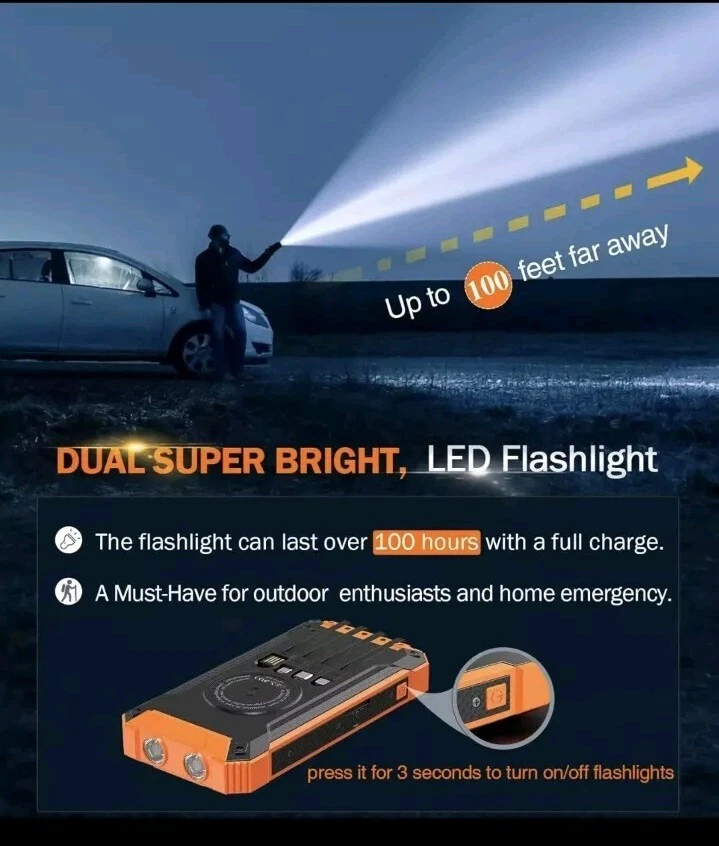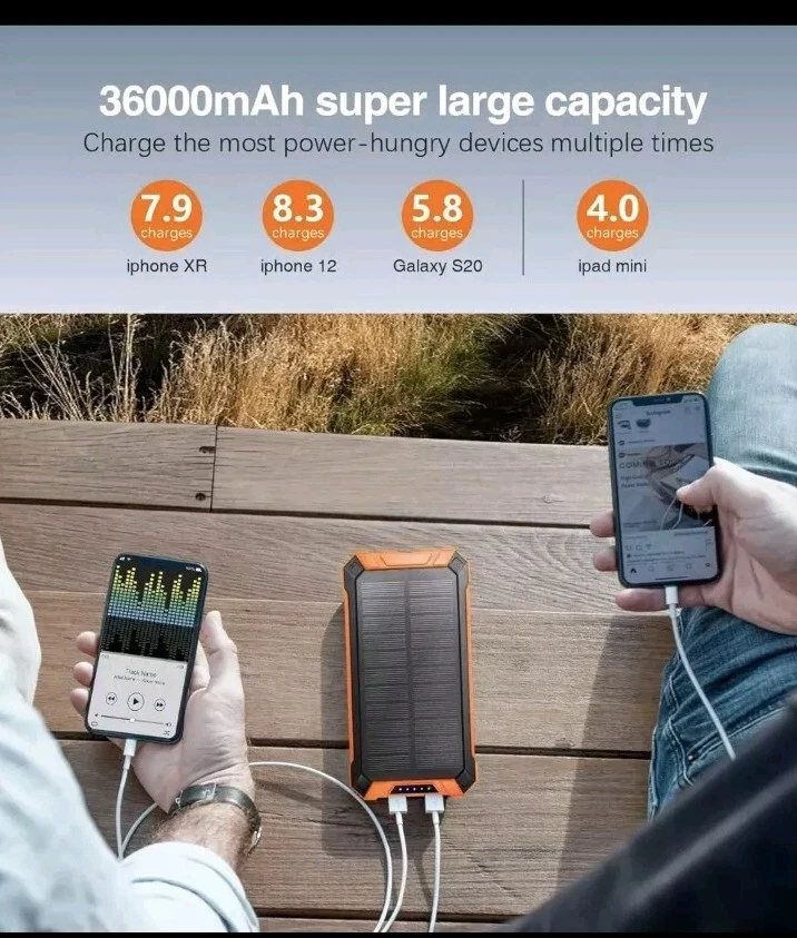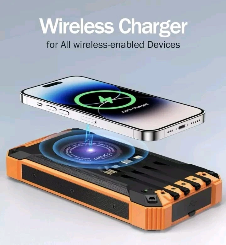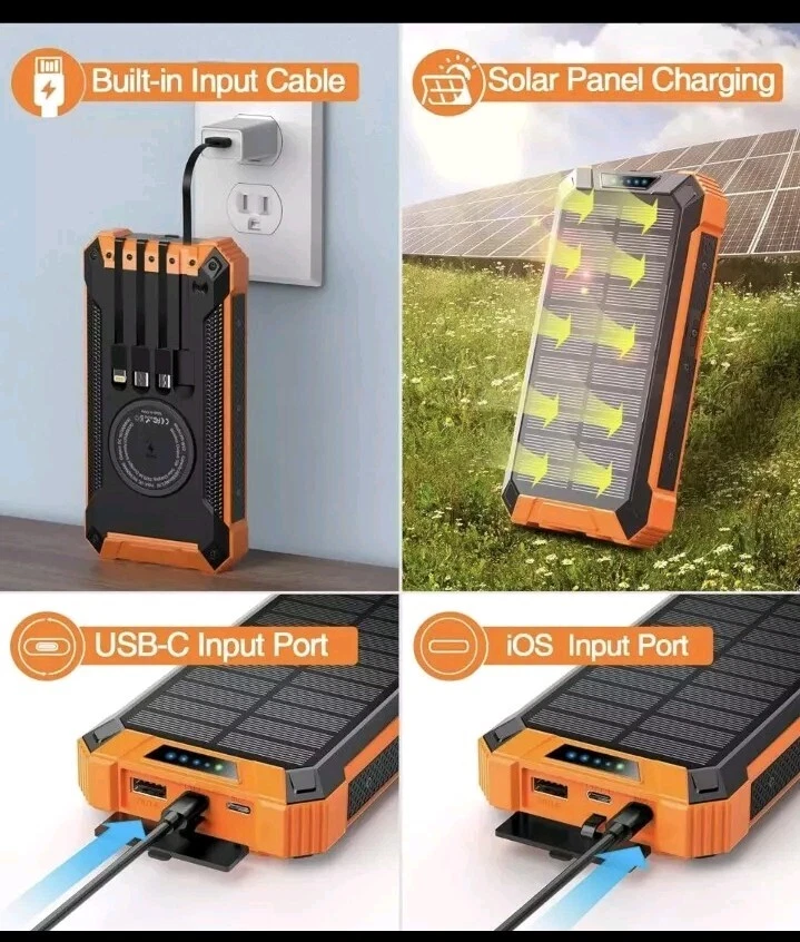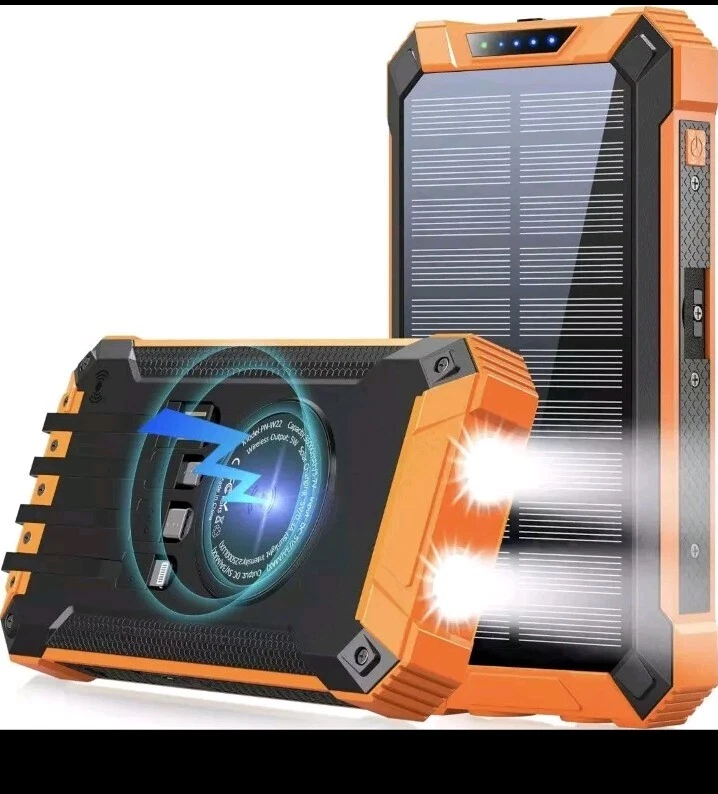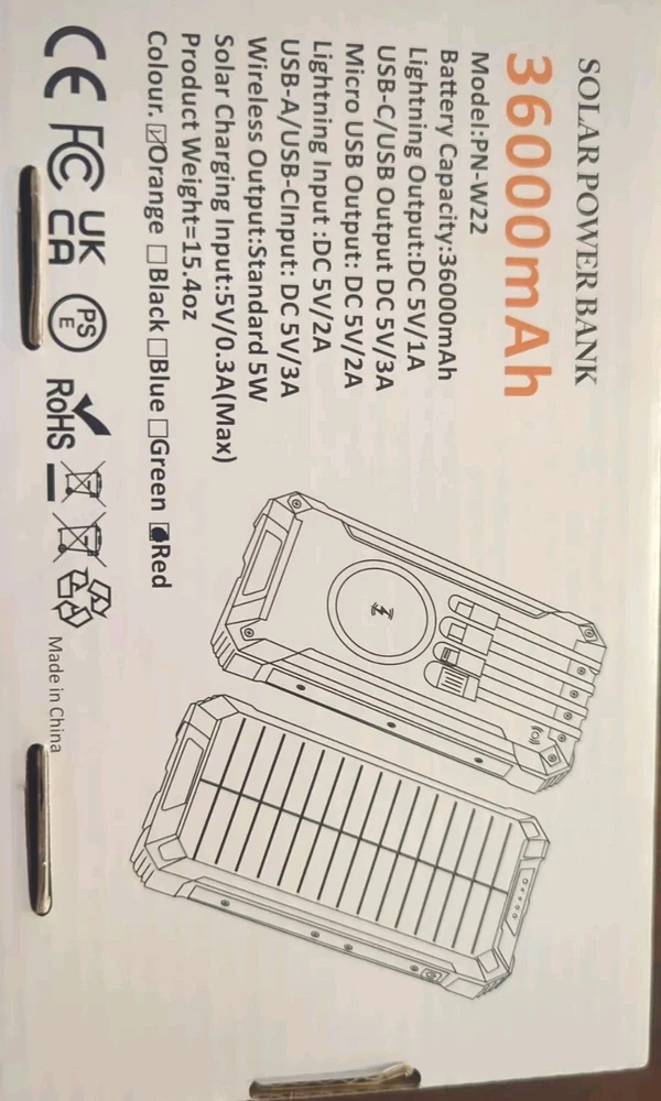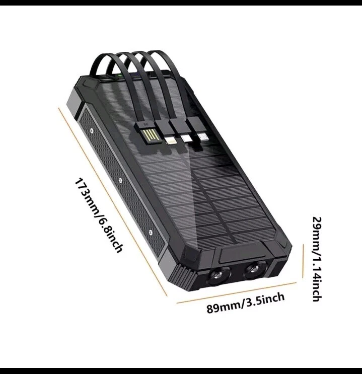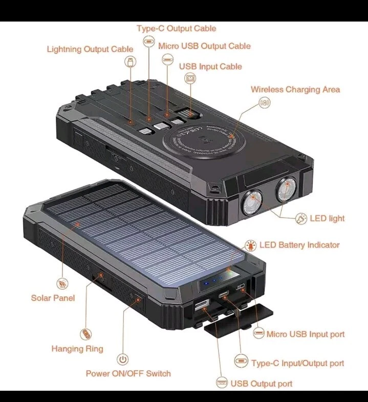 Ship through FedEx 2 days, arrive in 2 days Random color This KEPEAK Solar Power Bank Charger is a universal charging solution with a massive 36000mAh capacity and 15W power. It features six outputs and four built-in cables for fast charging of multiple devices simultaneously. The power bank is made of durable plastic ABS+Silicone and has a sleek black matte finish. It is equipped with LED lighting and dual flashlights for emergencies. This portable and reusable power bank also includes a carabiner for easy mounting on a backpack or desk. It is shockproof, waterproof, and has wireless charging capabilities. With a 1-year manufacturer warranty, this Solar Power Bank Charger is a must-have for any outdoor enthusiast or frequent traveler.