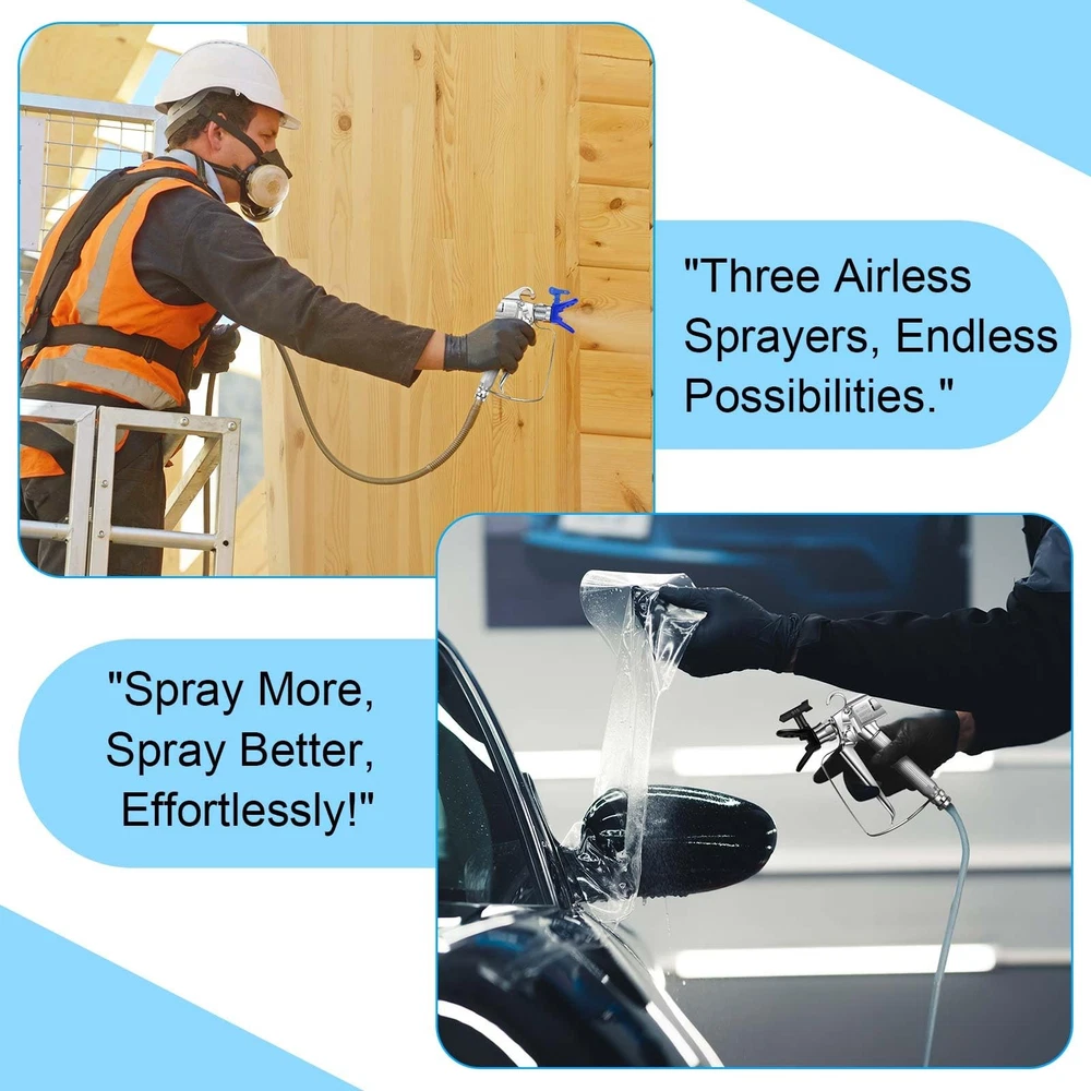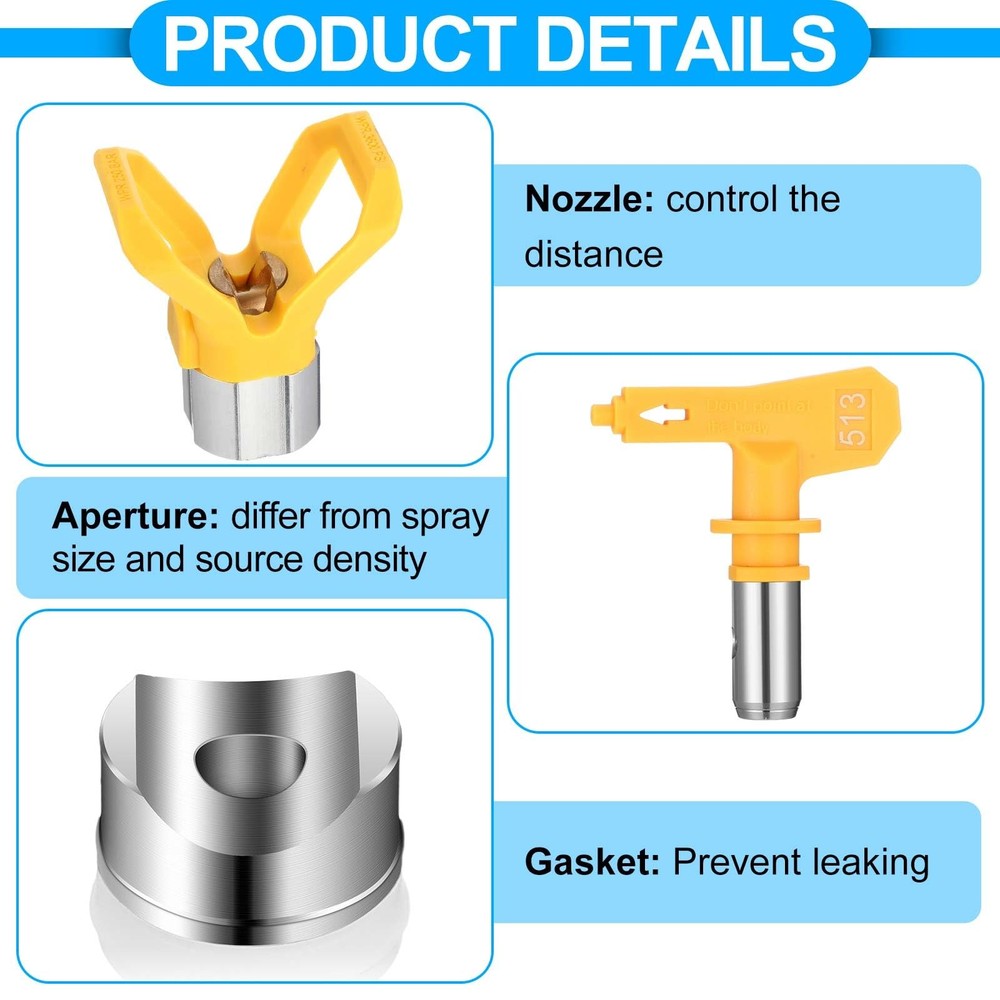 Features: Easy Maintenance: The simple and straightforward design of the airless paint sprayer gun allows for easy maintenance and cleaning, ensuring optimal performance and prolonged use. Optimized for Smooth and Even Coating Application: The precision engineered nozzles and airless design of these spray guns ensure smooth and even coating application. Whether you're painting a vehicle, furniture, or any other surface, you can expect professional grade results with these user friendly spray guns. Specifications: Material: gun body is stainless steel, gun base and nozzle are plastic Color: yellow (513), black (515), blue (519) Size: approx. 22 x 15 x 5 cm (8.66 x 5.91 x 1.97 inches) Package includes: 3 x Airless paint sprayer guns with 513/515/519 nozzles Notes: Manual measurement, please allow slight errors on size. The color may exist a slight difference due to different screen displays. Versatile Nozzle Options: our offering includes a comprehensive set of 3 airless spray guns, each designed with a different color for easy identification; The set comprises a yellow nozzle (513), a black nozzle (515), and a blue nozzle (519), providing you with the versatility to tackle various painting and coating tasks Smooth Spray Performance: the gun features a 1/4 inch inlet fitting, a swivel joint, and a forged gun head, 100 mesh gun filter inside, ensuring a smooth and controlled spray application for professional quality results Reliable Construction: the airless paint sprayer gun is built to last, with a stainless steel gun body and plastic gun base and nozzle, ensuring long lasting performance and reliability High pressure: the airless spray gun with 3600 PSI maximum pressure can easily cope with various working environments, the lightweight design of the airless paint sprayer gun provides comfortable and easy handling, reducing fatigue during extended painting sessions Efficient Coating: this paint sprayer can easily handle a variety of materials, including raw materials, stains, and varnishes, making it a versatile tool for various painting and coating applications