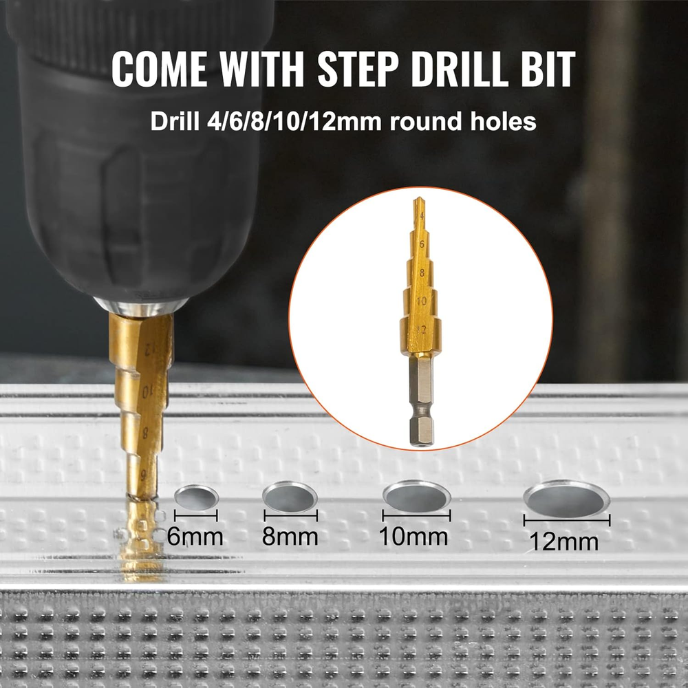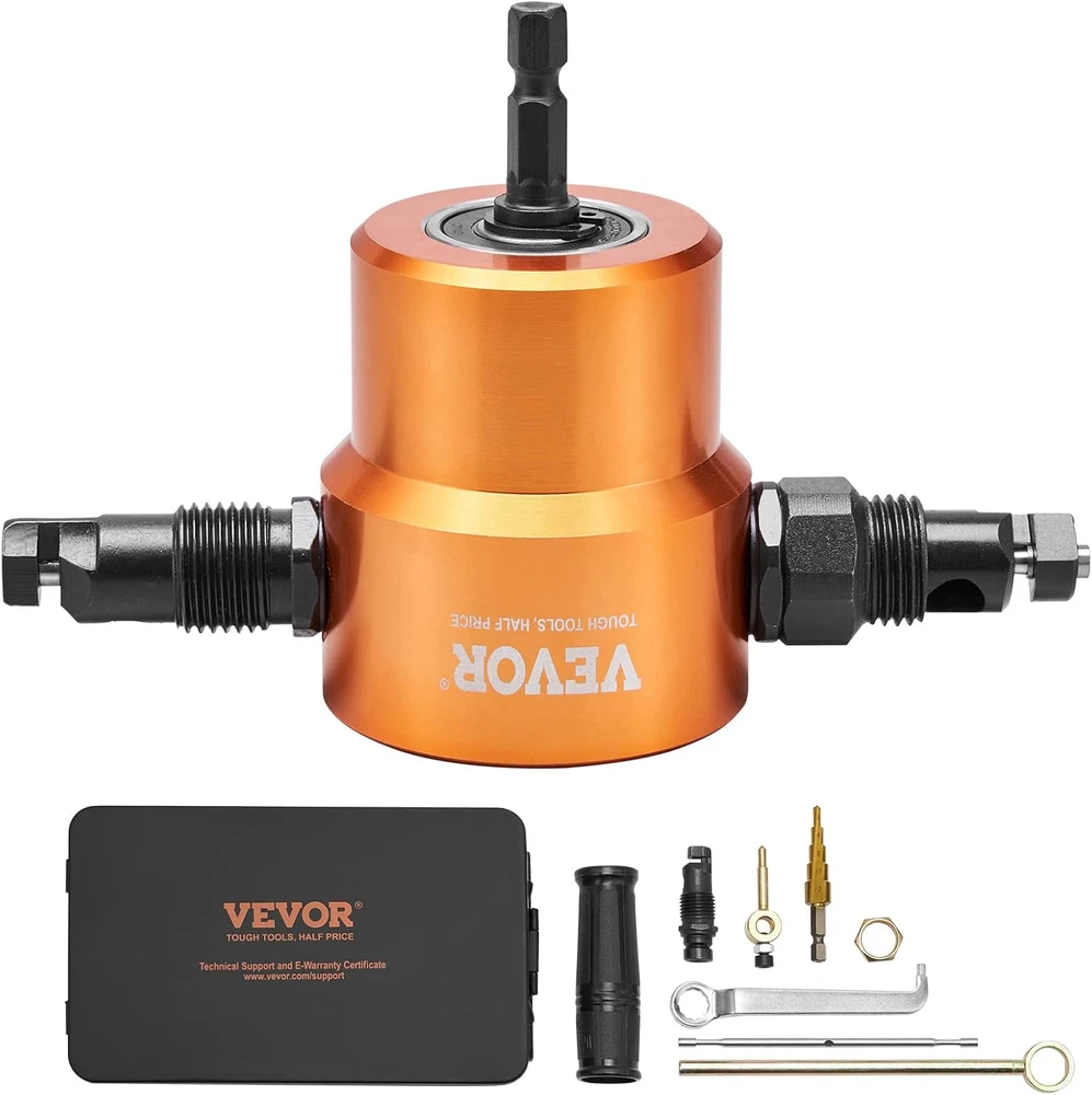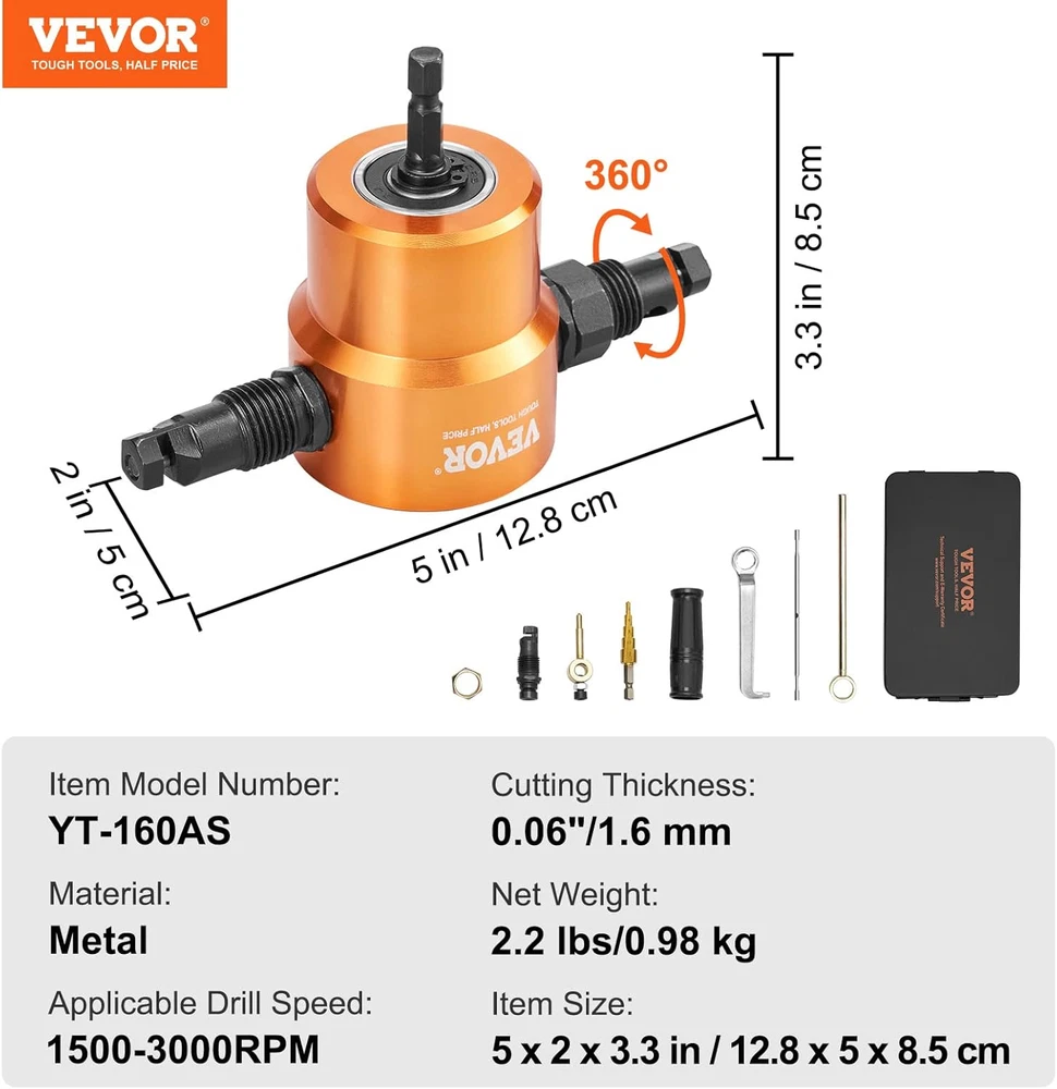 Combine and Adapt: Are you ready to drill? Effortlessly use our double head sheet metal nibbler cutter with a 1500-3000 RPM electric drill, drill press, or punching and cutting machine. Its high adaptability makes it perfect for automotive and household repairs, cutting various materials with precision. Cut Without Restrictions: When paired with an electric drill, this double head sheet nibbler can easily cut through carbon steel plates, stainless steel, copper plates, aluminum plates, plastic, and wood. It can cut through a maximum thickness of 0.06"/1.6mm for carbon steel plates, 0.05"/1.2mm for stainless steel, and 0.08"/2.0mm for plastic and wood. Flexible Cutting Options: With a 360-degree rotating cutting head, our metal nibbler drill attachment is perfect for cutting straight lines, curves, circles, and various shapes. It offers a cutting radius of up to 0.47"/12mm, ensuring exceptional precision and flexibility. Drill a Starting Hole: Easily drill smooth and burr-free circular holes with diameters of 0.16"/0.24"/0.31"/0.39"/0.47"(4/6/8/10/12mm) using our step drill bit. This tool allows for secure one-handed operation, ensuring precise and flawless results. Built to Tough: Our nibbler attachment kit comes with an HSS cutting blade, which is strong and does not easily break. The alloy steel nibbler is resistant to impact, wear, and tear. Plus, the semi-circular double-headed design ensures easy switching and a long service life. Note: NOT suitable for corrugated steel. Specifications Item Model Number: YT-160AS Material: Metal Applicable Drill Speed: 1500-3000RPM Cutting Thickness: 0.06"/1.6 mm Net Weight: 2.2 lbs/0.98 kg Item Size: 5" x 2" x 3.3" / 128 x 50 x 85 mm Package Content 1 x Double Headed Sheet Nibbler 1 x Step Drill Bit 1 x Wrench 1 x Plastic Handle 1 x Cutting Round Accessories 1 x Iron Tool Box 1 x User Manual