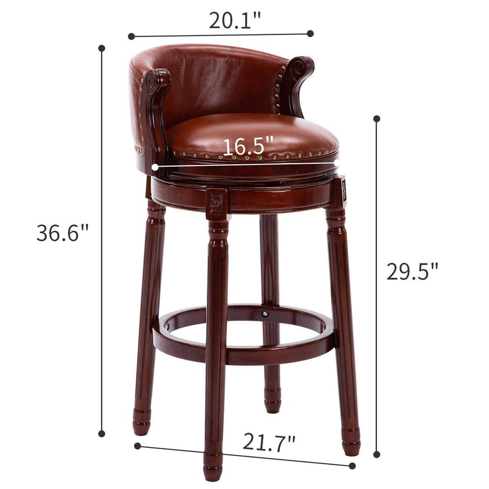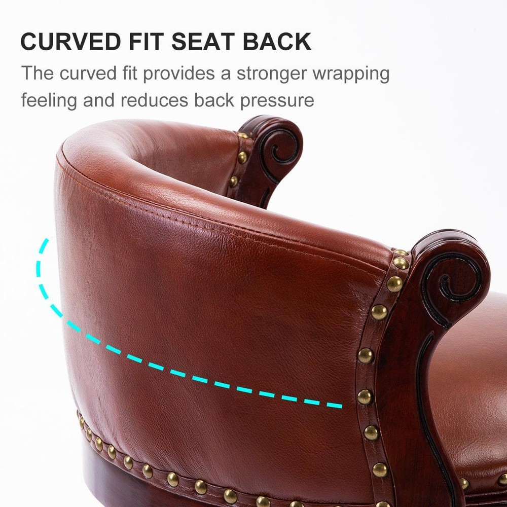These bar stools are a fantastic blend of style and comfort! The cow top leather seat is soft yet supportive thanks to the high-density sponge, while the curved wooden backrest adds extra comfort. I love the 360-degree swivel—it makes them perfect for kitchens, bars, or even a home office. The sturdy wood construction feels durable and looks great. The 29.5" height fits most counters perfectly, and the eco-friendly materials are a nice bonus. Highly recommend for anyone wanting a mix of elegance and functionality!