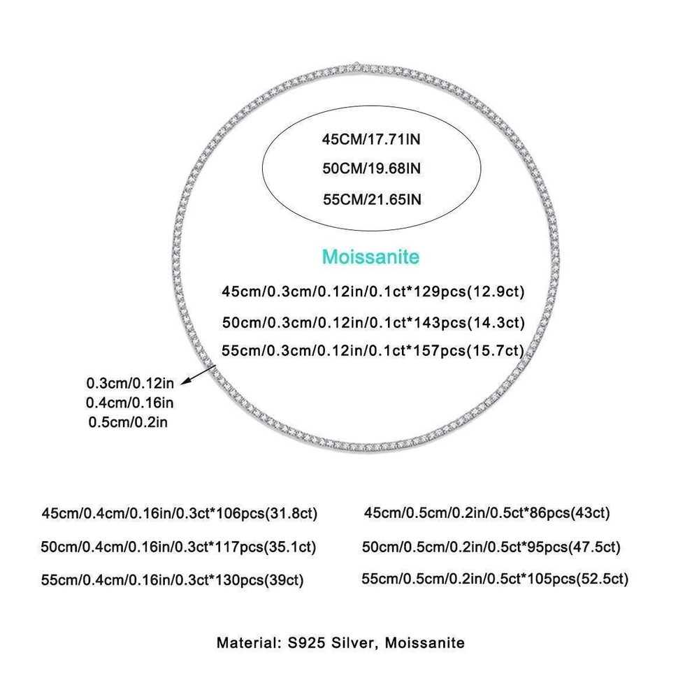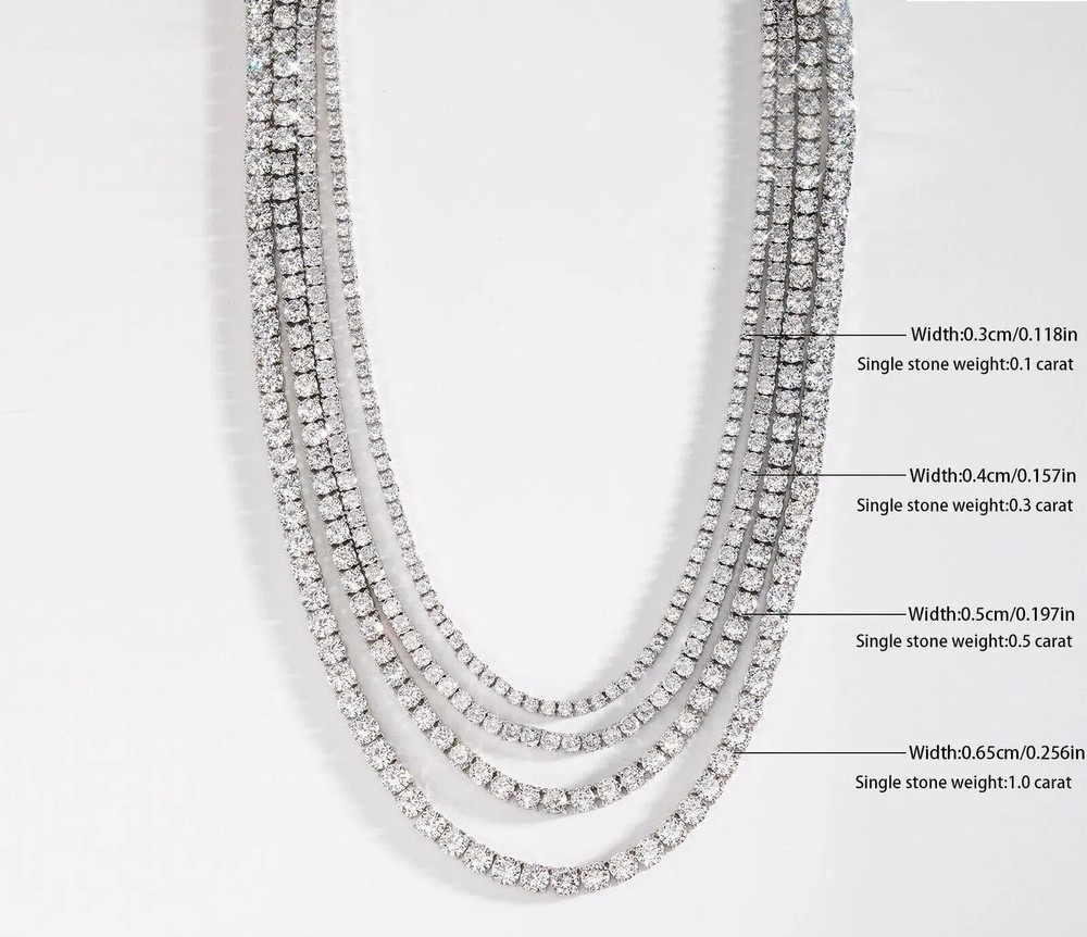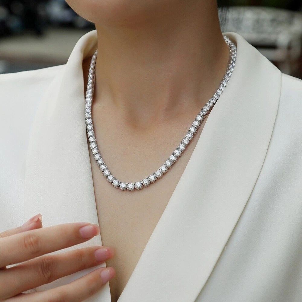 Brand: Unbranded Main Stone: Moissanite Metal: Sterling Silver Closure: Box Number of Gemstones: N/A Chain Type: Tennis Chain Theme: Beauty Handmade: Yes Setting Style: Prong Country/Region of Manufacture: China Style: Chain Type: Necklace Main Stone Color: White Main Stone Shape: Round Country of Origin: China Base Metal: Fine Silver Main Stone Creation: Lab-Created Occasion: Anniversary, Birthday, Christmas, Engagement, Mother's Day, Valentine's Day, Wedding Cut Grade: Excellent Secondary Stone: Moissanite Necklace Length: 18 in 20 in 22 in 24 in Features: Nickel-Free Metal Purity: 925 Color: White Gold