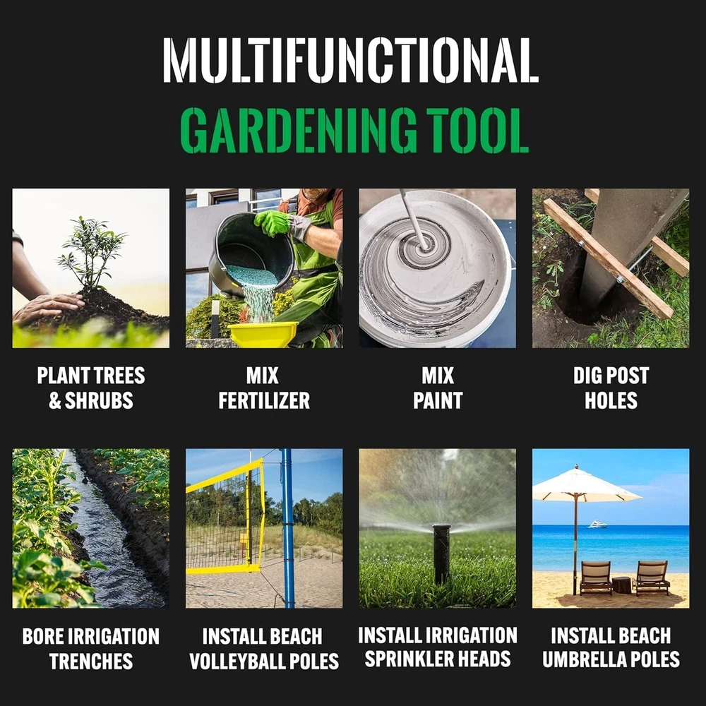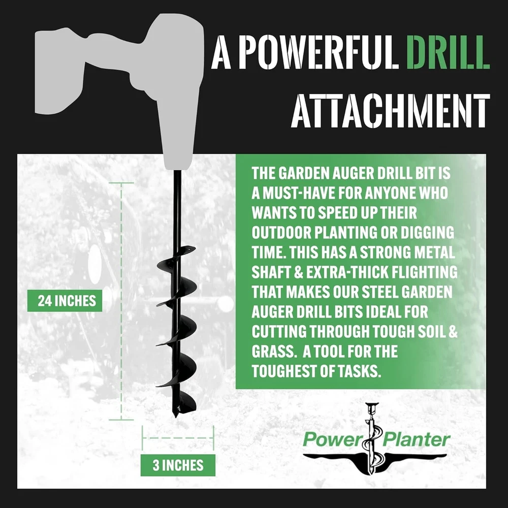 Extended Length Garden Auger Drill Bit, 3" x 24" with 3/8" Non-Slip Hex Drive, Auger Drill Bit for Planting Bulbs and Potted Plants, Garden Digging Tool for Dirt, Clay, Soil and Sand POWERFUL AUGER DRILL BIT: Our solid steel auger drill bit has a 10-gauge spiral flighting that chews through tough dirt and grass when planting bulbs, vegetables, bedding plants, and 3″-4 potted plants. Its practical design has been shown to speed up your planting/digging time by 500 percent. A garden digging tool for planting smarter, not harder! MULTIFACETED TOOL: Our specially-designed auger drill bit is perfect for various home project applications. Use this powerful drill attachment with (at least 18V) hand drill not just for gardening but also for mixing paint and mortar. Our augers with solid steel shafts and extra-thick flighting are alternatives to post hole diggers, bulb planters, or shovels for digging holes. PERFECT FOR ALL TYPES OF SOIL: Our patent-pending ground auger bit is effective for drilling into the dirt, clay, rocky soil, and sand. The auger bit extension works efficiently and requires significantly less physical force to operate. Our augers will help you complete your task more efficiently, whatever soil or ground you are working on. READY TO USE: Our auger's 3/8-inch non-slip hex drive can fit most cordless or electric drills. Simply tighten the drill chuck to secure the auger, and you're ready to dig. Its extended shaft will help save your back when digging holes. This contractor grade HD auger also includes an abrasion resistant tip, extending life of the unit by 3-4X. These augers are designed only for use with drills, not handheld and impact drivers. : Our company is a third-generation family-owned auger manufacturer based in Illinois. We produce a variety of different sizes, models, and auger accessories. We stand by the quality of our augers and are committed to prioritizing the needs of our customers, such as property owners, DIYers, Gardeners, and outdoorsy people.