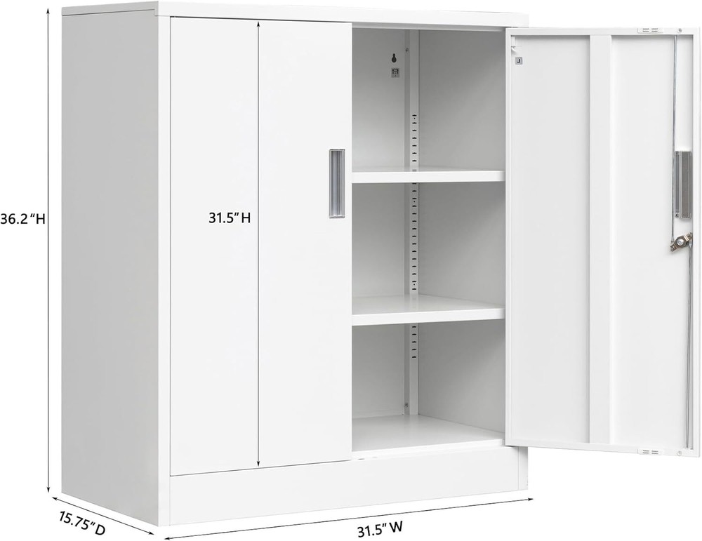 Product details: Adjustable shelf height: The two adjustable shelves of this metal storage cabinet offer adaptability and convenience. No matter what your storage needs are, you can create a unique storage space. Includes lock and two keys: The metal cabinet has a lock and two keys that come pre-installed in each of our garage cabinet, with doors and shelves. You can enjoy a second key that can be used by a co-owner or as a spare key in case of loss. Weight capacity: Each of the two shelves in this large storage cabinet can carry 180 pounds (about 81.6 kg) to meet your needs and hold as much as you need! Each storage shelf is made of heavy-duty cold-rolled steel, so you can use it with confidence. Metal cabinet size and assembly: 15.7 x 31.5 x 36 inches. Two adjustable shelves allow you to store any size of goods or documents. This garage storage cabinet is unassembled, to help you install it, we paired it with an installation video and installation instructions to help you assemble the cabinet. Usage Scenarios: If you are looking for a suitable metal cabinet for your store, garage, warehouse or school, then Besfur metal cabinet is the right choice for you. Brand BESFUR Color White Recommended Uses For Product Medicine, Keys, Tools, Files & Folders, Shoes Product Dimensions 15.75"D x 31.5"W x 36.2"H Special Feature Heavy Duty, Lockable, Adjustable Shelf Material Metal Style Regular Model Number of Doors 2 Shape Rectangular