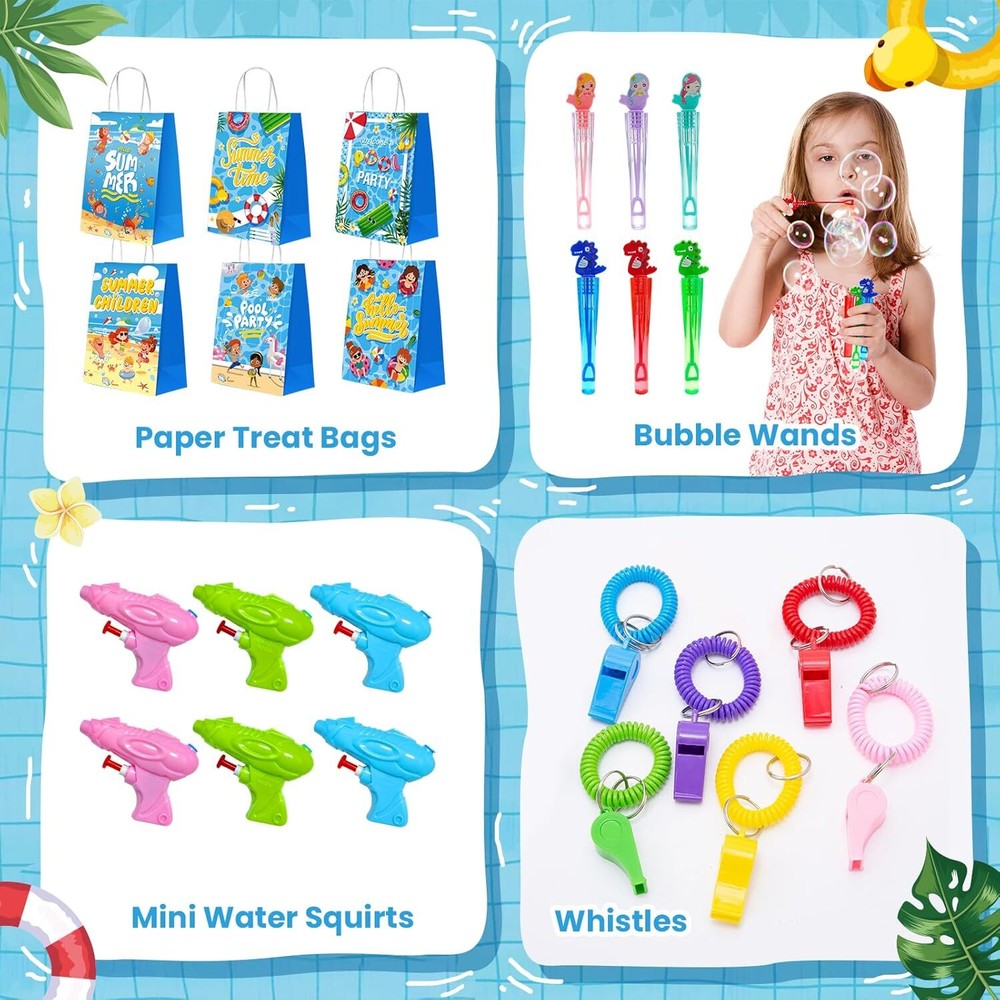 Pool Party Favors, Summer Beach Party Favors for Kids, Pool Party Decorations Supplies Including Beach Balls, Kids Sunglasses, Bubble Wands (36PCS Party Favors) Item Description About this item 【The Best Choice for Pool Party Favors】- 36pcs Pool Party Supplies include all the pool beach toys you need for beach and pool party fun! Including 6 kids sunglasses, 6 inflatable beach balls, 6 mini water squirts, 6 whistles, 6 bubble wands, 6 Paper Treat Bags. Abundant summer toys bring kids a happy and wonderful playing experience! Spend the summer fun time with your little ones! 【12'' Beach Balls & Colourful Sunglasses】- 6pcs 12'' Beach Balls, a favourite toy for kids, made of high quality PVC material. Soft enough and durable. The colourful sunglasses are designed for kids. Cute and fashionable. Lightweight and comfortable! Equipped with UV400 protective lenses to protect kid's eyes from strong sunlight while maintaining clear vision and natural color. Perfect for summer beach party, pool party, outdoor activity. 【Vibrant, Fun Summer Party Favors】- A wide variety of pool party supplies add much fun to your beach, pool party! Rainbow beach balls, neon kids sunglasses bulk, unique bubble wands, colourful water squirts and whistles and personalised paper treat bags, which makes your beach themed party more cool fun! It can instantly attract kid's attention at any summer party! 【Premium & Safe Pool Party Favors】- All meet US toy safety standards, perfect for kids aged 4-8, 8-12. High Quality Material. Safe and durable. Let kids enjoy a wonderful summer playtime easily and carefree! 【Perfect Summer Gift For Kids】- These pool party favor decorations are suitable to use for swimming party, beach pool party, lawn party, children's birthday party, summer holidays, pool party decorations, beach party decorations etc. Plus perfect for birthday goodie bag stuffers, treasure box prizes, classroom rewards, carnival prizes, pinata fillers, and party giveaway items for kids. Let it bring more giggles and unforgettable memories to your guests this summer. › See more product details Payment Fast and Free Shipping Shipping safe payment via ebay . Return 30 Day's returns