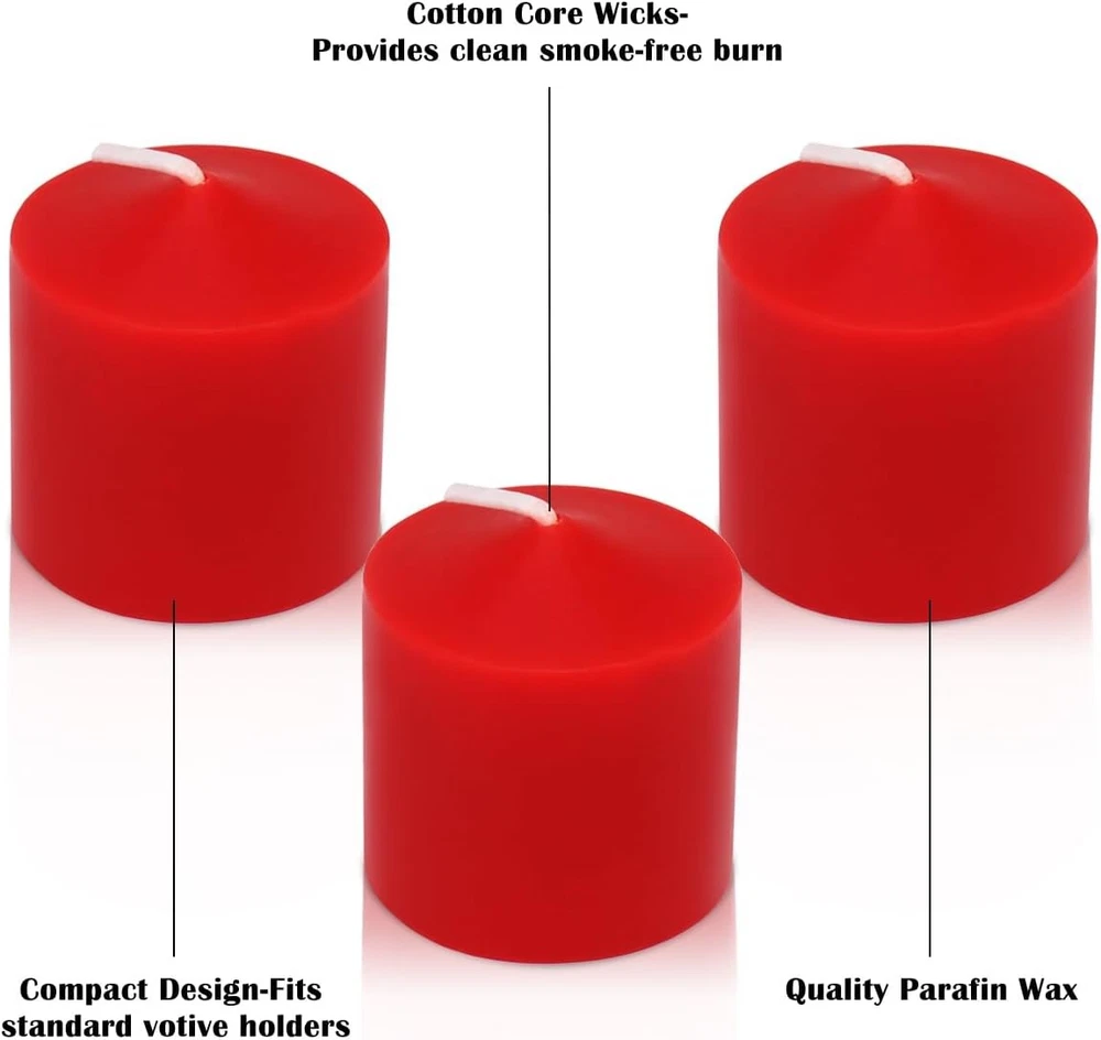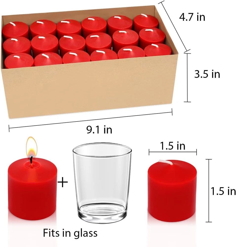 10 Hour Burgundy Votive Candles for Weddings Party 1.5 Inch, 36 Pack, Red Product Details Brand: Mi Ka YIa Color: Red Product Dimensions: 1.5"W x 1.5"H Item Weight: 2.8 Pounds Number of Items: 36 Scent: Unscented Are Batteries Included: No Indoor/Outdoor Usage: Indoor Specific Uses For Product: Wedding, Home, Restaurant, Hotel, Spa, Church Shape: Round Material: synthetic, Wax Container Material: metal Occasion: Wedding, Christmas, Thanksgiving Seasons: All Season Special Feature: Long Burning, Clean Burn, Smokeless Style: Traditional Wick Quantity: 1 Theme: Floral Package Information: Box Unit Count: 36.0 Count Embellishment: Bow Candle Type: Votive Candle Item Diameter: 1.5 Inches Size: 1.5 Inch, 36 Pack Manufacturer: Hengbing Part Number: 36x1.5J-RED Item Weight: 2.8 pounds Item model number: 36x1.5J-RED Special Features: Long Burning, Clean Burn, Smokeless Batteries Included?: No Batteries Required?: No Product Dimensions : 1.5 x 1.5 x 1.5 inches; 2.8 Pounds Item model number : 36x1.5J-RED Manufacturer : Hengbing Brand: Mi Ka YIa Color: Red Product Dimensions: 1.5"W x 1.5"H Item Weight: 2.8 Pounds Number of Items: 36 Scent: Unscented Are Batteries Included: No Indoor/Outdoor Usage: Indoor Specific Uses For Product: Wedding, Home, Restaurant, Hotel, Spa, Church Shape: Round Candle packs are a set of 36 votives packaged in a strong box, each candle is 1.5 inches high and 1.5 inches diameter. These 1.5 inch votive candles are made with high quality wax and lead-free cotton wick for a clean and steady flame. The small candles are a hand pour formed style candle, not a press formed style candle, so no candle crumbs are created. Unscented votive candles are an attractive white and do not give off a foul odor before or after lighting. They will burn brightly, cleanly and consistently for 10 hours, and do not produce any smoke. This great value candles perfect for decoration in dinners, weddings, parties and other special occasions, such as Christmas,halloween and thanksgiving ,etc. Often used in restaurant, hotel, spa and church. Please make sure you put this plain candles in an appropriate votive holder. If the votive candle holder is too big for the candle the wax will run, it will not burn evenly and burn faster than the 10 hour estimate. After a votive candle burns, it is very easy to remove the metal wick base, so as not to leave a metal or plastic shell like the tealight candles and cause waste. The candles are packaged securely enough for long term storage of the candles. Please check all the boxes you receive, if it is damaged or lost, please feel free to contact us, we will provide you with meticulous after-sales service. Place it on a table or in a lantern with a glass holder to create creates a warm and romantic atmosphere to any occasion, sunch as wedding reception, garden, spa, bedroom, etc. If you put in a clear votive holder you'll get a bright light; If you put in a frosted votive holder you'll get a soft "romantic" type lighting. Note: 1.The candle wick comes laying flat on the candle. Just place it in the holder, THEN pull up the wick to light it ; 2.Must use with a proper votive holder; 3.Never leave open flames/fires unattended.