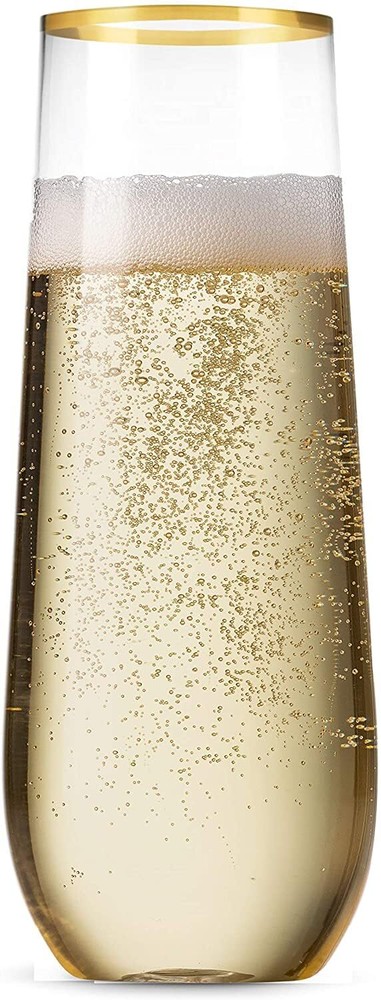 Add Elegant to your party with the GOLD RIM PLASTIC STEMLESS CHAMPAGNE GLASSES The gold rim fancy toast champagne flute is perfect for catered events, parties, bars, nightclubs or any other event where you require an economical alternative to permanent glassware. This disposable cocktail glasses are made of durable clear hard plastic. The Gold Rim Clear Plastic Flutes are Elegant and practical, Premium Plastic Disposable Cups a must-have for the frequent party hostess! use it for wine cups, champagne cups, mimosa cups, or water cup. ideal for bridal shower, bachelorette engagement parties, weddings, sophisticated events and New Year's Eve parties. PLEASE NOTE:The Gold Rim Stemless Flutes are not dishwasher safe Add elegant to your party with the Stemless Gold Rim Plastic Champagne Glass Flute Ideal for catered events, parties, bars, nightclubs or any other event Perfect for Mimosas, Bloody Mary's, Wine Glasses, Sodas, Cocktail Cups, Parfaits, Sundaes and Other Desserts 9oz Shatterproof Wedding champagne flutes Made of durable premium hard recyclable plastic, BPA-Free, Not dishwasher safe! Bulk Pack of 12 disposable champagne flutes plastic stemware saves you time and energy