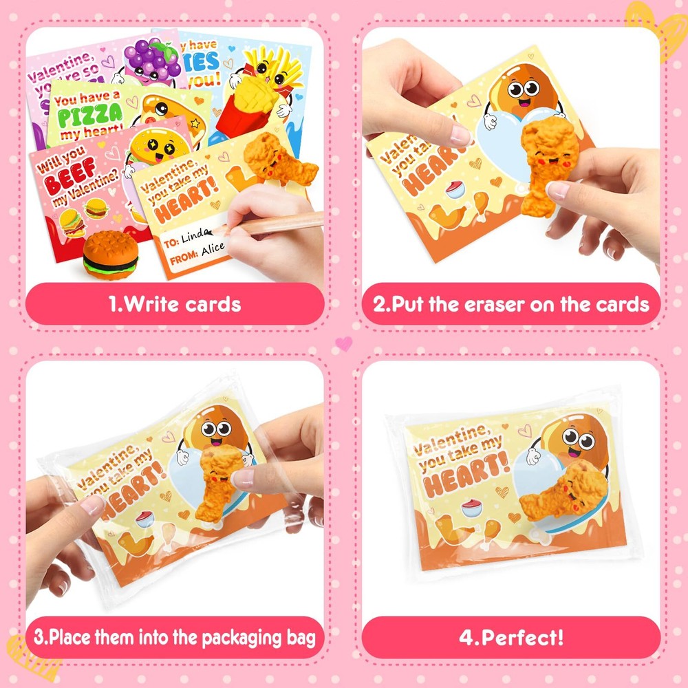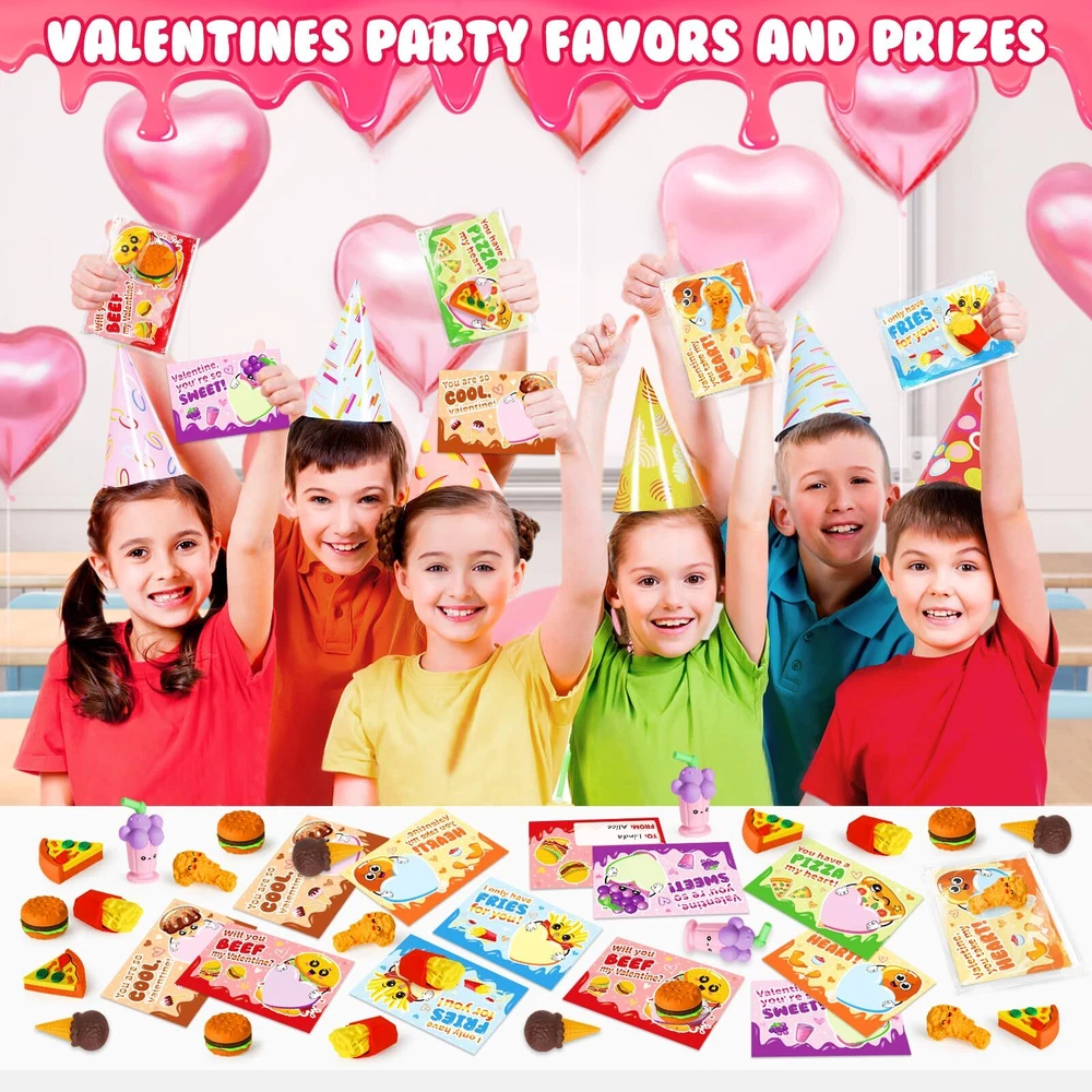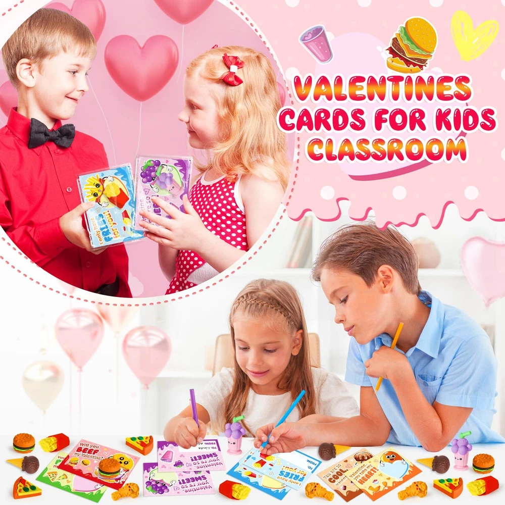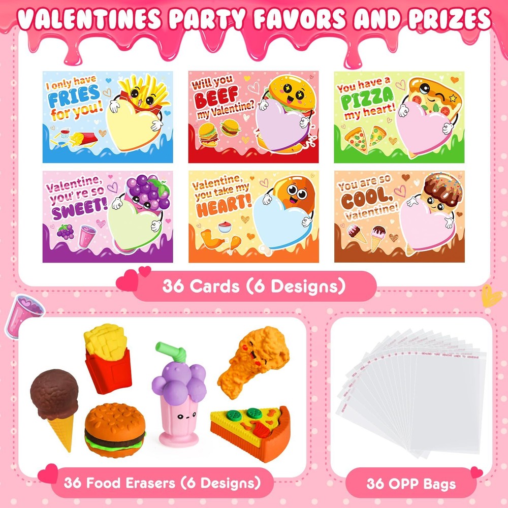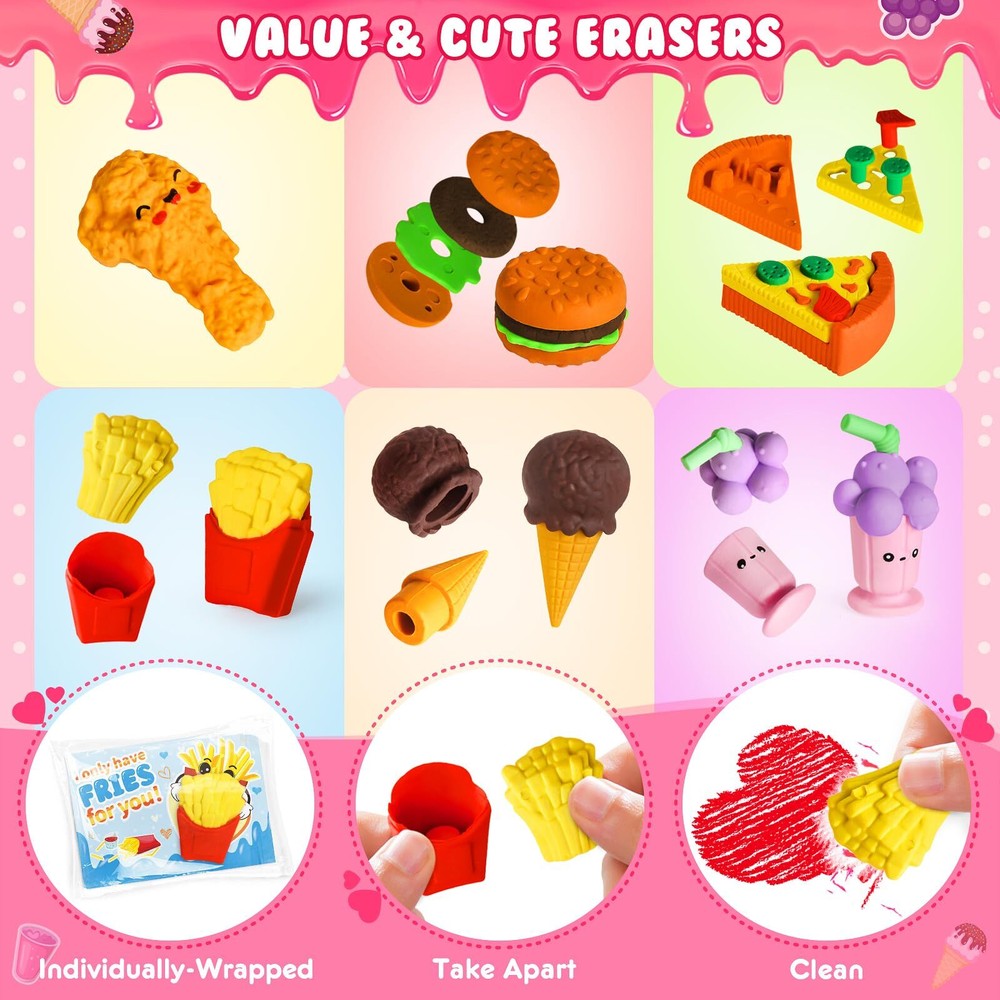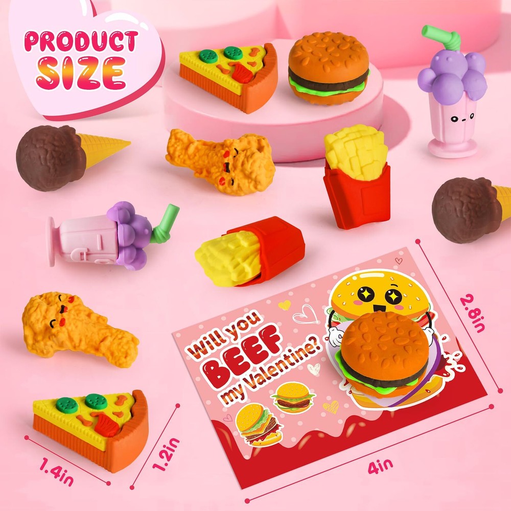 Valentines Day Gifts for Kids - 36 Packs Valentines Day Greeting Cards with 3D Food Erasers, Party Favors for Boys Girls Toddlers, Classroom Prize School Exchange Supplies Great Valentine's Day Gift Set - If you're looking for a unique and funny Valentine's Day gift for kids, our 3D erasers is the perfect choice! This set includes 36 pcs cards + 36 assembled food erasers. Each Valentines Card has a special blessing that matches the food erasers. Quantity enough for your child to share with classmates and teachers. Let’s prepare interesting Valentine’s Day gifts for the kids! Unique 3D Food Erasers - Each eraser is individually package, about 1-2'', entertaining way to put mistakes away, improve children's learning interest, helps kids develop good behavior. Funny 3D erasers can be taken apart and reassembled again, inspire kid's imagination and creativity, also improve logical thinking ability, fine motor skill, hand-eye coordination. Funny Card Design - Compared with traditional Valentine's Day cards, our cards add more lovely cartoon elements and rich colors, making your child's gift stand out. Each Valentines Card has a cute, humorous messages that uniquely match the erasers. Get ready to write blessings on the card and exchange it on Valentine’s Day, will bring endless fun to the kids. Excellent Educational Toys - For the health and safety of children, we use high demanding quality standards. 3D food erasers made of safety rubber materials, non-toxic, non-BPA. And the cards part is made of high quality coated paper, which is Clear printing and bright colors. The entire set of products has passed the children's product safety test and complies with US toy standards. Fit for Various Occasions - This great value set can realize the 3 in 1 functions of playing, educating and giving gifts. Ideal gifts for kids valentines day gifts, school event prizes,valentines class exchanging gifts and other. We believe kids will like this, but if you are not satisfied for any reason, please let us know and we will refund your amount.