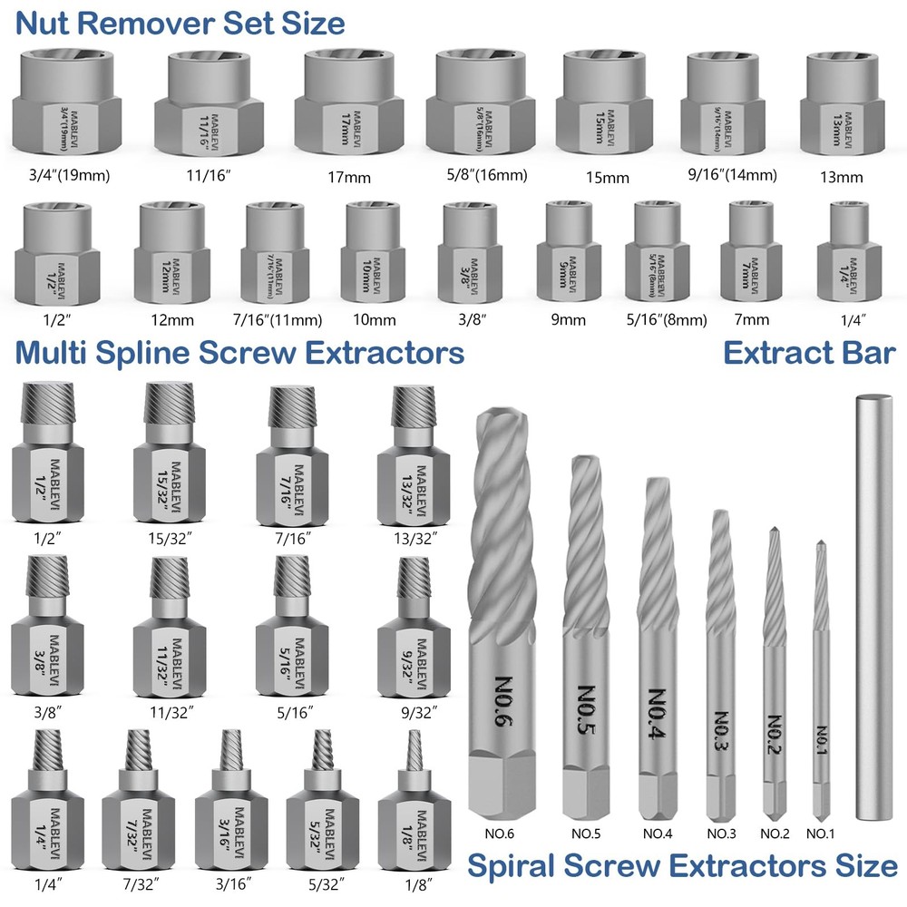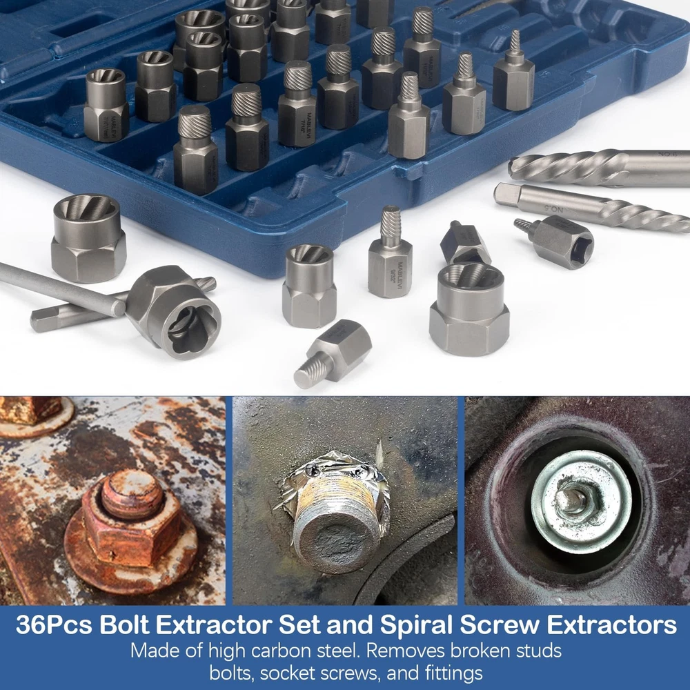 Why choose 36pcs Screw & Bolt Extractor Set? The extractor tool kit is suitable for removing most damaged, frozen, rusted fasteners including bolts, nuts, and screws, saving your time, effort, and frustration when dealing with stubborn or damaged fasteners. The inner reverse spiral groove of easy out bolt extractor set is designed to provide maximum grip, the more turns, the tighter the collet. The outside edges of the stripped screw extractor set are designed to "cut" into the damaged bolt's head to allow it to rotate and ultimately extract it. The latest version of the 2-in-1 functional screw extractor kit can be directly connected with a wrench, which is more convenient and quicker. Specifications: The screw bolt extractor remover contains 16 pcs nut remover, 13 pcs multi-spline screw extractors, 6 pcs spiral screw extractors, and a center punch bar, which meets almost all your needs. 🔧Versatile Combination: 36 Pieces screw & bolt extractor set with a center punch bar, including 16 pcs nut remover, 13 pcs multi-spline screw extractors, and 6 pcs spiral screw extractors. 🔧Bolt Extractor Set: Each extractor is made of high-hardness chrome-molybdenum steel for superior durability and longer life. It will easily extract damaged bolts, nuts, and screws even if they are stripped, rusted, or frozen. 🔧Damaged Screw Extractor Set: Spiral flutes are designed to embed themselves deeper into the metal as you turn the tool, so as the fastener resistance increases, the extractor's grip increases. 🔧Easy Out Bolt Remover Kit: Suitable for both power tools and hand tools. The double-head screw extractor set can be connected directly with a wrench, without the need for a connecting sleeve. Solve the problem of difficulty in removing damaged bolts in tight spaces. 🔧Reliable Extractor Brand: Heavy duty blow molded case for easy access and portability, perform maintenance like a pro anytime anywhere. will repair and replace any defect, without charge, and without waiting.