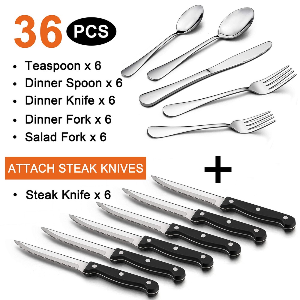 Set for 6, the flatware set consist of 6 of each dinner spoons, dinner knives, dinner forks, dessert forks, teaspoons, plus 6 steak knives, ideal for family daily use, restaurant, party, wedding, entertaining and more Attach 6 Steak knives, serrated blade is sharp enough to allow a smooth slice on all meat, ergonomically triple-rivete handle designed perfectly fit your hands, suitable for kitchen, dinner party, bbq, camping, thanksgiving Stainless steel silverware, 36pc flatware set with steak knives are made out of quality stainless steel which ensures durability, sturdy structure, rust resistant, prevents you from having to make additional investments Modern silverware, modern and classy appearance, without any redundant decoration, mirror finished keep the set shiny all the time and look as good as new, elegant flatware match well with your tableware and will provide you a fine dining experience Nice workmanship, this metal silverware has nice weight, not too light or too heavy, provide you a firm grip and well balance on hand, smooth edges without rough spots ensure your safety, sleek surface easy to clean as well dishwasher safe to save your time