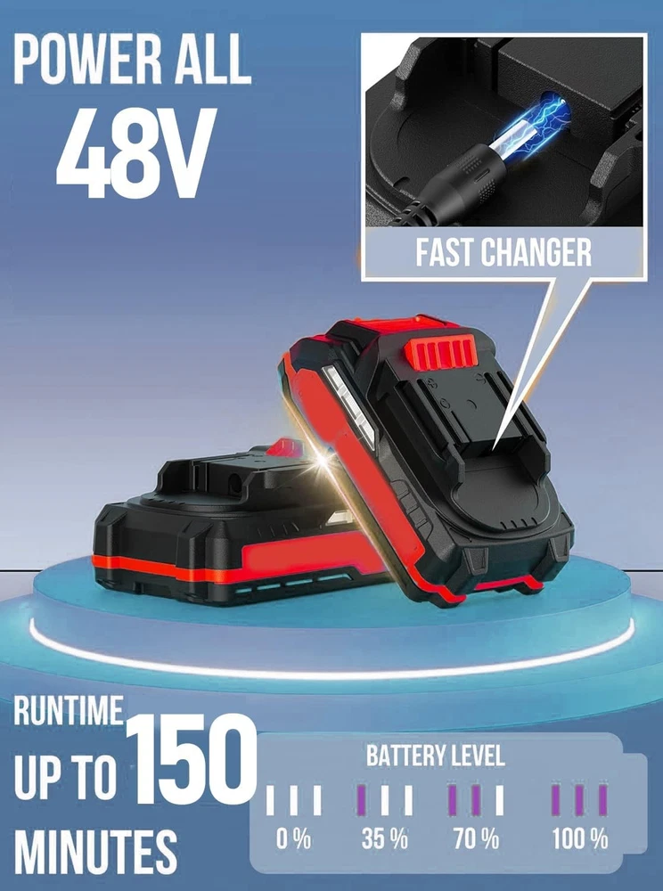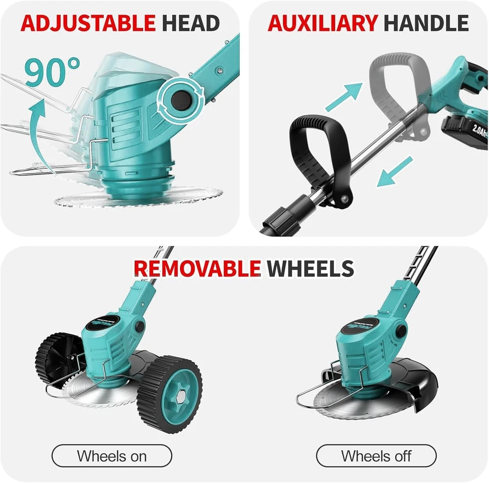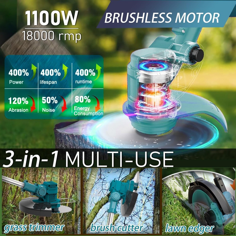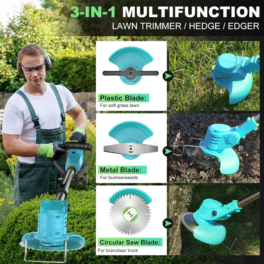 Product Description About this item 【3-IN-1 Multi-use】 Effortlessly switch between grass trimmer, lawn edger, and branch pruner with a 90° pivoting head—ideal for maintaining yards, gardens, and hard-to-reach areas. The built-in support wheel provides stability during edging and heavy-duty cutting, gliding smoothly over uneven terrain while reducing arm strain. No need for separate tools—one machine handles trimming, edging, and even small branch pruning (up to 1” thick). 【1800W PURE COPPER BRUSHLESS MOTOR】 Powered by a premium brushless motor (18,000 RPM max speed), this cordless weed wacker delivers 30% more torque than standard motors, tackling thick grass, tough weeds, and woody shrubs with ease. Pure copper construction ensures low noise (≤75dB), minimal vibration, and extended lifespan—perfect for both DIY gardeners and professional use. 【DUAL 48V 6.0AH HIGH-CAPACITY BATTERIES】 Includes 2x 48V 6.0 Ah lithium-ion batteries (with fast charger) for up to 90 minutes of continuous runtime (per battery at low speed). Cordless design eliminates tangled extension cords, while universal compatibility with all 48V brand tools lets you swap batteries seamlessly for uninterrupted battery operated work in large yards 【6-INCH BLADE Cutting + 7 ACCESSORIES】 Equipped with 2 metal blades (for shrubs/branches), 5 plastic blades (for soft grass), and a 6-inch saw blade (for precise edging). The quick-release mechanism allows tool-free blade swaps in seconds, adapting to tasks from delicate string trimming to heavy-duty brush cutting. Includes 1 installation wrench for hassle-free setup." 【ADJUSTABLE ERGONOMIC DESIGN】 The telescopic handle (36-48” adjustable) and 90° rotating cutting head customize to your height and posture, eliminating back strain during long use. Lightweight at 6.2 lbs (with battery) and balanced with the support wheel, this cordless weed trimmer is easy to maneuver for seniors, women, and users of all heights—even in tight spaces or on slopes. 【SAFETY & CONVENIENCE FIRST】 Dual safety locks prevent accidental starts, while a debris splash guard shields you from flying grass/rocks. The automatic line feed (for plastic blades) ensures uninterrupted trimming, and the compact, foldable design fits easily in sheds or car trunks. Tool-free assembly means you’re ready to work in minutes—no complex setup required 【PRO-GRADE PERFORMANCE & WARRANTY】 Engineered for durability with a weather-resistant exterior and maintenance-free brushless motor. Backed by a 2-year warranty and lifetime technical support, this battery powered string trimmer includes everything you need: 2 batteries, charger, blades, and wrench. Perfect for garden enthusiasts who want a versatile, reliable tool that handles every trimming challenge Cordless Weed Wacker with versatile features and cordless design 1> Maximum length can extend to 55 inch 2> Can be folded to a compact 25inch for convenience 3> The working head can rotate up to 90 degrees maximum. Provide larger power for cutting 2 pack 36V 4.0AH Battery 36V High-Power Weed Trimmer Equipped with a high-power pure copper motor,providing high harvesting efficiency 3 in1 multifunction Brush Cutter ,Weed Wacker , Trimmer Edger Park maintenance Crop pruning Garden trimming Outdoor weed control