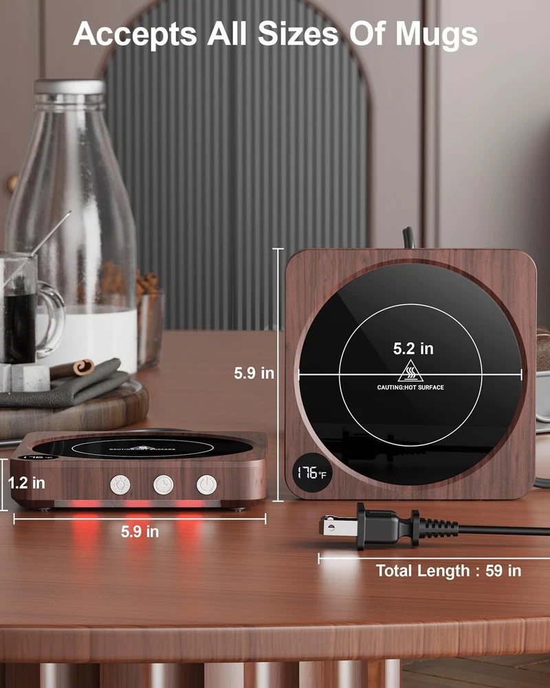 Temperature As You Wish: 36W coffee mug warmer provides superior heating performance to keep your coffee or drink at the desired temperature. Warm your beverage at a desirable temperature of 176℉/150℉/130℉ Safety Is The Priority: A: LEDs and temperature display prevent accidental while heating. B: Waterproof heating plate for safe and easy clean. C: 4-hour auto shutdown and 2-12 hour timer. D: UL certified for guaranteed quality 2-12H Timed Auto Shut Off: Enjoy convenience and safety with our auto shutdown timer. The coffee warmer automatically turns off after 4 hours by default, and you can customize the shutdown time from 2 to 12 hours Larger Heating Panel: With a 5.2-inch heating plate area, coffee warmer for desk is suitable for 99% of cups and beverages. It accommodates most cup sizes, Our coffee heater can achieve a suitable temperature without flat-bottomed cups Holidays and Special Events: Surprise your loved ones with our beautiful and functional coffee mug warmer, No coffee lover can resist these charming coffee accessories
