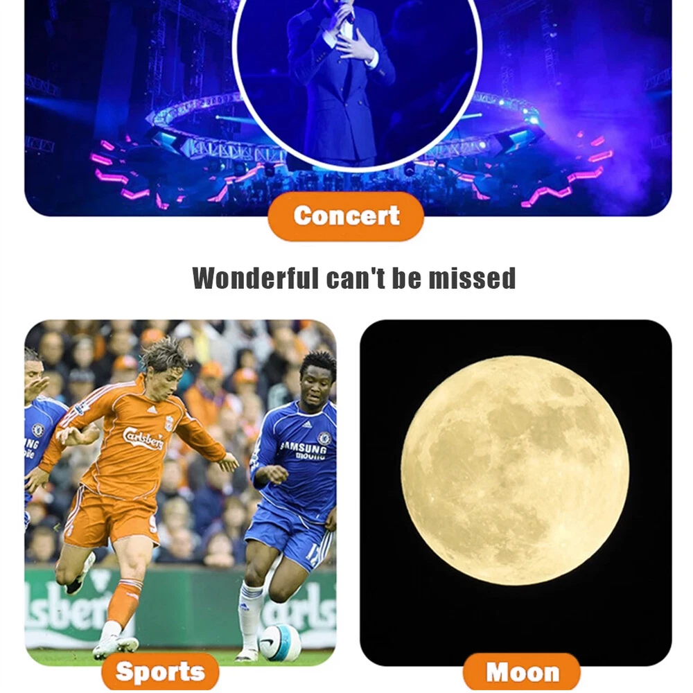 Product Description Features: The telescope can be used as a monocular. Fit most kinds of mobile phones, include flip phones and bar phones, Phone has back camera, can be connected to the telescope through the clip. Mobile phone's quality of imaging can be improved evidently. Applicable to watch the game, concerts, tourism, observe animal lovers, news reporter long-distance shooting etc. Private detective taking pictures forensics, geological exploration, forestry management, railway port scheduling and etc. Specifications: Name: 36X Phone Camera Telephoto Lens Lens size: 145mm Magnification: 36 times Appearance material: Alloy Exit pupil diameter: 2.4mm Exit pupil distance: 7.7m Field of view angle: 8.8° Eyepiece: Ed lens Prism: BAK4 Objective lens coating: Full band multilayer coating Notice: Please use it care, because lens are adjusted accurately, if it drops or hit, the field of vision maybe not matched and picture will deflect ,nbsp Please don't drop into water. If it drops into water, please repair it quickly. Please don't look at the sun absolutely, your eyes may be ache and blind sometimes. Package includes: 1 x Telephoto Lens 1 x Clip 1 x Clean cloth Shipping Returns Contact Us Payment 1. Items sent from US warehouse. 2. Receiving time = Processing time + Shipping time. 3. Pro cessing Time: Around 1-2 business Days. 4. Shipping Time: 3-5 business day. it may have a little delay during some holiday (such as Christmas), any problem, please feel free to contact. 1. 30 days warranty from the purchased date. Please contact us via email before returning the defective item. 2. Our warranty does not extended to any product that are physically damaged or that are not under normal operating conditions as result of misuse or improper installation on the buyer/user's part. 3. Return items should include the original packaging and all accessories. buyers MUST contact us for the returning address. 4. In all cases, buyers pay shipping fees at their own cost to return products for exchange or refund. We will be responsible for the postage of replacements. Refund will be made upon receipt of the returned item. If you have any question, please e-mail us immediately, we will reply you as quickly as possible. We care about our valued customers, and will always try to help you. We accept all verified payment from eBay. Shipping 1. Items sent from US warehouse. 2. Receiving time = Processing time + Shipping time. 3. Pro cessing Time: Around 1-2 business Days. 4. Shipping Time: 3-5 business day. it may have a little delay during some holiday (such as Christmas), any problem, please feel free to contact. Returns 1. 30 days warranty from the purchased date. Please contact us via email before returning the defective item. 2. Our warranty does not extended to any product that are physically damaged or that are not under normal operating conditions as result of misuse or improper installation on the buyer/user's part. 3. Return items should include the original packaging and all accessories. buyers MUST contact us for the returning address. 4. In all cases, buyers pay shipping fees at their own cost to return products for exchange or refund. We will be responsible for the postage of replacements. Refund will be made upon receipt of the returned item. Contact Us If you have any question, please e-mail us immediately, we will reply you as quickly as possible. We care about our valued customers, and will always try to help you. Payment We accept all verified payment from eBay. You may also like 2Pcs Dryer Roller Wheel Drum Support Kit Replacement Part For Maytag Whirlpool 18.91 USD 3.99 USD 8PCS Hair Clipper Cutting Guide Combs With Metal Clip Replacement Tools For WAHL 13.38 USD 3.99 USD Leather Cushion Face Cover Eye Foam Mask Pad Anti-Sweat For Oculus Quest 2 VR 15.94 USD 18 Grids Watch Tiny Parts Storage Box Plastic Repair Acc Container + Dust Cover 11.75 USD Metal Bead Eyeglass Chain Glasses Strap Holder Lanyard Sunglasses Non-slip 8.93 USD Soft Rubber Dust Blower Air Pump Cleaner Watch & Camera PCB Repair Cleaning Tool 4.61 USD 3.99 USD powered by