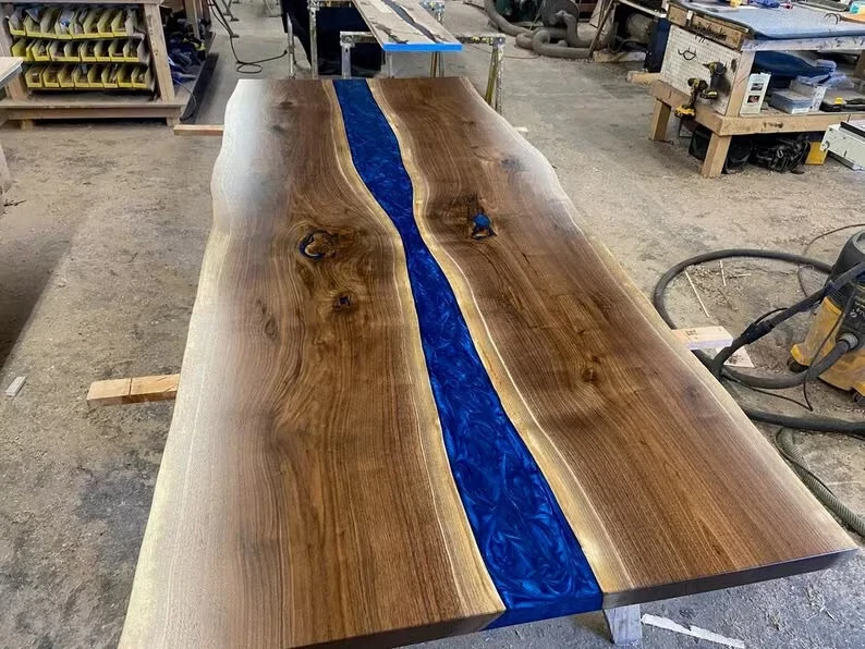 36"x24" Blue Epoxy River Table Top, Live Edge Wooden Dining Furniture Epoxy Tops