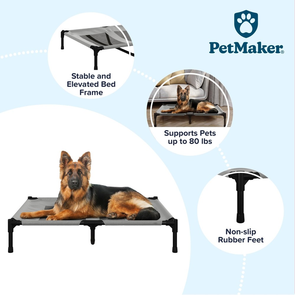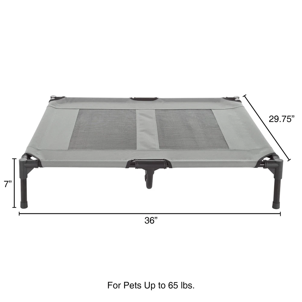 RAISED DOG BED - The large dog bed offers ventilation through its big mesh panel and body temperature regulation for your pet, as it keeps them off hot pavement, the ground, and cold floors. The outdoor bed supports pets up to 80lbs. INDOOR/OUTDOOR USE - The bed for dogs is both weather-resistant and equipped with non-slip rubber feet for both indoor and outdoor use. This dog furniture can be placed anywhere in the home, as well as on your porch, patio, or backyard. CARRYING CASE INCLUDED - This lightweight and portable dog cooling bed comes with a carrying case, sets up, and breaks down in minutes so your pet can always rest in comfort wherever your travels may take them. EASY CARE - Made of coated steel, durable canvas, and a mesh center panel, the waterproof outside dog bed cleans up with a hose or indoor handwashing with cold water. Use mild soap on the cooling bed for dogs, do not bleach, or use fabric softener. PRODUCT DETAILS - Materials: Mesh, Coated Steel, PVC Connectors, and Water-Resistant Canvas. Dimensions: (L) 36” x (W) 29.75” x (H) 7”. Durable Dog Bed Carrying Case Included. For Pets up to 80lbs. Color: Gray.