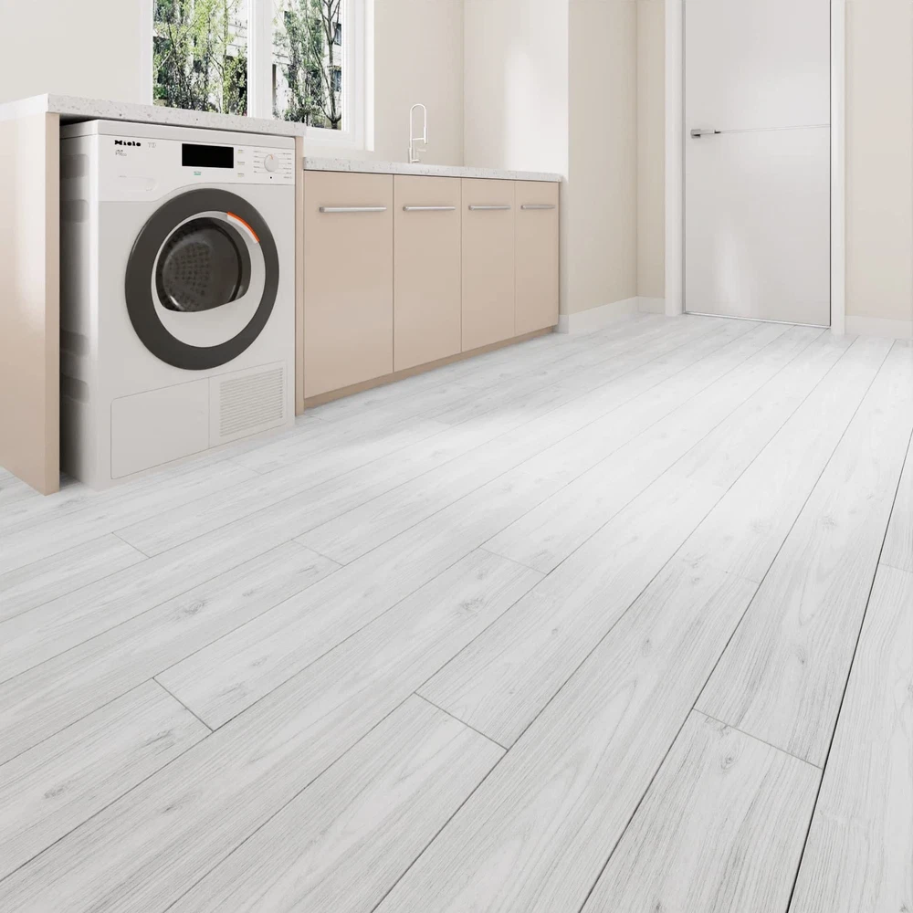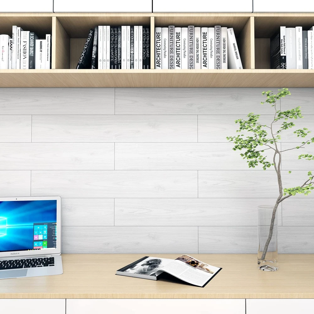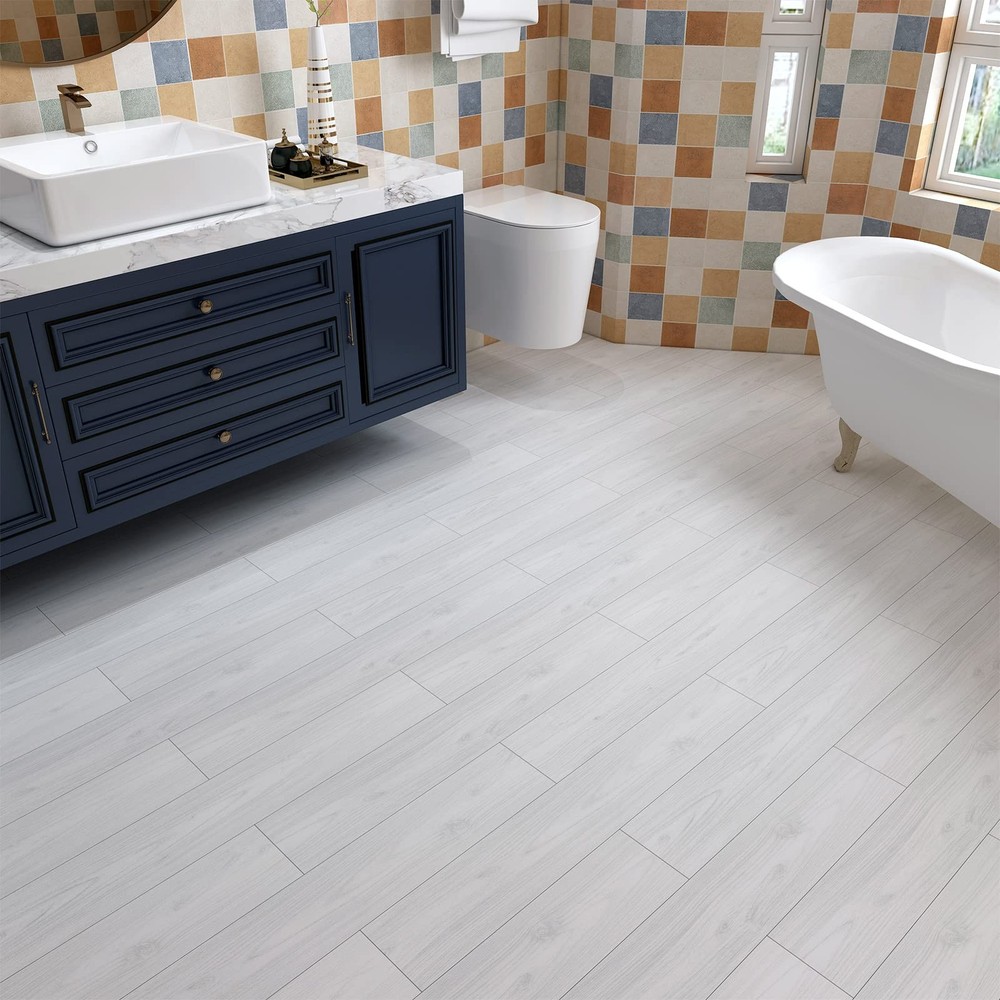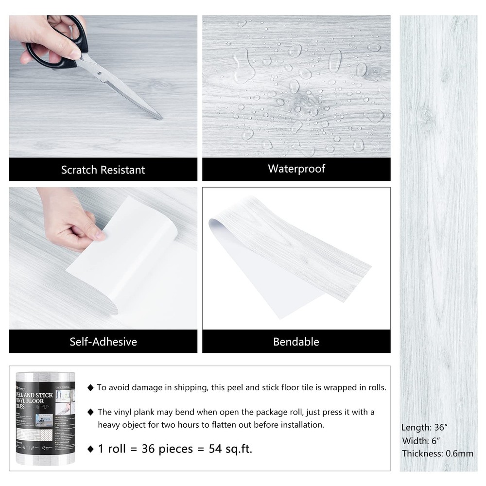 [SIZE] Length: 36 inch; Width: 6 inch [EACH PACKAGE CONTAINS] 36 Pieces [COVERAGE] 54 sq.ft [MATERIAL] Vinyl [COLOR] White wood vinyl flooring [STYLE] Modern [DESIGN CONCEPT] Natural wood looking and grain texture, bringing timeless charming for your home! [ADVANTAGES] 1. White Wood Vinyl Plank Flooring Tiles: Wood stick on floor tiles, laminate peel and stick wood flooring for kitchen bathroom bedroom. 2. White Wood Vinyl Plank Flooring Tiles: Easy to install, just peel and stick, no special tools needed. 3. White Wood Vinyl Plank Flooring Tiles: The vinyl flooring planks leave no sticky residue when removes, great temporary flooring for renters. 4. White Wood Vinyl Plank Flooring Tiles: Waterproof flooring, stain resistant, moisture-proof, flexible, easy to clean. 5. White Wood Vinyl Plank Flooring Tiles: This peel and stick tile flooring can be used in bedroom, kitchen, living room, dinning room, bathroom, laundry, nursery, dollhouse, playroom, cubicle, farmhouse, garage, basement, attic, kitchenette, gym, dorm, classroom, apartment and office flooring, walls. [PRO TIPS] 1. Measure the size of the floor surface before purchase, buy enough rolls at one time to avoid color difference. 2. Clean the surface before pasting. The adhesion will be the best if the surface is clean, smooth, dry and flat. 3. We recommend to avoid leaving too much water on the floor tiles while cleaning within two days after installation, which helps to maintain great adhesion for a long time. 4. The peel and stick floor tile wood effect is wrapped in rolls to ensure safety in shipping. The vinyl plank flooring may bend when open the package roll, just press it with a heavy object for two hours to flatten out before installation.