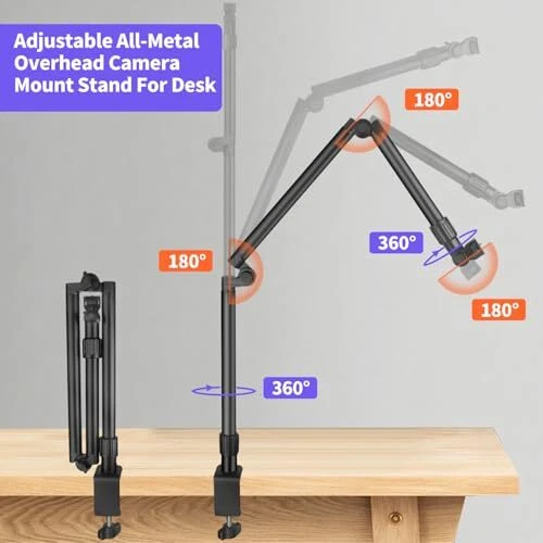 Return Policy Fast Delivery Trusted seller 37" Overhead Camera Mount Desk Stand, 3-Section 360° Adjustable Articulating Metal Arm with 1/4" Screw and Phone Holder, Foldable Webcam Stand for DSLR Camera Ring Light Projector Product Description Taller & Greater Load Capacity: Our overhead camera mount boasts an exceptional 37.4 inch/95 cm length, providing up to 3 times higher than its counterparts. Light stand can bear a load up to 11 lbs in a horizontal state and 22 lbs in a horizontal state High Quality: Three-Section mic boom arm is made of aluminum alloy, and c clamp is made of iron, longer service life. All-Metal webcam stand provides super safe and stable for your valuable devices Adjustable & No Shaking: The top and bottom of table stand are 360° rotatable, and each joint can be flexibly adjusted 180° bending. Our overhead phone mount with fixed gear solves the problem of the arm moving and falling over time due to gravity C Clamp Saves Space: Suitable for desks up to 2.4 inch in thickness, super clamp is a space saving tool to support the stand while keeping your desk clean and tidy. The rubber pads also prevent scratches on tabletop surfaces Wide Compatibility: Camera rig is suitable for light, microphone, projector, making it perfect for live streaming, video recording, Zoom meeting. Phone holder with a cold shoe provides extra convenience and can hold other devices to use at the same time Easy To Install: Package includes Camera Desk Mount Stand, C Clamp, Phone Holder. To install, secure C-clamp to table, install magic arm and adjust it to appropriate angle, then lock knobs. It comes with exquisite boxes making it an ideal gift for friends Shipping Returns Payment Shipping Shipping is FREE to all addresses other than APO/PO boxes in the lower 48 states. All our stock ships from US-based warehouses. Shipped via USPS or UPS (depending on location and package weight) Unless stated otherwise, all orders will ship within 24-72 hours of your payment being processed. Check our feedback to see the great reviews of FAST shipping we offer. Returns Seller does not accept returns Payment We currently accept payment via eBay managed payments only. Once payment is cleared, we will dispatch your shipment within 1-3 business days. Please refer to the "Shipping" tab for more information regarding shipping speed to your destination.