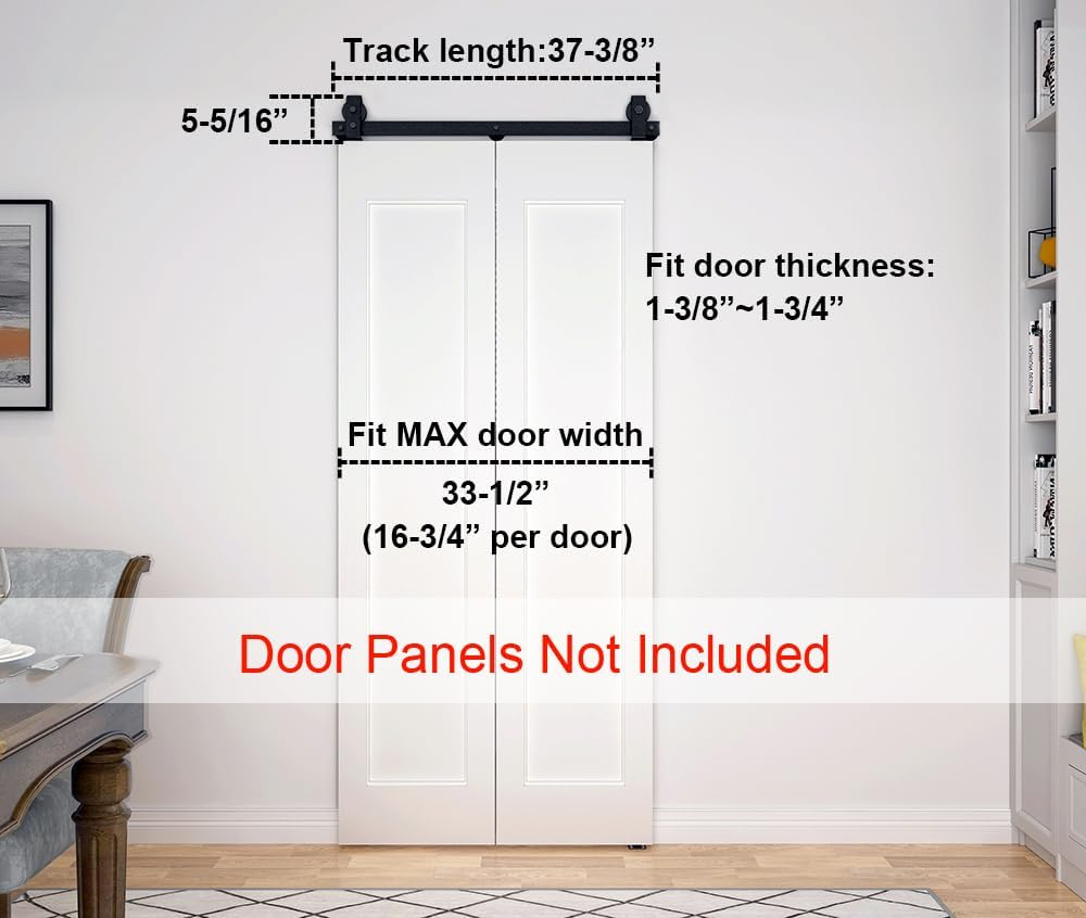 Hardware only,not including door panel Track length 37-3/8",Fit max door width 33-1/2"(16-3/4" per door);Fit door thickness: 1-3/8"~1-5/8";(DOORS NOT INCLUDED) Full set hardware including:37-3/8" track X1,StopX2,Track&wall connector X2,Floor guideX1,HingeX3,RollerX2 The height from top of the door to the top of the roller is 5-5/16" The gap between door and wall:Door closed:1"~1 3/16";Door opened:1/4"~3/8" Product Description DIYHD Bi-Folding Sliding Barn Door Hardware,Bifold Hardware and Door Sold Seperately This item is bifold hardware only,Door panel sold seperately(ASIN:B0CDKPLF2G) Track length Fit door width 37-3/8" track ≤ 33-1/2"(16-3/4" per door) 43 1/4" track ≤ 39-1/4"(19-5/8" per door) Technical Details Material Metal,POM Surface Rustic Black Fit door thickness 1-3/8"~1-3/4" Top door~top roller height 5-5/16" Top Mount Roller Kit Nylon wheels-Slide smoothly and quiet Fixed roller's location is adjustable Space saving Widely use Easy for installation Full set hardware Fixed roller with spacer X1 + Sliding roller X1 Roller&door connector X3 Track X1+Track&wall connector X 1 Set Floor guide X1 Hinge X3 Roller Floor guides Sliding track Gallary for reference,Door Panel Not Included Closed Half open Folded