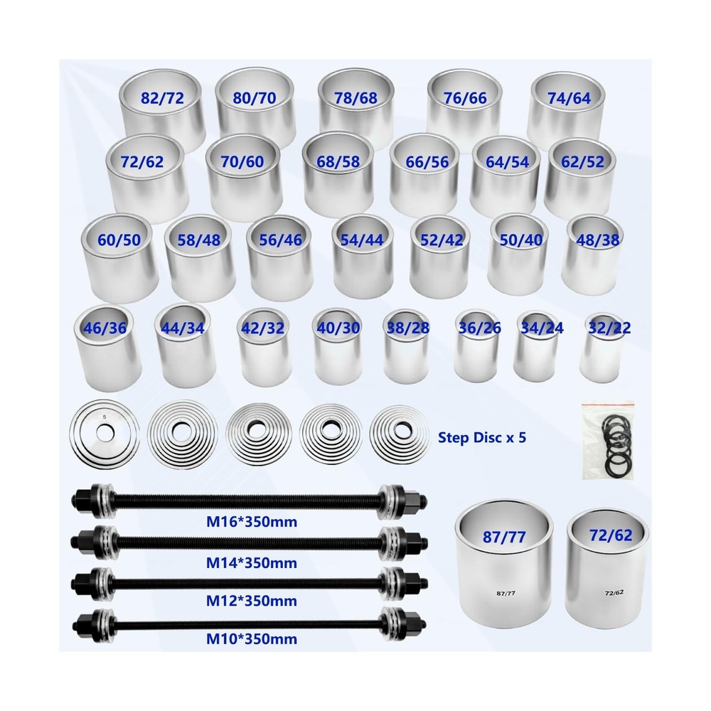 37Pcs Pull and Press Sleeve Kit, Bushing Press Kit for Most Engine Cars Vehicles, Universal Seal Bearing Bushing Removal Installation Tool Kit 4 Pulling Spindles with Nuts Case Description Features: Product Usage: Quickly and easily Removal and Installation of Bearings, Bushes, Seals and cut down the possibility of damaging the bearing or suspension housings, fits for automobiles and LCVs. Products include:28 x sleeves; 4 x pulling spindle M10, M12, M14, M16; 4x Stop plate discs adapter. Outside Diameter/Inside Diameter32/2234/2436/2638/2840/3042/3244/3446/3648/3850/40, 52/4254/4456/4658/4860/5062/5264/5466/5668/5870/6072/6274/6476/6678/6880/7082/7287/7772/62. Material:Forged by Alloy steel, Rugged and durable. Can withstand 3500N. At the same time, it has durability and corrosion resistance. Excellent Service: We are committed to providing the best professional tools and the best service for auto repair. If you have any questions, please don't hesitate to contact us. We provide 24-hour before and after-sales service. Product Details: Product Dimensions : 19.75 x 16.75 x 4.2 inches; 38 Pounds Item model number : KT6065A Date First Available : February 13, 2025 Manufacturer : KTTOOL Best Sellers Rank: #56,565 in Automotive (See Top 100 in Automotive) #19 in Bushing Tools #343 in Brake Tools #19 in Bushing Tools #343 in Brake Tools Customer Reviews: 4.2 4.2 out of 5 stars 10 ratings Delivery We Do Not Ship Outside of the Continental US. Return Policy All items qualify for returns within 30 days of receipt. Buyer is responsible for return shipping on any item that is not damaged. Feedback We take our reputation seriously, we buy and sell online, so we understand the value of trust. If you are unsatisfied with your order, please contact us and we will work with you to resolve it to your satisfaction.