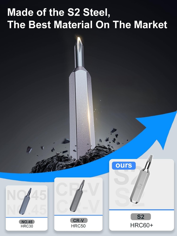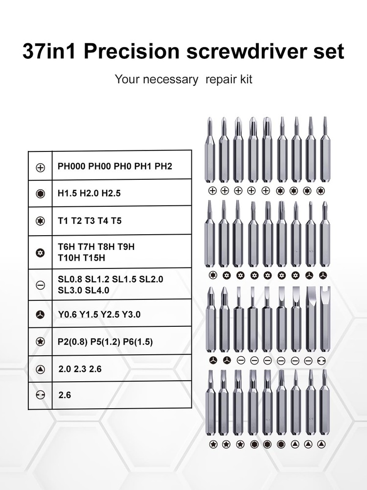 37in1 [Super Durable] Small Screwdriver Set, Magnetic Tiny Torx Screw Driver with T2 T3 T4 T5 T6 T7 T8 T9 T10 T15, Mini Repair Tool Kit for Watch, Computer, Xbox, PS3, PS4, PS5, More [Complete & Compact Torx Screwdrivers]: This is precision screwdriver set which include T2 T3 T4 T5 torx screwdriver and T6 T7 T8 T9 T10 T15 torx security screwdiver with a hollow in the tips. In addition, it also includes other common drill bit types such as Phillips, flat head and hexagonal.Widely used for Apple macbook, iphone, xbox controller, PS3, PS4, laptop, computer, game consoles, Mac mini, pocket knife, ring doorbell, dishwashers, shavers, routers and many electronic devices with torx screws. [S2 Steel Bits, Unmatched Quality] All bits are crafted from top - tier S2 steel. Compared to common steel, it's 30% harder and 40% more wear - resistant, featuring ultra - high hardness, toughness, and great wear - resistance. With advanced EDM cutting, bit accuracy error is under 0.01mm, doubling lifespan without harming screws. The strongly magnetized bits easily pick up and hold tiny screws, ensuring stable operation. [Ergonomic Excellence for Superior Use] The swivel cap, with precision bearings, spins smoothly, slashing torque and boosting efficiency by 30%. The handle, contoured to fit hands, has a frosted grip for comfort and control, handling 95% of screws. Made of tough all - metal, it's 50% more wear - resistant and 40% more corrosion - resistant than plastic, ensuring long - lasting performance. [Ingeniously Designed Magnetic Storage Case] This compact case, crafted from high - strength plastic, endures up to 800N of pressure. Its press - lock safeguards your screwdriver set during storage and transport. The case surface has clear bit - tip markings, like a tool map, for quick bit finding. Its innovative magnetic lining, with 15N of adsorption force, firmly holds bits, preventing loss and keeping your tools tidy. [Exquisite Craftsmanship, Unrivaled Quality] We uphold an unwavering commitment to quality. Each screwdriver is crafted through multiple intricate processes. From the cutting and polishing of the tip to the assembly of the handle, every step adheres to the highest quality control standards. Our products feature high precision and a refined appearance. When you hold one in your hand, you're not just getting a tool, but a work of art that embodies exceptional quality.
