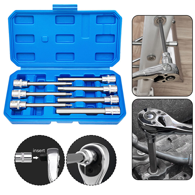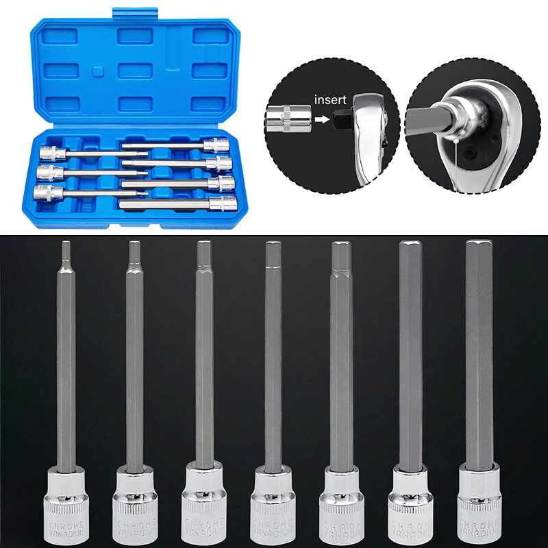 Extra Long Hex Bit Socket Set 7 Piece H3-H10 CR-V and S2 Material 3/8" Drive 110mm Length Set Contains 7 Size: H3,H4,H5,H6,H7,H8,H10,making it useful for a wide range of applications including computer or auto work that have hex fasteners. Hex bits are made from premium S2 steel and chrome vanadium for extra strength that can free stubborn screws. 110mm extra long bit is designed to fit in hard to reach areas and the chamfered ends enables a secure fit onto your wrench for a non-slip grip. All hex bits and sockets are engraved for easy identification while storing neatly in a snap close case for portability. Polished chrome finish allows for easy clean up and great resistance to rust. Package Include: 7Pcs Hex Bit Sockets Notes: 1. Please allow 0.5cm/0.20in error due to manual measurement. 2. Due to the difference between different monitors, the picture may not reflect the actual color of the item, hope you can understand. On 17-May-2025 at 19:36:21 BST, seller added the following information: