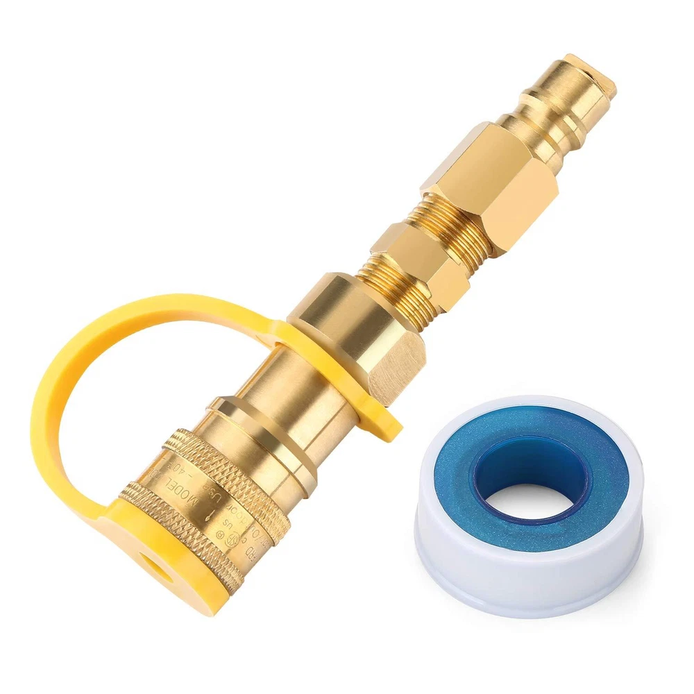 Material: 100% solid brass construction makes it corrosion resistant. The center hex nut of this quick connect adapter provides solid grip while installing, provide safe connection and leak prevention for you. Application: The propane quick connector adapter can be applied in low-pressure natural gas or propane systems, also suitable for other occasions, such as motorhomes, trailers, ships, gas grills, etc. Safety: Add a convenient connect / disconnect method ,automatically shuts off flow when you disconnect the hose. Easy to install: No tools required, the threads are tightly connected. We provide a thread seal tape. Bring convenience for you to insall it. Specification: 3/8" Male NPT Thread x 3/8" Female NPT Thread; ❗Attention: Do not suitable for 3/8'' flare thread hose, if you want to use this fitting on a 3/8'' female flare hose, you need to buy another fitting that can convert 3/8'' NPT Thread to 3/8'' Flare Thread.