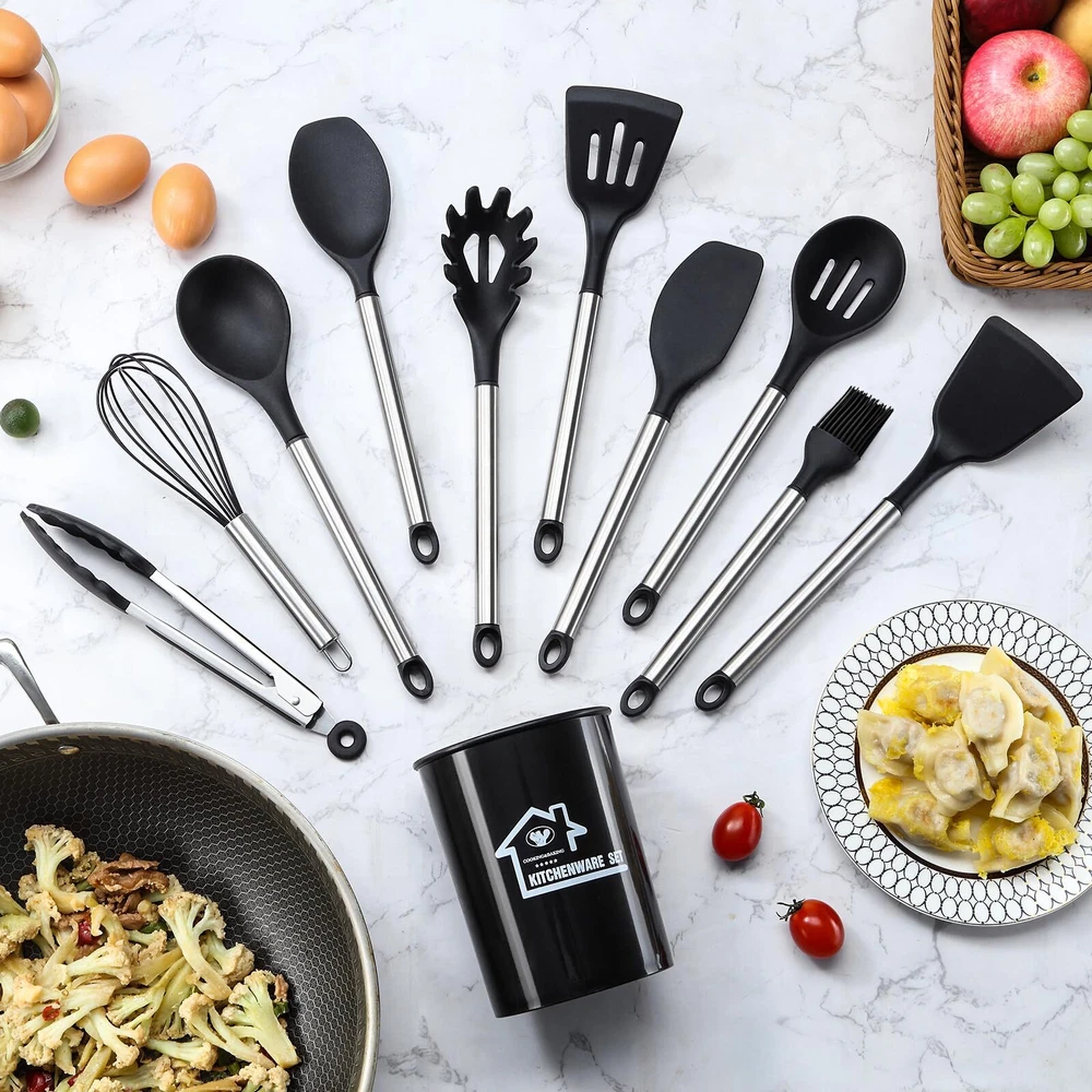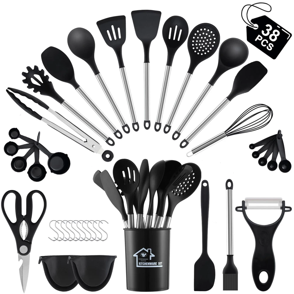 【38-Piece Silicone Kitchen Utensils Include】Hanging Hook x 10, Measuring Spoon x 5, Measuring Cup x 5, different sizes of Spatula x 3, Oven Mitt x 2, Solid Spatula x 1, Slotted Spatula x 1, Solid Spoon x 1, Slotted Spoon x 1, Soup Ladle x 1, Handled Strainer x 1, Spaghetti Spoon x 1, Brush x 1, Kitchen Tongs x 1, Egg Whisk x 1, Kitchen Scissors x 1, Peeler x 1, Utensils Holder x 1. A single purchase will put together whatever kitchen gadgets you need without the need for multiple purchases 【High Quality Food Grade Silicone】Our kitchen utensils set is made of healthy and non-toxic silicone, so there will be no odor and no chemical reaction with any food and drink when cooking. Using it will not cause any health burden. It is recommended to soak the cooking utensils set for 30 minutes when using for the first time, and then dry them well to eliminate the initial odor 【High Temperature Resistance】 our silicone spatula can withstand high temperatures up to 180°C and does not melt or deform easily. Compared to other materials, our kitchen set has a longer service life. The flexible material also reduces noise and does not scratch the bottom of the pan 【No Stain Hiding Design】 High quality stainless steel handle of our kitchen utensils set with holder is healthy and durable, rust-proof and corrosion-resistant. The craftsmanship is exquisite with no gaps, easy to clean. If you think it's a hassle, you can put our kitchenware in the dishwasher to clean it and free up your hands 【Kitchen Essenti】Our cooking utensils have both spoon set and spatula set, as well as kitchen shears, peeler and other kitchen tools, which can fully meet your cooking and baking needs. The handle is designed with thoughtful hooks for easy storage and drying. In addition, the silicone utensil set also comes 10 hanging hooks and 1 utensil holder, providing you with a neat and organized kitchen experience 【Rapid Response After-Sales Service】 It is our pursuit to satisfy every customer. If you have any questions about our kitchen utensil set, please feel free to contact our customer service, we will reply and deal with it as soon as possible