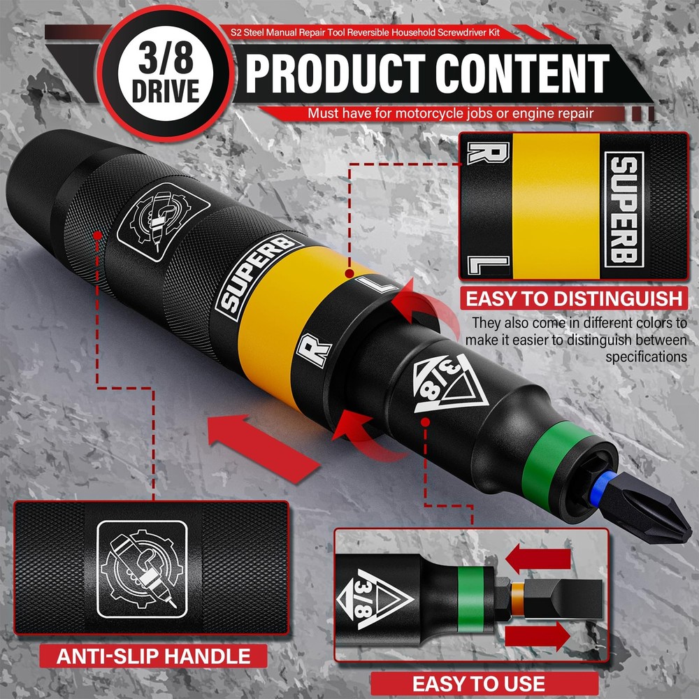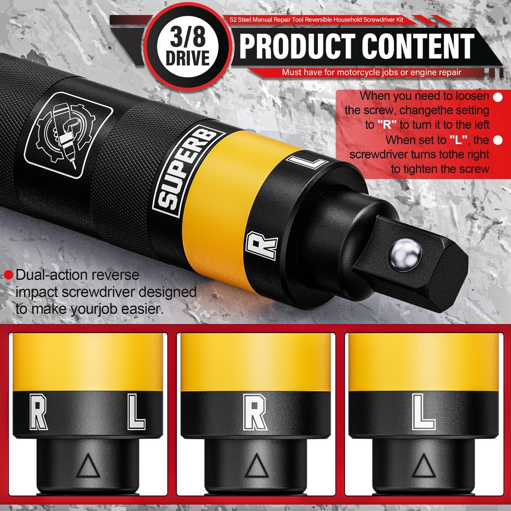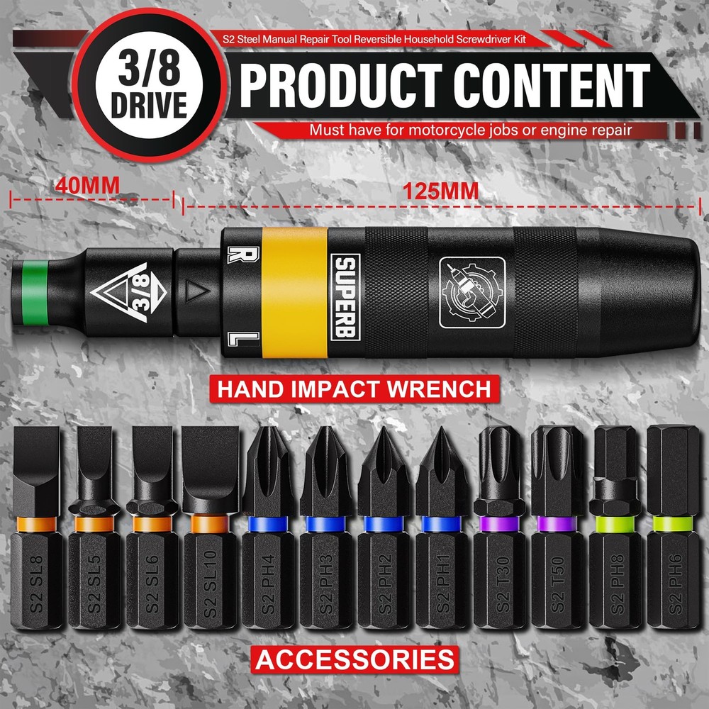 【Product content】 How to use: The head is aligned with the screw and directly strike the top of the tool with a hammer, the front batch head will automatically rotate in the opposite direction you have set the tool. The head can be disassembled, not only can be connected to the matching batch head, but also can be connected to the sleeve, which is versatile and easy to install. The drill has a non-slip knurled handle and features a precision ground tip for a precise fit. Widely used for automotive, motorcycle, door lock, seat component maintenance, and general household repairs. It's small and lightweight and doesn't require any air or power source, so you can use it in the garage, or take it to the road to quickly remove parts that have long been exposed to the elements. 【Accessories】 1 x Hand Impact Driver 4 x Slotted Bits (Orange): SL5 SL6 SL8 SL10 4 x Phillips Bits (Blue): PH1 PH2 PH3 PH4 2 x Hex Bits (Yellow): H6 H8 2 x Torx Bits (Purple): T30 T50 3/8" Hand Impact Driver is made of chromium-vanadium steel, which is durable, impact-resistant, wear-resistant and durable. Impact bit has a comfortable handle with non-slip knurled grip We used permanent laser etching size and made color print for different styles of S2 steel bits, which are clear and recognisable, and can be quickly recognised at work, improve efficiency Dual-action reverse impact screwdriver tool allows you to adjust towards the right to tighten screws or towards the left to loosen a screw; Single letter engravings, “L” and “R”, on handle ensure easy identification Impact screwdriver function is used to tighten or loosen frozen/rusted screws, nuts or bolts. Suitable for car repair, woodworking and general appliance repair Package include: Our range includes four different drill sizes. 4 x slotted bits (orange): SL5 SL6 SL8 SL10; 4 x Phillips bits (blue): PH1 PH2 PH3 PH4; 2 x hexagon bits (yellow): H6 H8; 2 x Torx bits (purple): T30 T50, which can meet various needs that are usually required, whether it is car repair or home repair