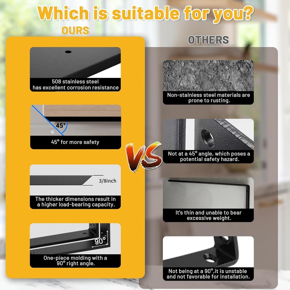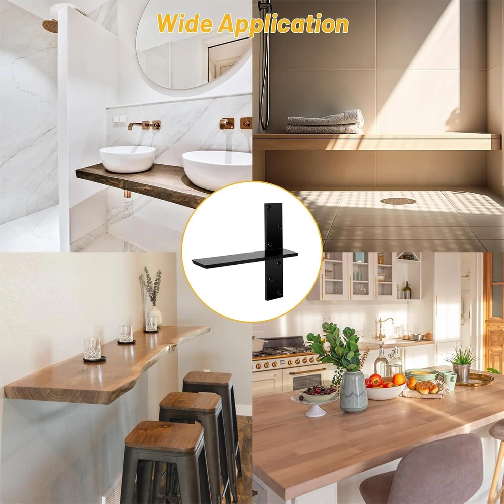 ✨ Key Features / Características Principales Heavy-Duty 200lb Steel Support / Soporte de Acero de Alta Resistencia (200 lb) 💪 Constructed from 3/8-inch thick dual-welded steel brackets , supporting up to 200 lb per pair . Features 6 reinforced screw holes , suitable for granite countertops, floating shelves, shower benches, and bathroom vanities . The concealed T-shape design delivers strong, stable, heavy-duty support while remaining hidden. Fabricados con acero soldado doble de 3/8 pulgadas , con capacidad de hasta 200 lb por par . Incluyen 6 orificios reforzados , ideales para encimeras de granito, estantes flotantes, bancos de ducha y muebles de baño . El diseño en forma de T oculta proporciona soporte sólido y estable sin comprometer la estética. Universal Wall Mount Brackets / Soportes Universales para Pared 📦 Bracket size: 2.5” W x 12” L , compatible con la mayoría de tipos de pared. Available in multi-pack options , suitable for countertop installations, concealed shelf supports, and shower bench mounting . Dimensiones del soporte: 2.5” de ancho x 12” de largo , compatible con la mayoría de paredes. Disponibles en paquetes múltiples , ideales para instalación de encimeras, soportes ocultos y bancos de ducha . Seamless Floating Effect / Efecto Flotante Continuo 👀 The T-shaped profile remains 90% concealed , creating the visual illusion of floating countertops or shelves . Perfect for modern kitchens, minimalist interiors, and concealed dishwasher installations . El perfil en T permanece oculto en un 90% , creando la ilusión visual de encimeras o estantes flotantes . Ideal para cocinas modernas, interiores minimalistas e instalaciones discretas de electrodomésticos . 3-Step Quick Installation / Instalación Rápida en 3 Pasos ⚙️ 1️⃣ Laser-level marking 2️⃣ Stud-mounted brackets 3️⃣ Silicone-secured surfaces Pre-drilled holes allow efficient and straightforward installation for shelves and granite countertops. 1️⃣ Marcado con nivel láser 2️⃣ Montaje en vigas 3️⃣ Superficies aseguradas con silicona Los orificios preperforados permiten una instalación sencilla y eficiente para estantes y encimeras de granito. Multi-Space Application / Aplicación en Múltiples Espacios 🏠 Perfect for: • Floating shower benches & bathroom vanities • Kitchen granite countertops • Workshop shelves & heavy-duty storage systems Perfectos para: • Bancos de ducha flotantes y muebles de baño • Encimeras de granito en cocina • Estantes de taller y sistemas de almacenamiento pesado 🚚 Shipping & Returns ✅ Warehouse in USA, Fast & Free Shipping ✅ 30-Day Free Return Policy 📌 About This Item / Sobre Este Artículo ENGLISH: These heavy-duty wall-mount brackets provide strong steel support with a concealed floating design. With high load capacity, universal sizing, and versatile applications, they are ideal for countertops, shelves, and structural installations requiring durability and a clean, modern appearance. ESPAÑOL: Estos soportes de pared de alta resistencia ofrecen un soporte sólido de acero con un diseño flotante oculto. Con alta capacidad de carga, tamaño universal y múltiples aplicaciones, son ideales para encimeras, estantes e instalaciones estructurales que requieren durabilidad y un acabado moderno.