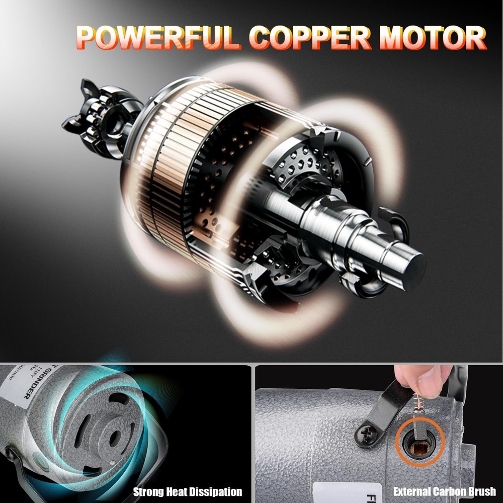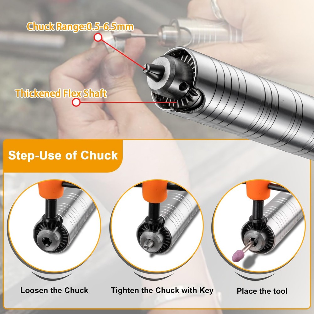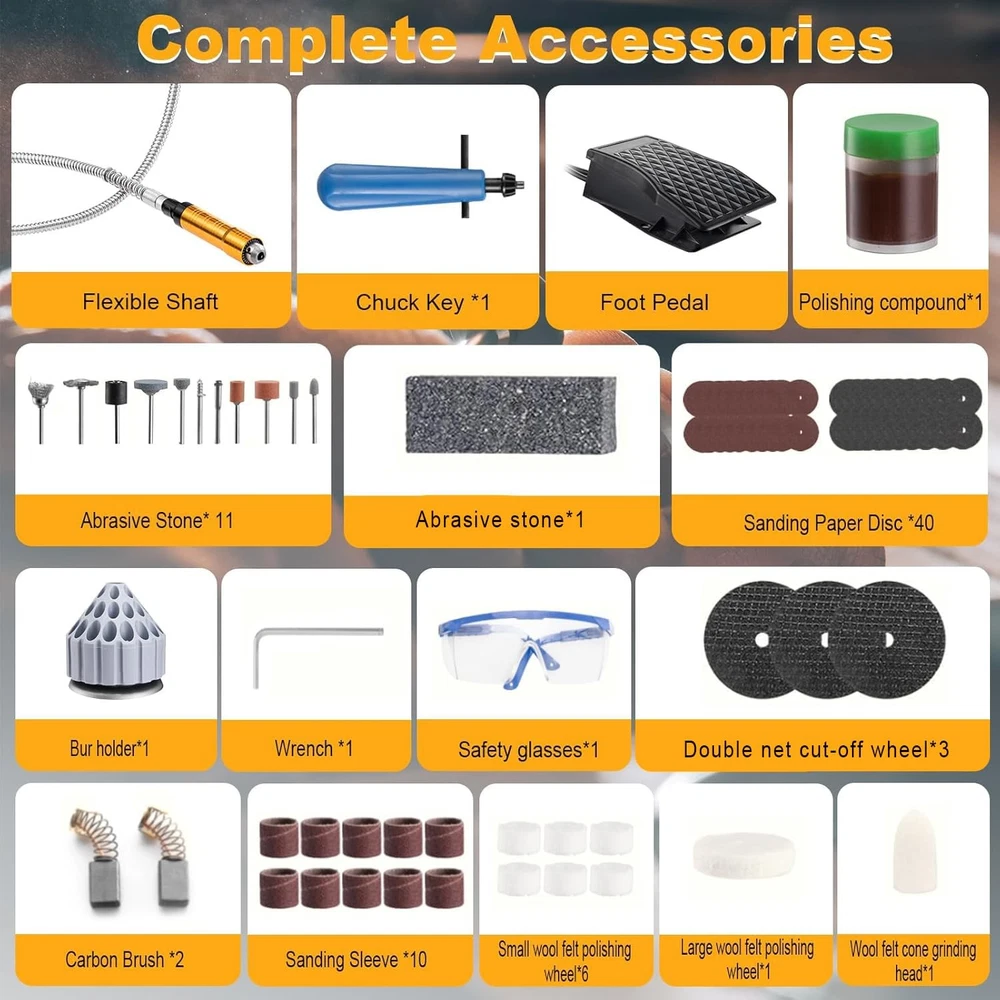 Flex Shaft Motors Safe and Smooth Controlled by Foot Pedal Used for Grinding, Carving, Drilling,Polishing, Engraving, Cleaning, 380W flex shaft motors comes complete with chuck style handpiece, electronic, foot control, extra pair of motor brushes, and a one year warrantly against manufacturing defects. 220/240V. Made in china. Features: 380W, ball-bearing, 20000rpm motor An electronic foot control with plastic housing for hands -free speed control A key-type chunk hand piece(holds shanks up to 6.5mm in diameter). Chuck range: 0.4-6.5mm. Package List Chuck Key x 1 Carbon Brush x 2 Grinding Head x 6 Sanding Bands x 10 Plastic Foot Padal x 1 Wool Plishing Wheel x 8 Grinding Stone x 1 Steel Wrench x 1 Double Mesh Disc x 3 Polishing Paste x 1 Resin Cutting Disc Set x 1 Sanding Disc Set x 1 Sanding Tape Connect Rod x 3 Flex Shaft Grinder x 1 【High-Speed Precision Motor】Delivers up to 30,000 RPM with a 380W motor for smooth, consistent power. Ideal for intricate detailing, fine polishing, or heavy-duty grinding. Built-in vents prevent overheating, ensuring stable and long-lasting performance. 【Flexible Shaft Convenience】Work with both hands freely! The overhead motor and long flexible shaft give you full control to maneuver in tight spaces, perfect for delicate work on jewelry, miniatures, and detailed carvings. 【All-in-One 83 Kit】Comes fully equipped with 83 accessories for cutting, drilling, sanding, and polishing—plus a rotating bur holder and safety goggles. Save time and stay organized while protecting your eyes from flying debris. 【Hands-Free Foot Pedal】Control speed with your foot for smoother work flow. The upgraded ABS pedal features stepless speed adjustment and a locking screw for setting constant speed—perfect for longer projects. 【Professional Multi-Use Tool】A true all-rounder for DIYers and pros. Whether you're working with metal, wood, stone, or jewelry, this tool handles polishing, engraving, grinding, and more—bringing precision to every project.