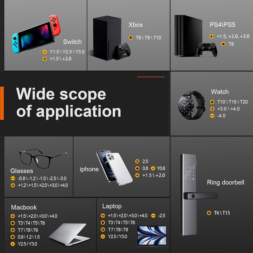 The screwdriver set is a really good helper for life and work. 【Precision screwdriver set】-- 38Pcs screwdriver set has 30 CRV screwdriver bits which are phillips PH000(+1.2) PH000(+1.5) PH00(+2.0) PH0(+3.0) PH1(+4.0), flathead -0.8 -1.2 -1.5 -2.5 -3.0, torx T1 T2 T3 T4 T5, torx security TR6 TR7 TR8 TR9 TR10 TR15 TR20, triwing Y000(Y0.6) Y00(Y1.5) Y0(Y2.5) Y1(Y3.0), pentalobe P2(0.8) P5(1.2) P6(1.5), MID 2.5, with a screwdriver handle, a double-ended spudger, a long spudger, a triangle spudger, Tweezers, a cleaning brush and a suction cup with SIM card thimble. 【Slip-resistant rotatable handle】-- All our screwdriver bits are made of high quality CR-V chrome vanadium steel. CR-V screwdriver bits do not rust easily and are not prone to be broken. The screwdriver handle is made of TPR and PP materials, with a special non-slip design, offering a sense of comfortable. The top of the handle is rotatable design which makes it more convenient to remove the screws; the handle head and the screw head has magnetic adsorption which can quickly replace the screws. 【Portable gadgets】-- The triangular spudger is more suitable for opening the screen of the mobile phone.The double-ended spudger is more suitable for opening the back cover of game devices. The long spudger can pry the internal parts of the device.The suction cup can open the screen, which is more convenient to repair the mobile phone.The SIM card thimble can be used to replace the SIM card of the mobile phone. The cleaning brush can clean the dust of the device.Tweezers can grip small parts. 【Wide scope of application】-- +1.5/2.0 P2 Y0.6 MID2.5 are used for iPhone7/8/X/XR/11/12/13. +1.2/1.5/2.0/3.0 T2/3/4/5 P2 are used for Samsung/Huawei/Xiaomi and other phones. +1.5/2.0/3.0 T3/4/5/6/9 are used for iPad/Mini/Air/Pro. +1.2/1.5/2.0/3.0/4.0 T2/3/4/5 -2.5 are used for Huawei/Honor and other tablets. P2/5/6 +1.5/2.0/3.0/4.0 T3/4/5/6/7/8/9 Y2.5/3.0 are used for Macbook/Air/Pro. +1.5/2.0/3.0 T5 are for Kindle/Kindle Fire. T6/15 are used Ring Video Doorbell/ Video Doorbell 2/Pro/Elite. 【Wide scope of application】-- T8 +1.5/2.0/3.0 are used for PS3/PS4/PS5 controllers and consoles. T6/8/10 are used for Xbox 360/Xbox One/Xbox Series controllers and consoles. Y1.5/2.5/3.0 +1.5/2.0 are used for Switch/NS-Lite/Joy-Con/Wii/Game Boy Advance. T3/8 are used for Fitbit wristband/folding knife. +1.2/1.5/2.0/3.0/4.0 T3/4/5/6/7/8/9 Y2.5/3.0 -2.5 are used for Microsoft/Acer/Dell and other laptops. +1.2/1.5/2.0/3.0/4.0 -0.8/1.2/1.5/2.5/3.0 are used for Desktop Computer/Watch/Glasses/Toy.