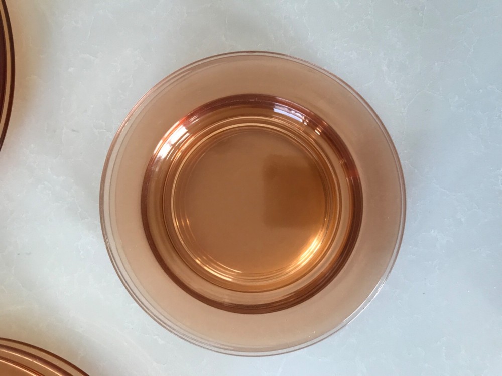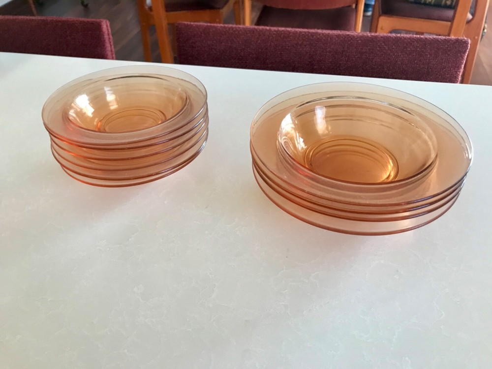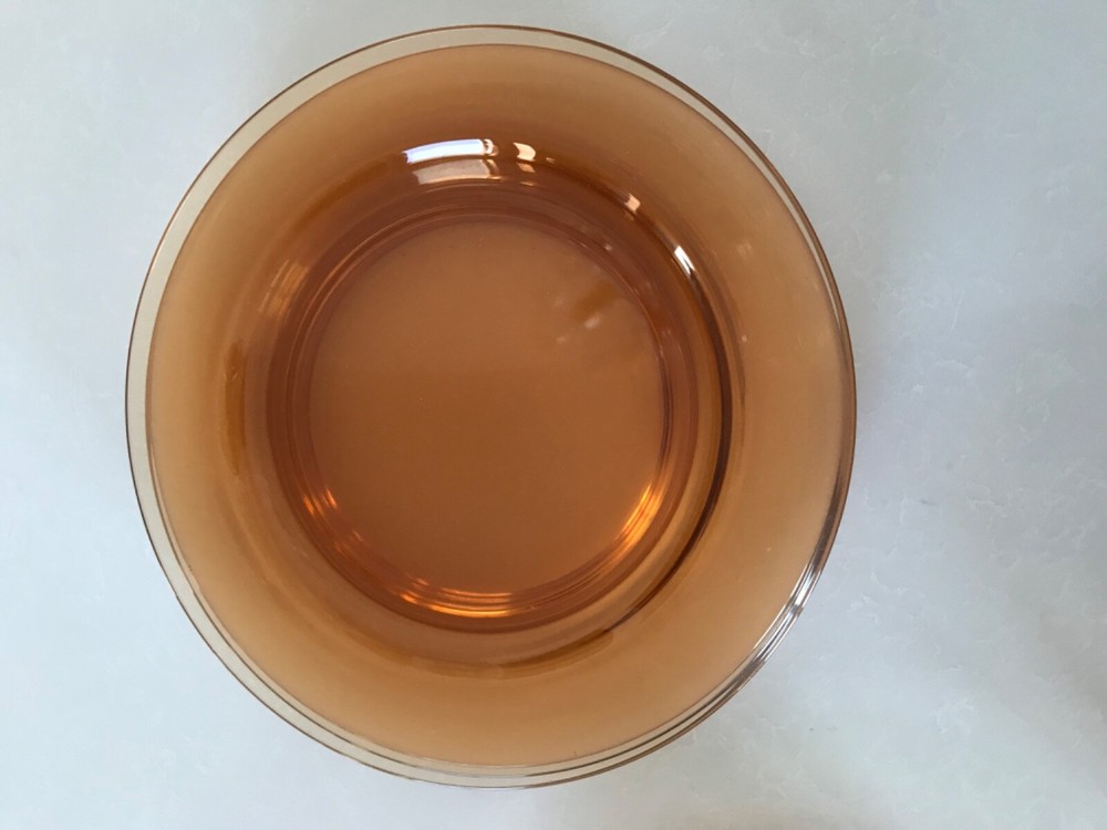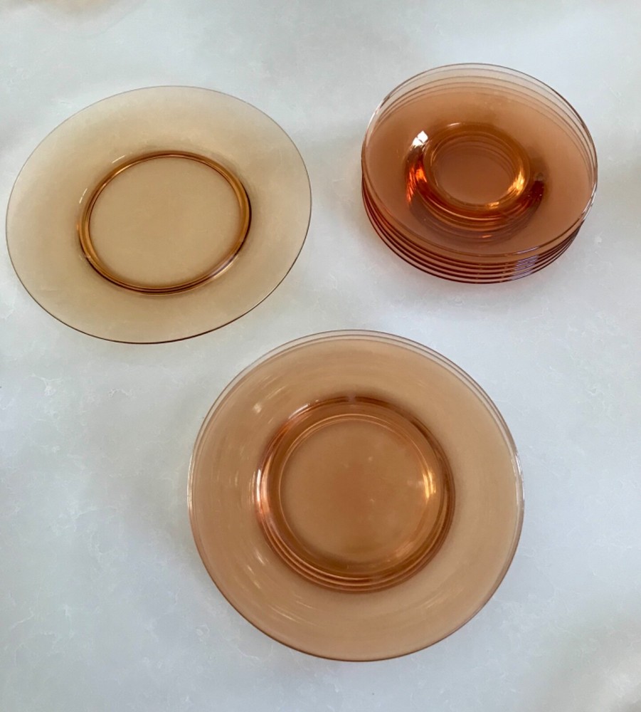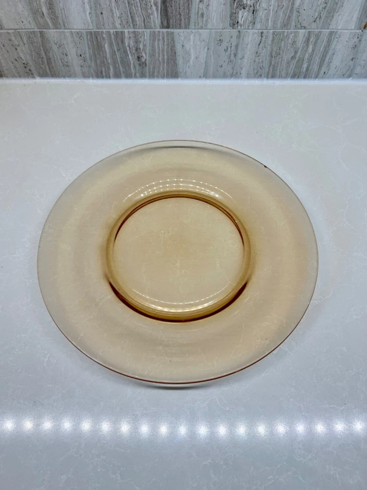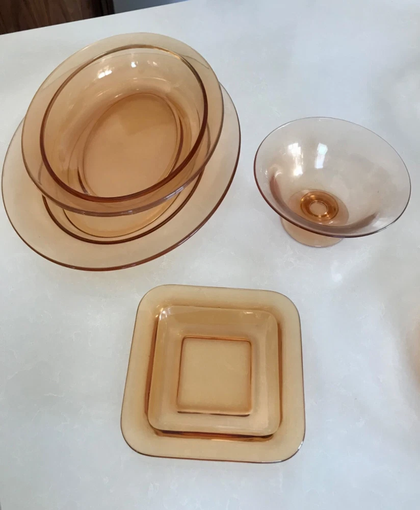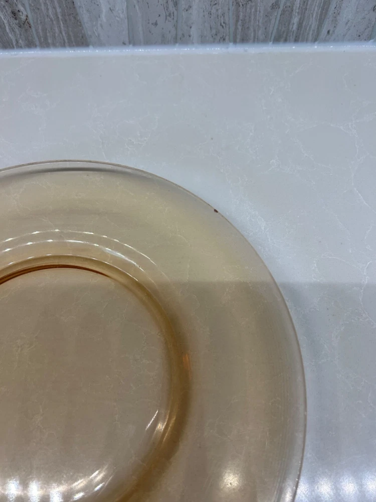 Beautiful 30 piece set of 1930s Depression Era amber glass dishwater. 4-6 place settings with several serving pieces -- extremely rare set! 4 pieces have barely noticeable chips; 3 serving pieces (oval casserole, 1 dinner plate and 1 dessert plate) have minute chips on the underside, so that one can feel them, but difficult to see. The square candy dish has 2 small chips on one inside edge. Please refer to photos. Set contains: 4 dinner plates - 9-1/2" diameter 4 salad plates - 8-1/2" diameter 4 roll plates - 6" diameter 4 dessert plates - 7-1/2" diameter 4 soup bowls - 6-1/2" diameter 6 dessert bowl plates or saucers - 6-1/4" diameter 6 dessert bowls - 5-1/2" diameter 1 oval serving plate - 12-1/4" x 9-1/4" 1 oval casserole - 10-1/4" 7-3/4" 1 medium serving plate - 8-1/2" 2 octagonal serving plates - 8" wide 1 footed nut bowl - 5-1/2" diameter x 3" tall 1 candy dish - 5-1/2" square Feel free to message with questions. Will ship via UPS Ground Saver unless alternate service selected.