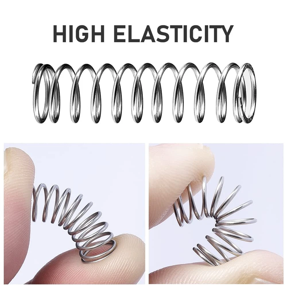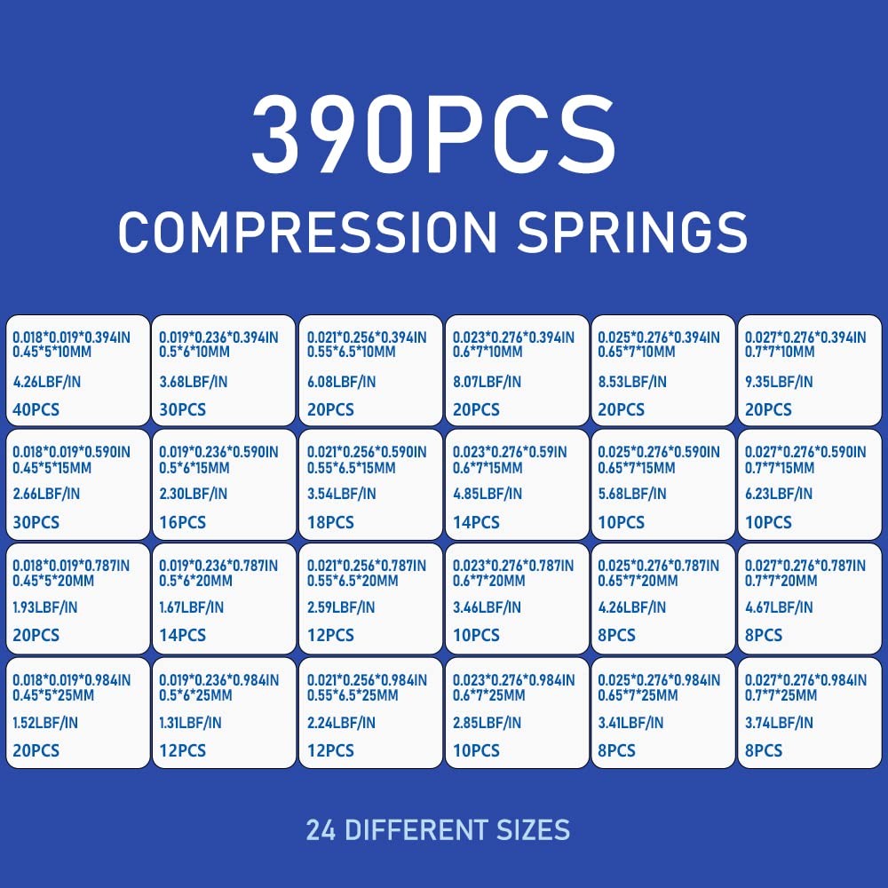 Compression Springs Assortment Kit, 390 Pcs 24 Different Sizes Stainless Steel Springs, Spring Assortment for Shop and Home Repairs Anti-Rust Material: stainless steel 304 wire, will not rust in humid environment, has strong anti-oxidation, anti-acid, anti-corrosion ability. Easy To Storage and Use: All compression springs are neatly packaged in plastic storage boxes, and size labels can be used to identify spring size. Versatile: 24 sizes of springs to choose from for home repairs. We hope this spring combination kit is suitable for most repair items such as doors, curtains, cars, bicycles, pianos, scissors, electrical equipment, repair tools, umbrellas, antique tape recorders, repair toys, pliers, etc. Reliable Quality: professional design, rigorous calculation, precision manufacturing, and effective testing. Size: [A×B×C] A is the wire diameter, B is the outer diameter, C is the free length, the first category is 0.018*0.0197*0.394/0.590/0.787/0.984IN, the second category is 0.0197*0.0236*0.394/0.590/0.787/0.984IN, the third type is 0.0217*0.256*0.394/0.590/0.787/0.984IN, the fourth type is 0.0236*0.276*0.394/0.590/0.787/0.984IN, the fifth type is 0.0236*0.276*0.394/0.590/0.787/0.984IN 0.276*0.394/0.590/0.787/0.984IN, six types are 0.0276*0.276*0.394/0.590/0.787/0.984IN