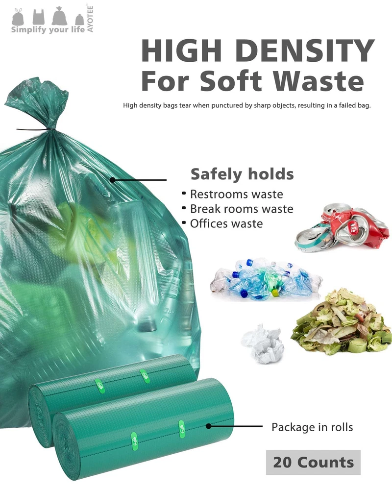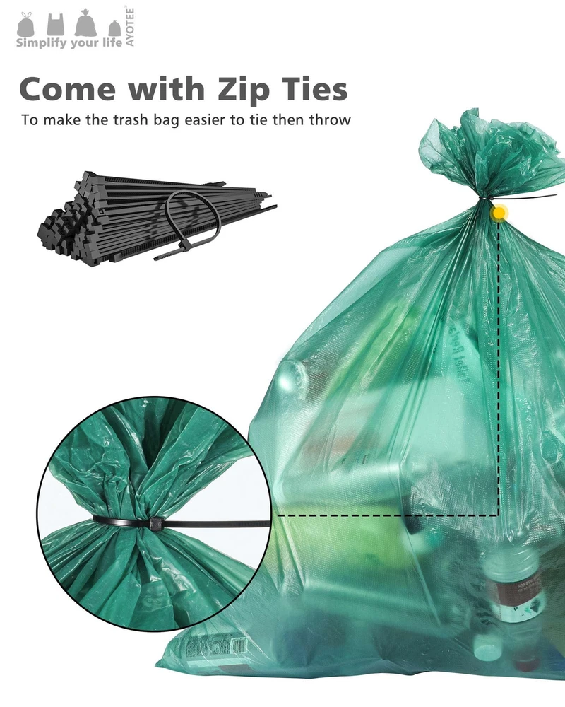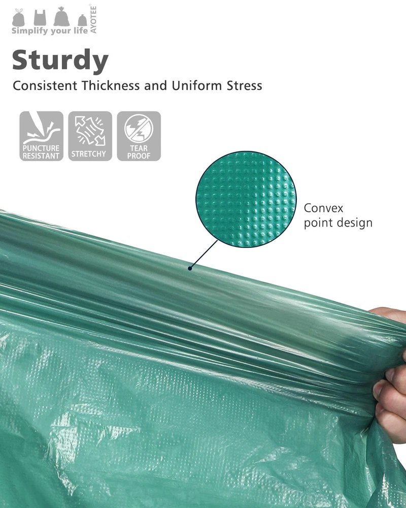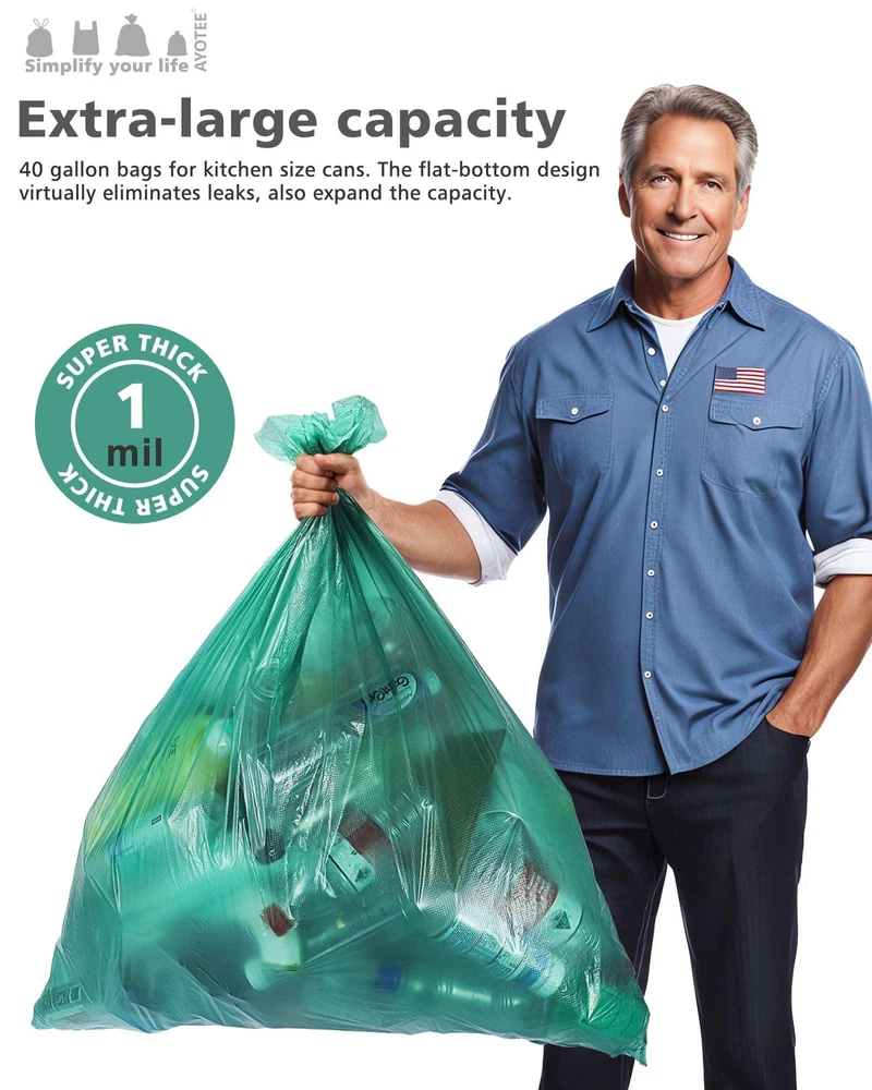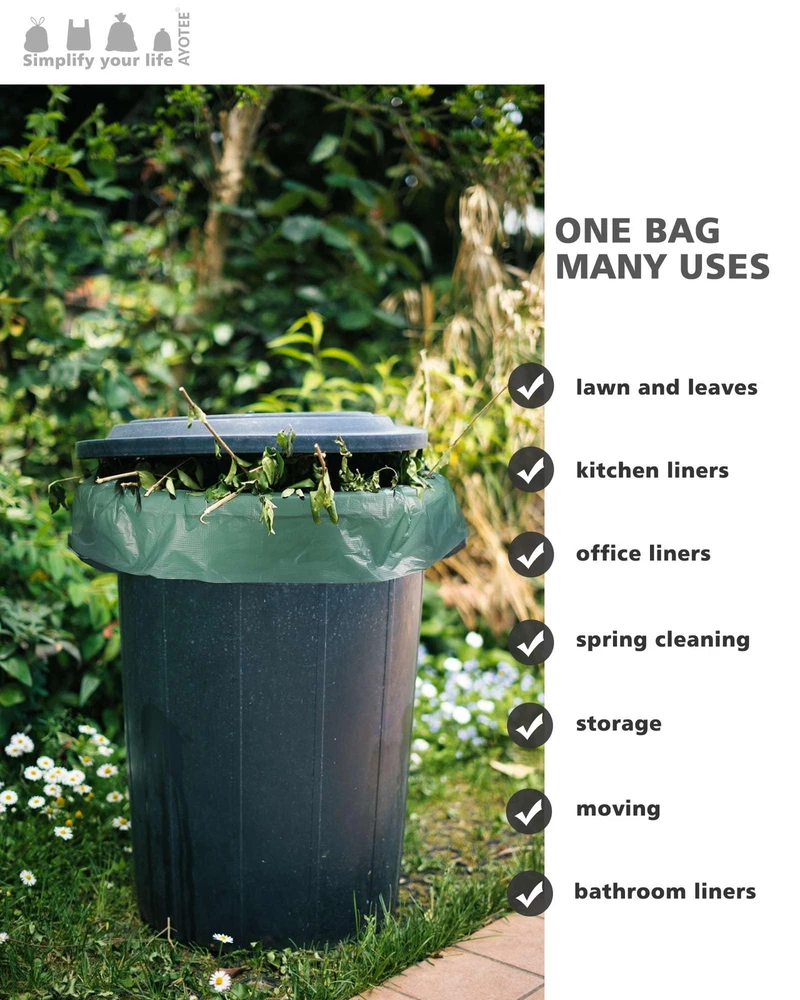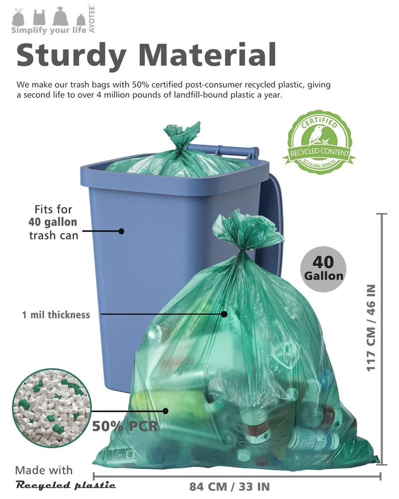 ECO-FRIENDLY CHOICE: Each high-density plastic extra large garbage bags is made from 50% post-consumer recycled (PCR) plastic, and the outdoor trash bags are certified to be recyclable. We know how harmful plastic pollution is to the planet, and we're committed to reducing the amount of plastic waste produced by recycling. STURDY AND PUNCH-PROOF: Our 1 mil thick outdoor trash bags are thick and sturdy, easily handling all kinds of yard waste. The outer bump design enhances the sturdiness of the big garbage bags. Lawn and leaf trash bags to easily handle heavy items such as leaves, garden clippings, and branches, and never have to worry about punctures, tears, or leaks. Suitable For All Kinds Of Garbage Cans: Our outdoor garbage bags measure 33*46 inches, 20 packs , perfect fit for all kinds of garbage cans such as 39, 40, 42 gallon rectangular, round and so on. Regardless of the shape of your garbage can, our yard trash bags can be easily adapted to make your garbage disposal more convenient and efficient! GREEN & ODORLESS: Our garden trash bags feature a green, odorless design and a clean, sophisticated look that adds a touch of fresh color to your life. Each lawn leaf bags is also equipped with an extra tie, not only solves the trouble of easy to break the drawstring, but also can effectively control the odor, so that your living environment is more refreshing and pleasant. Choose us to make your garbage disposal more convenient and enjoy a comfortable life! MULTIFUNCTIONAL: Whether it's kitchen garbage, yard leaves, or lawn mowing, our 39 gallon garbage bags can handle it with ease. Big trash bags with large capacity size and sturdy thickness,40 gal trash bags will make your garbage disposal efficient and convenient. Choose us to make garbage disposal no longer a problem and enjoy a clean and tidy environment of all kinds!