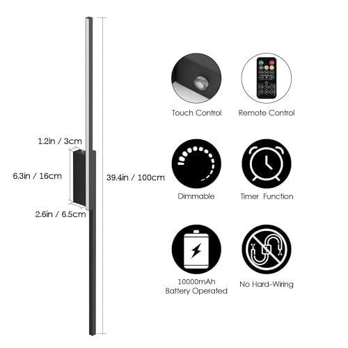 Return Policy Fast Delivery Trusted seller 39.4inch Black Battery Operated Wall Sconce Set of 2, Rechargeable Wall Sconce Lighting Dimmable Wireless Wall Lights for Living Room,Bedroom Product Description Battery Operated Wall Lights:This wireless wall light built-in 10000mAh battery provides long-lasting illumination. When the light is fully charged, it can work for up to 18 hours or more. (It depends on which brightness is used.) Charging time is 5-6 hours. The wireless design makes your space more neat and clean.(Charging cable included) 3CCT Dimmable and Timer: The battery operated wall sconce comes in 3 color temperatures: 3000K warm light, 4000K natural light, and 6000K cool light. This wireless wall lights can be steplessly dimmed and timed via remote control, providing convenience and energy savings for daily use, ensuring that your wireless wall light is only on when you need it. Remote Control and Touch Control:You can change the color temperature, adjust the brightness, and turn on the timer function via remote control. With the touch switch on the light, long press can adjust the brightness. Easy Installation:This battery wall light does not require a professional electrician to install. All you need to do is screw the backplate in place. The light is magnetically fixed to the backplate, which makes it easy to remove the light for charging. Wide Application :This rechargeable wall light is suitable for your any space, such as living room, bedroom, dining room, staircase, hallway and so on. Create unique and cozy lighting for your space. Shipping Returns Payment Shipping Shipping is FREE to all addresses other than APO/PO boxes in the lower 48 states. All our stock ships from US-based warehouses. Shipped via USPS or UPS (depending on location and package weight) Unless stated otherwise, all orders will ship within 24-72 hours of your payment being processed. Check our feedback to see the great reviews of FAST shipping we offer. Returns Seller does not accept returns Payment We currently accept payment via eBay managed payments only. Once payment is cleared, we will dispatch your shipment within 1-3 business days. Please refer to the "Shipping" tab for more information regarding shipping speed to your destination.